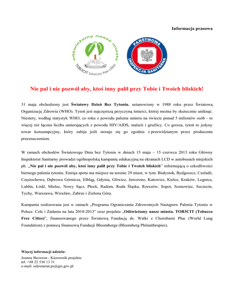 Informacja prasowa Nie pal i nie pozwól aby, ktoś inny palił przy Tobie i Twoich bliskich! 31 maja obchodzony jest Światowy Dzień Bez Tytoniu, ustanowiony w 1988 roku przez Światową Organizację Zdrowia (WHO). Tytoń jest najczęstszą przyczyną śmierci, której można by skutecznie uniknąć. Niestety, według statystyk WHO, co roku z powodu palenia umiera na świecie ponad 5 milionów osób - to więcej niż łączna liczba umierających z powodu HIV/AIDS, malarii i gruźlicy. Co gorsza, tytoń to jedyny towar konsumpcyjny, który zabija jeśli stosuje się go zgodnie z przewidzianym przez producenta przeznaczeniem. W ramach obchodów Światowego Dnia bez Tytoniu w dniach 15 maja – 15 czerwca 2013 roku Główny Inspektorat Sanitarny prowadzi ogólnopolską kampanię edukacyjną na ekranach LCD w autobusach miejskich ph. „Nie pal i nie pozwól aby, ktoś inny palił przy Tobie i Twoich bliskich” informującą o szkodliwości biernego palenia tytoniu. Emisja spotu ma miejsce na terenie 29 miast, w tym: Białystok, Bydgoszcz, Czeladź, Częstochowa, Dąbrowa Górnicza, Elbląg, Gdynia, Gliwice, Jaworzno, Katowice, Kielce, Kraków, Legnica, Lublin, Łódź, Mielec, Nowy Sącz, Płock, Radom, Ruda Śląska, Rzeszów, Sopot, Sosnowiec, Szczecin, Tychy, Warszawa, Wrocław, Zabrze i Zielona Góra. Kampania realizowana jest w ramach „Programu Ograniczania Zdrowotnych Następstw Palenia Tytoniu w Polsce. Cele i Zadania na lata 2010-2013” oraz projektu „Odświeżamy nasze miasta. TOB3CIT (Tobacco Free Cities)”, finansowanego przez Światową Fundację ds. Walki z Chorobami Płuc (World Lung Foundation) z pomocą finansową Fundacji Bloomberga (Bloomberg Philanthropies). Więcej informacji udziela: Joanna Skowron - Kierownik projektu tel. +48 22 536 13 31 e-mail: [email protected]