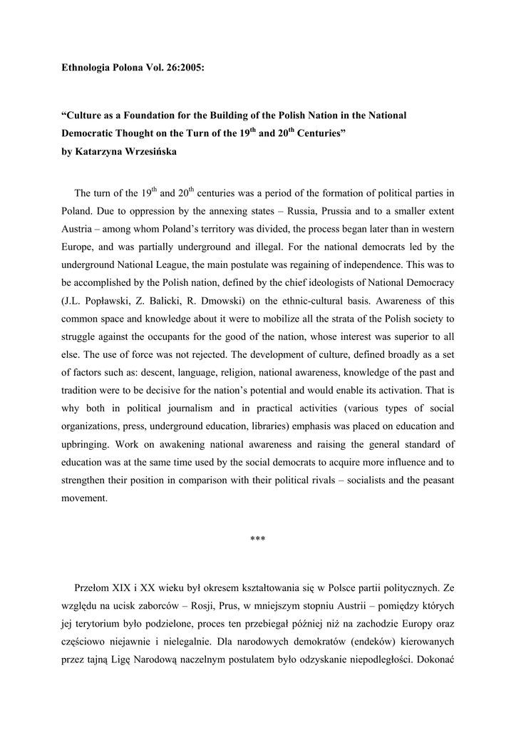 Ethnologia Polona Vol. 26:2005: “Culture as a Foundation for the Building of the Polish Nation in the National Democratic Thought on the Turn of the 19th and 20th Centuries” by Katarzyna Wrzesińska The turn of the 19th and 20th centuries was a period of the formation of political parties in Poland. Due to oppression by the annexing states – Russia, Prussia and to a smaller extent Austria – among whom Poland’s territory was divided, the process began later than in western Europe, and was partially underground and illegal. For the national democrats led by the underground National League, the main postulate was regaining of independence. This was to be accomplished by the Polish nation, defined by the chief ideologists of National Democracy (J.L. Popławski, Z. Balicki, R. Dmowski) on the ethnic-cultural basis. Awareness of this common space and knowledge about it were to mobilize all the strata of the Polish society to struggle against the occupants for the good of the nation, whose interest was superior to all else. The use of force was not rejected. The development of culture, defined broadly as a set of factors such as: descent, language, religion, national awareness, knowledge of the past and tradition were to be decisive for the nation’s potential and would enable its activation. That is why both in political journalism and in practical activities (various types of social organizations, press, underground education, libraries) emphasis was placed on education and upbringing. Work on awakening national awareness and raising the general standard of education was at the same time used by the social democrats to acquire more influence and to strengthen their position in comparison with their political rivals – socialists and the peasant movement. *** Przełom XIX i XX wieku był okresem kształtowania się w Polsce partii politycznych. Ze względu na ucisk zaborców – Rosji, Prus, w mniejszym stopniu Austrii – pomiędzy których jej terytorium było podzielone, proces ten przebiegał później niż na zachodzie Europy oraz częściowo niejawnie i nielegalnie. Dla narodowych demokratów (endeków) kierowanych przez tajną Ligę Narodową naczelnym postulatem było odzyskanie niepodległości. Dokonać miał tego naród polski, definiowany przez głównych ideologów Narodowej Demokracji (J.L. Popławskiego, Z. Balickiego, R. Dmowskiego) na płaszczyźnie etniczno-kulturowej. Świadomość tej wspólnej przestrzeni i wiedza o niej miały zmobilizować wszystkie warstwy społeczeństwa polskiego do walki z zaborcami dla dobra narodu, którego interes stawiano na pierwszym miejscu. Nie wyrzekano się użycia siły. Rozwój kultury, którą określano szeroko jako zespół takich czynników jak: pochodzenie, język, religia, świadomość narodowa, wiedza o przeszłości, tradycja, miał decydować o potencjale narodu oraz umożliwić jego aktywizację. Dlatego też zarówno w publicystyce politycznej oraz w praktycznym działaniu (różnego rodzaju organizacje społeczne, prasa, tajne nauczanie, biblioteki) stawiano na oświatę i wychowanie. Prace nad rozbudzeniem świadomości narodowej i podniesieniem poziomu ogólnego wykształcenia narodowi demokraci wykorzystywali jednocześnie do zdobycia szerszych wpływów i umocnienia swej pozycji wobec rywali politycznych – socjalistów i ludowców. Author’s address: Katarzyna Wrzesińska, Ph.D. Institute of Slav Studies Polish Academy of Science Center for the Studies of Nationalities Stary Rynek 78/79 61-772 Poznań, POLAND