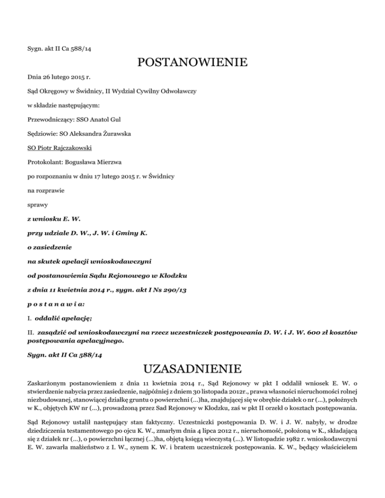 Sygn. akt II Ca 588/14 POSTANOWIENIE Dnia 26 lutego 2015 r. Sąd Okręgowy w Świdnicy, II Wydział Cywilny Odwoławczy w składzie następującym: Przewodniczący: SSO Anatol Gul Sędziowie: SO Aleksandra Żurawska SO Piotr Rajczakowski Protokolant: Bogusława Mierzwa po rozpoznaniu w dniu 17 lutego 2015 r. w Świdnicy na rozprawie sprawy z wniosku E. W. przy udziale D. W., J. W. i Gminy K. o zasiedzenie na skutek apelacji wnioskodawczyni od postanowienia Sądu Rejonowego w Kłodzku z dnia 11 kwietnia 2014 r., sygn. akt I Ns 290/13 p o s t a n a w i a: I. oddalić apelację; II. zasądzić od wnioskodawczyni na rzecz uczestniczek postępowania D. W. i J. W. 600 zł kosztów postępowania apelacyjnego. Sygn. akt II Ca 588/14 UZASADNIENIE Zaskarżonym postanowieniem z dnia 11 kwietnia 2014 r., Sąd Rejonowy w pkt I oddalił wniosek E. W. o stwierdzenie nabycia przez zasiedzenie, najpóźniej z dniem 30 listopada 2012r., prawa własności nieruchomości rolnej niezbudowanej, stanowiącej działkę gruntu o powierzchni (...)ha, znajdującej się w obrębie działek o nr (...), położnych w K., objętych KW nr (...), prowadzoną przez Sad Rejonowy w Kłodzku, zaś w pkt II orzekł o kosztach postępowania. Sąd Rejonowy ustalił następujący stan faktyczny. Uczestniczki postępowania D. W. i J. W. nabyły, w drodze dziedziczenia testamentowego po ojcu K. W., zmarłym dnia 4 lipca 2012 r., nieruchomość, położoną w K., składającą się z działek nr (...), o powierzchni łącznej (...)ha, objętą księgą wieczystą (...). W listopadzie 1982 r. wnioskodawczyni E. W. zawarła małżeństwo z I. W., synem K. W. i bratem uczestniczek postępowania. K. W., będący właścicielem wyżej opisanej nieruchomości, wydał synowi I. i jego żonie – wnioskodawczyni część nieruchomości, znajdującej się w obrębie działki nr (...), przylegającą do sąsiedniej nieruchomości, na terenie której mieszkali wnioskodawczyni z mężem, położonej w K. (...), a następnie również część działki nr (...), stanowiące przedłużenie pasa gruntu w kierunku działki nr (...), stanowiącej własność F. L. - do używania i pobierania pożytków. W połowie lat 90-tych XX w., na gruncie tym wnioskodawczyni wraz z mężem posadzili drzewa owocowe, które częściowo zostały zniszczone przez zwierzynę, drzewa iglaste - na terenie działki nr (...), gdzie też postawili fragment ogrodzenia. Na gruncie tym wnioskodawczyni wraz z mężem wypasali owce, krowę, później prowadzili hodowlę drobiu, uprawy rolne i ogrodowe, kosili trawę. Mąż wnioskodawczyni I. W. zmarł w dniu 17 lutego 2012 r. Pomiędzy działkami nr (...) na spornym gruncie przebiega na mapie droga gminna działka nr (...). Droga ta została zaorana około 20 – 25 lat temu, obecnie nie funkcjonuje w terenie. Zamiast niej, wzdłuż granicy działki nr (...) i działki nr (...), stanowiącej własność F. L., przebiega faktyczna droga polna, urządzona na terenie działki nr (...). Rozważając tak ustalony stan faktyczny Sąd Rejonowy uznał wniosek za bezzasadny. Wskazując na przesłanki określone w art. 172 § 1 i 2 kc w zw. z art. 336 kc oraz mając na uwadze zebrany w sprawie materiał, w ocenie Sądu, wnioskodawczyni nie udowodniła swoich twierdzeń, a przeprowadzone dowody nie dały podstaw do przyjęcia, że w sprawie zostały spełnione przesłanki nabycia własności nieruchomości przez zasiedzenie. Oceniając zeznania złożone przez świadków w sprawie, Sąd zważył, że świadek B. J., jako bliska przyjaciółka wnioskodawczyni, miała interes w zeznawaniu na jej korzyść, a jej zeznania wykazywały znamiona zeznań uzgodnionych. Z jej relacji wynikało, że wnioskodawczyni wraz z mężem „dostali” od teścia ziemię po prawej stronie domu, w którym mieszkali, zaraz po zawarciu małżeństwa i traktowali ją jak własną, co świadek wiedziała z relacji męża wnioskodawczyni, czego obecnie nie można już zweryfikować, z uwagi na śmierć zarówno I. W., jak i jego ojca K. W.. Co do szczegółów, świadek zasłaniała się niewiedzą lub niepamięcią, np. czy wnioskodawczyni wraz z mężem dostali jakieś inne grunty od ojca, kiedy wnioskodawczyni zawarła małżeństwo, na temat pochodzenia działki, na której I. W. zaczął budować dom oraz co do czasu i zasięgu władania sporną nieruchomością przez wnioskodawczynię. Z tych zatem względów, Sąd Rejonowy ocenił jej zeznania jako niewiarygodne, za wyjątkiem tej części, która dotyczyła sposobu używania gruntu przez wnioskodawczynię. Okoliczność, że wnioskodawczyni wraz z mężem wypasali tam owce, bydło, prowadzili hodowlę drobiu, uprawy rolne, kosili trawę, wynikała ponadto z zeznań F. L., S. Ł., C. S., A. S., jak również uczestniczek. Świadek F. L. zeznał, że wnioskodawczyni wraz z mężem korzystali ze spornego gruntu, przy czym nie miał pewności co do zasięgu tego korzystania, jak również nie miał wiedzy, od kiedy I. W. uprawiał ten grunt. Twierdząc, że wraz z wnioskodawczynią korzystali z gruntu od zawarcia małżeństwa, nie pamiętał zarazem, kiedy to było. Niezależnie od tego, sama okoliczność, wynikająca z zeznań świadka, że wnioskodawczyni wraz z mężem korzystali (od bardzo dawna) ze spornego gruntu, nie świadczyła, w ocenie Sądu, o spełnieniu przesłanki samoistności posiadania, prowadzącego do zasiedzenia. Za dowód na tą okoliczność nie zostały również uznane zeznania świadka S. Ł., który stwierdził wprawdzie, że wnioskodawczyni wraz z mężem, od czasu zawarcia małżeństwa, korzystali z gruntu obok domu, gdzie jest sad, kurnik i gołębnik, jednakże sam ten fakt również nie dowodził samoistności posiadania. Świadek zeznał, że wszystko, co widział, wskazywało na to, że właścicielem tego gruntu jest wnioskodawczyni, bo nikt inny z tego nie korzystał. Nie przyjmując treści zeznań jako wystarczającej do przyjęcia samoistności posiadania, Sąd oc