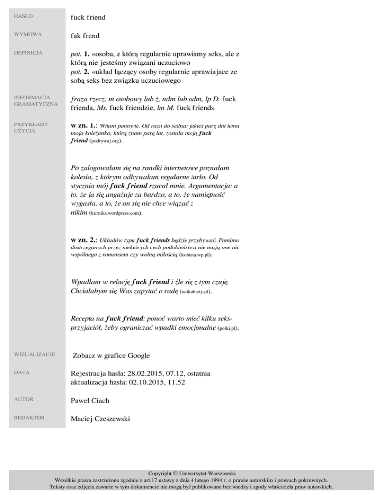 HASŁO fuck friend WYMOWA fak frend DEFINICJA pot. 1. «osoba, z którą regularnie uprawiamy seks, ale z którą nie jesteśmy związani uczuciowo» pot. 2. «układ łączący osoby regularnie uprawiajace ze sobą seks bez związku uczuciowego» INFORMACJA GRAMATYCZNA fraza rzecz. m osobowy lub ż, ndm lub odm, lp D. fuck frienda, Ms. fuck friendzie, lm M. fuck friends PRZYKŁADY UŻYCIA w zn. 1.: Witam panowie. Od razu do sedna: jakieś parę dni temu moja koleżanka, którą znam parę lat, została moją fuck friend (podrywaj.org). Po zalogowałam się na randki internetowe poznałam kolesia, z którym odbywałam regularne tarło. Od stycznia mój fuck friend rzucał mnie. Argumentacja: a to, że ja się angażuje za bardzo, a to, że namiętność wygasła, a to, że on się nie chce wiązać z nikim (kurniks.wordpress.com). w zn. 2.: Układów typu fuck friends będzie przybywać. Pomimo dostrzeganych przez niektórych cech podobieństwa nie mają one nic wspólnego z romansem czy wolną miłością (kobieta.wp.pl). Wpadłam w relację fuck friend i źle się z tym czuję. Chciałabym się Was zapytać o radę (netkobiety.pl). Recepta na fuck friend: ponoć warto mieć kilku seksprzyjaciół, żeby ograniczać wpadki emocjonalne (polki.pl). WIZUALIZACJE Zobacz w grafice Google DATA Rejestracja hasła: 28.02.2015, 07.12, ostatnia aktualizacja hasła: 02.10.2015, 11.52 AUTOR Paweł Ciach REDAKTOR Maciej Czeszewski Copyright © Uniwersytet Warszawski Wszelkie prawa zastrzeżone zgodnie z art.17 ustawy z dnia 4 lutego 1994 r. o prawie autorskim i prawach pokrewnych. Teksty oraz zdjęcia zawarte w tym dokumencie nie mogą być publikowane bez wiedzy i zgody właściciela praw autorskich. Powered by TCPDF (www.tcpdf.org)