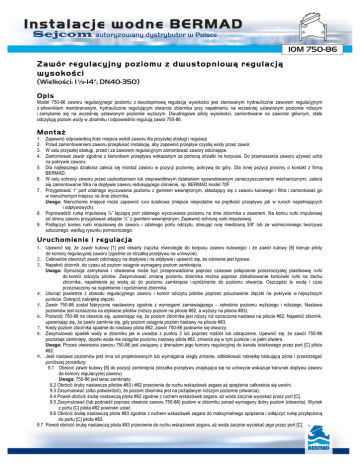 Instalacje wodne BERMAD Sejcom autoryzowany dystrybutor w Polsce IOM 750-86 Zawór regulacyjny poziomu z dwustopniową regulacją wysokości (Wielkości: 1½-14"; DN40-350) Opis Model 750-86 zaworu regulacyjnego poziomu z dwustopniową regulacją wysokości jest sterowanym hydraulicznie zaworem regulacyjnym z siłownikiem membranowym, hydraulicznie regulującym otwarcie zbiornika przy napełnianiu na wcześniej ustawionym poziomie niższym i zamykanie się na wcześniej ustawionym poziomie wyższym. Dwudrogowe piloty wysokości, zamontowane na zaworze głównym, stale odczytują poziom wody w zbiorniku i odpowiednio regulują zawór 750-86. Montaż 1. 2. 3. 4. 5. 6. 7. 8. 9. Zapewnić odpowiednią ilość miejsca wokół zaworu dla przyszłej obsługi i regulacji. Przed zamontowaniem zaworu przepłukać instalację, aby zapewnić przepływ czystej wody przez zawór. W celu przyszłej obsługi, przed i za zaworem regulacyjnym zamontować zawory odcinające. Zamontować zawór zgodnie z kierunkiem przepływu wskazanym za pomocą strzałki na korpusie. Do przenoszenia zaworu używać ucha na pokrywie zaworu. Dla najlepszego działania zaleca się montaż zaworu w pozycji poziomej, pokrywą do góry. Dla innej pozycji prosimy o kontakt z firmą BERMAD. W celu ochrony zaworu przed uszkodzeniem lub nieprawidłowym działaniem spowodowanym zanieczyszczeniami mechanicznymi, zaleca się zamontowanie filtra na dopływie zaworu redukującego ciśnienie, np. BERMAD model 70F. Przygotować 1” port zdalnego wyczuwania poziomu z gwintem wewnętrznym, składający się z zaworu kulowego i filtra i zamontować go w nieruchomym miejscu na dnie zbiornika. Uwaga: Nieruchome miejsce może zapewnić rura ściekowa (miejsce niepodatne na prędkość przepływu jak w rurach napełniających i odpływowych). Poprowadzić rurkę impulsową ½” łączącą port zdalnego wyczuwania poziomu na dnie zbiornika z zaworem. Na końcu rurki impulsowej od strony zaworu przygotować adapter ½” z gwintem wewnętrznym. Zapewnić ochronę rurki impulsowej. Podłączyć koniec rurki impulsowej do zaworu i zdalnego portu odczytu, stosując rurę miedzianą 3/8” lub ze wzmocnionego tworzywa sztucznego, według rysunku pomocniczego. Uruchomienie i regulacja 1. Upewnić się, że zawór kulowy [1] jest otwarty (rączka równolegle do korpusu zaworu kulowego) i że zawór kulowy [6] kieruje piloty do komory regulacyjnej zaworu (zgodnie ze strzałką przepływu na uchwycie). 2. Całkowicie otworzyć zawór odcinający na dopływie i na odpływie i upewnić się, że ciśnienie jest typowe. 3. Napełnić zbiornik, do czasu aż poziom osiągnie wymagany poziom zamknięcia. Uwaga: Symulacja zamykania i otwierania może być przeprowadzona poprzez czasowe połączenie przezroczystej plastikowej rurki do komór odczytu pilotów. Zasymulować zmianę poziomu zbiornika można poprzez zlokalizowanie końcówki rurki na dachu zbiornika, napełnienie jej wodą aż do poziomu zamknięcia i opróżnienie do poziomu otwarcia. Oszczędzi to wodę i czas przeznaczony na napełnienie i opróżnienie zbiornika. 4. Usunąć powietrze z obwodu regulacyjnego zaworu i komór odczytu pilotów poprzez poluzowanie złączki na pokrywie w najwyższym punkcie. Dokręcić nakrętkę złączki. 5. Zawór 750-86 został fabrycznie nastawiony zgodnie z wymogami zamawiającego – odnośnie poziomu wyższego i niższego. Nastawa poziomów jest oznaczona na etykiecie pilotów (niższy poziom na pilocie #82, a wyższy na pilocie #83). 6. Pozwolić 750-86 na otwarcie się, upewniając się, że poziom zbiornika jest niższy niż oznaczona nastawa na pilocie #82. Napełnić zbiornik, upewniając się, że zawór zamknie się, gdy poziom osiągnie poziom nastawy na pilocie #83. 7. Kiedy poziom zbiornika spadnie do nastawy pilota #82, zawór 750-86 podownie się otworzy. 8. Zasymulować spadek wody w zbiorniku jak w uwadze z punktu 3 lub poprzez rozbiór lub odsączenie. Upewnić się, że zawór 750-86 pozostaje zamknięty, dopóki woda nie osiągnie poziomu nastawy pilota #82, zmienia się w tym punkcie i w pełni otwiera. Uwaga: Proces otwierania zaworu 750-86 jest związany z drenażem jego komory regulacyjnej do kanału ściekowego przez port [C] pilota #82. 9. Jeśli nastawa poziomów jest inna od projektowanych lub wymagania uległy zmianie, odblokować nakrętkę blokującą pilota i przestrzegać poniższej procedury: 9.1 Obrócić zawór kulowy [6] do pozycji zamknięcia (strzałka przepływu znajdująca się na uchwycie wskazuje kierunek dopływu zaworu do komory regulacyjnej zaworu) Uwaga: 750-86 jest teraz zamknięty. 9.2 Obrócić śruby nastawcze pilotów #83 i #82 przeciwnie do ruchu wskazówek zegara aż sprężenie całkowicie się uwolni. 9.3 Zasymulować (albo potwierdzić), że poziom zbiornika jest na pożądanym niższym poziomie (otwarcia). 9.4 Powoli obrócić śrubę nastawczą pilota #82 zgodnie z ruchem wskazówek zegara, aż woda zacznie wyciekać przez port [C]. 9.5 Zasymulować (lub podnieść poprzez otwarcie zaworu 750-86) poziom w zbiorniku ponad wymagany dolny poziom (otwarcia). Wyciek z portu [C] pilota #82 powinien ustać. 9.6 Obrócić śrubę nastawczą pilota #83 zgodnie z ruchem wskazówek zegara do maksymalnego sprężenia i odłączyć rurkę przyłączoną do portu [C] pilota #83. 9.7 Powoli obrócić śrubę nastawczą pilota #83 przeciwnie do ruchu wskazówek zegara, aż woda zacznie wyciekać jego przez port [C]. Instalacje wodne BERMAD Sejcom autoryzowany dystrybutor w Polsce IOM 750-86 9.8 Zasymulować (lub obniżyć) poziom w zbiorniku poniżej wymaganego poziomu górnego (zamknięcia). Wyciek z portu [C] pilota #83 powinien ustać. 9.9 Ponownie podłączyć rurkę podłączoną do portu [C] pilota #83 i zresetować zawór kulowy [6] do pozycji otwarcia. 9.10 Po zakończeniu zmian w ustawieniach, zamknąć nakrętki blokujące pilotów. 10. Celem zwiększenia szybkości zamykania, obrócić integralny zaworu igl