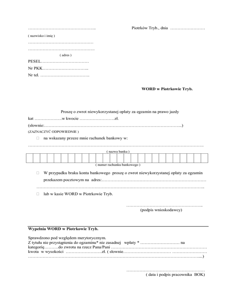……………………………………….. Piotrków Tryb., dnia …………………… ( nazwisko i imię ) ……………………………………… ………………………………………. ( adres ) PESEL…………………………… Nr PKK………………………….. Nr tel. ……………………………. WORD w Piotrkowie Tryb. Proszę o zwrot niewykorzystanej opłaty za egzamin na prawo jazdy kat ……………….w kwocie ……………………zł. (słownie:…………………………………………………………………………………..) (ZAZNACZYĆ ODPOWIEDNIE ) na wskazany przeze mnie rachunek bankowy w: …………………………………………………………………………………………………………. ( nazwa banku ) ( numer rachunku bankowego ) W przypadku braku konta bankowego proszę o zwrot niewykorzystanej opłaty za egzamin przekazem pocztowym na adres:……………………………………………………………… …………………………………………………………………………………………………….. lub w kasie WORD w Piotrkowie Tryb. …………………………………………….. (podpis wnioskodawcy) Wypełnia WORD w Piotrkowie Tryb. Sprawdzono pod względem merytorycznym. Z tytułu nie przystąpienia do egzaminu* nie zasadnej wpłaty * ……………………… na kategorię……….do zwrotu na rzecz Pana/Pani ………………………………………………………… kwota w wysokości …………………….zł. ( słownie…………………………… …………………… ………………………………………………………………………………………………………....) ……………………………………………… ( data i podpis pracownika BOK)