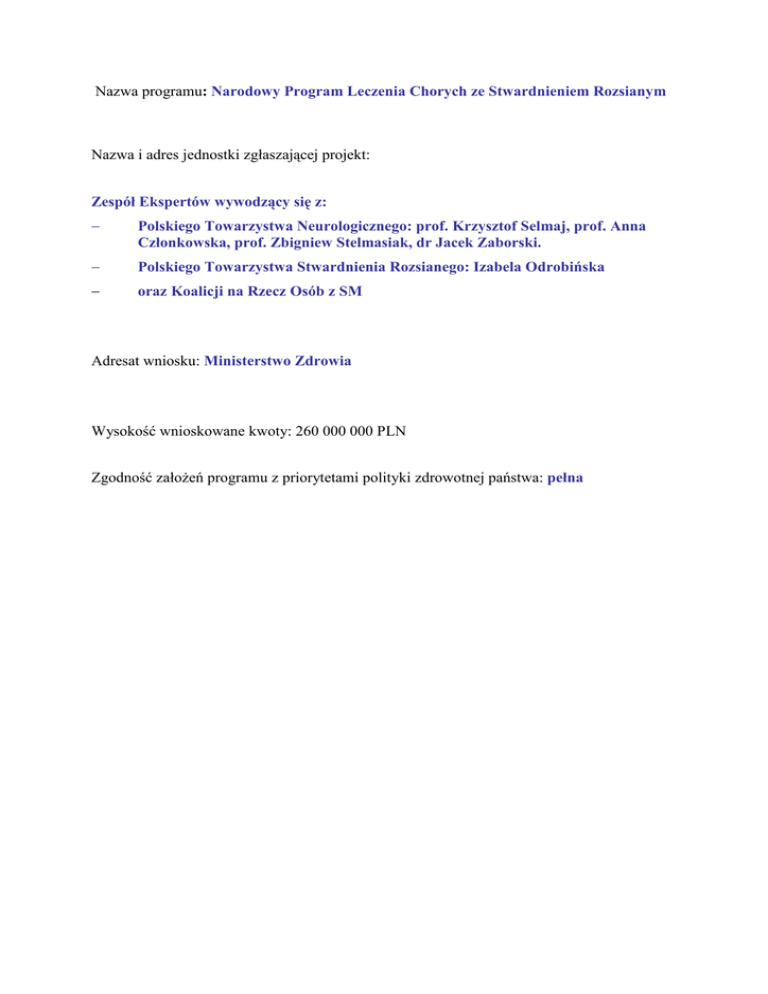 Nazwa programu: Narodowy Program Leczenia Chorych ze Stwardnieniem Rozsianym Nazwa i adres jednostki zgłaszającej projekt: Zespół Ekspertów wywodzący się z: − Polskiego Towarzystwa Neurologicznego: prof. Krzysztof Selmaj, prof. Anna Członkowska, prof. Zbigniew Stelmasiak, dr Jacek Zaborski. − Polskiego Towarzystwa Stwardnienia Rozsianego: Izabela Odrobińska − oraz Koalicji na Rzecz Osób z SM Adresat wniosku: Ministerstwo Zdrowia Wysokość wnioskowane kwoty: 260 000 000 PLN Zgodność założeń programu z priorytetami polityki zdrowotnej państwa: pełna SPIS TREŚCI I. STRESZCZENIE...................................................................................................... 4 I.1. Cel narodowego programu leczenia chorych na sm..................................................................................... 4 I.2. Wada obecnego podejścia do leczenia sm .................................................................................................... 4 I.3. Streszczenie narodowego programu leczenia chorych na sm...................................................................... 5 I.4. Spodziewane efekty i korzyści wynikające z wdrożenia programu ........................................................... 6 I.5. Określenie wysokości środków finasowych niezbędnych na realizacje programu.................................... 6 II. STWARDNIENIE ROZSIANE................................................................................. 7 II.1. Opis choroby .................................................................................................................................................. 7 II.2. Zdefiniowanie potrzeby społecznej .............................................................................................................. 9 II.3. Efektywność ekonomiczna ............................................................................................................................ 9 III. SZCZEGÓŁOWY OPIS PROGRAMU ................................................................. 10 III.1. Cel Narodowego Programu Leczenia Chorych na SM........................................................................... 10 III.2. Elementy Narodowego Programu Leczenia Chorych Na SM............................................................... 10 III.3. Realizacja Narodowego Programu Leczenia Chorych Na SM .............................................................. 10 III.4.1 Leczenie immunomodulacyjne................................................................................................................ 11 III.4.2 Leczenie immunosupresyjne ................................................................................................................... 13 III.4.3 Opis leków ............................................................................................................................................... 13 III.4.4. Działania uboczne przy stosowaniu poszczególnych leków................................................................. 14 III.4.5. Leczenie objawowe.................................................................................................................................. 14 III.4.6. Algorytm postępowania.......................................................................................................................... 15 III.5. Rehabilitacja............................................................................................................................................... 15 Tryb i forma oferowanych usług.................................................................................................................. 17 Objętość czasowa terapii:............................................................................................................................ 17 Zalecane oddziaływania rehabilitacyjne wobec chorych z dysfunkcjami ruchowymi................................. 17 IZalecane oddziaływania rehabilitacyjne w zakresie neuropsychlogii (wobec chorych z dysfunkcjami behawioralnymi): ......................................................................................................................................... 18 Zlecane warunki techniczno-lokalowe:........................................................................................................ 18 Zalecane wyposażenie Ośrodka ................................................................................................................... 19 Warunki wstępne umożliwiające wykonanie świadczenia rehabilitacyjnego .............................................. 19 III.6 Poradnie Leczenia Stwardnienia Rozsianego ........................................................................................... 20 III.7. Działania edukacyjne................................................................................................................................. 20 III.2.7.1. Szkolenia....................................................................................................................................... 20 III.2.7.2. Konferencje................................................................................................................................... 20 III.8. Systematyczne zbieranie danych epidemiologicznych ............................................................................ 21 III.9 Rada Programowa ...................................................................................................................................... 21 IV. UZASADNIENIE.................................................................................................. 22 IV.1. Dlaczego realizacja programu powinna być sfinansowana .................................................................... 22 IV.2.Nowatorstwo Narodowego programu lecznenia chorych na sm ............................................................. 23 2 IV.3 Wda obecnie funkcjonujących programów leczenia SM IV