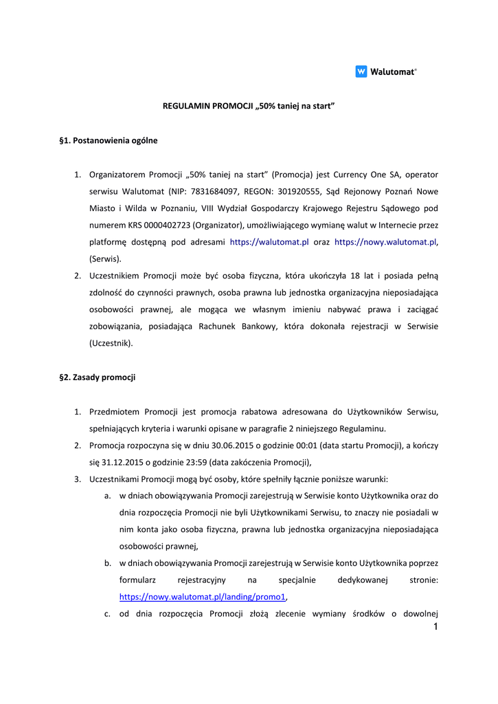 REGULAMIN PROMOCJI „50% taniej na start” §1. Postanowienia ogólne 1. Organizatorem Promocji „50% taniej na start” (Promocja) jest Currency One SA, operator serwisu Walutomat (NIP: 7831684097, REGON: 301920555, Sąd Rejonowy Poznań Nowe Miasto i Wilda w Poznaniu, VIII Wydział Gospodarczy Krajowego Rejestru Sądowego pod numerem KRS 0000402723 (Organizator), umożliwiającego wymianę walut w Internecie przez platformę dostępną pod adresami https://walutomat.pl oraz https://nowy.walutomat.pl, (Serwis). 2. Uczestnikiem Promocji może być osoba fizyczna, która ukończyła 18 lat i posiada pełną zdolność do czynności prawnych, osoba prawna lub jednostka organizacyjna nieposiadająca osobowości prawnej, ale mogąca we własnym imieniu nabywać prawa i zaciągać zobowiązania, posiadająca Rachunek Bankowy, która dokonała rejestracji w Serwisie (Uczestnik). §2. Zasady promocji 1. Przedmiotem Promocji jest promocja rabatowa adresowana do Użytkowników Serwisu, spełniających kryteria i warunki opisane w paragrafie 2 niniejszego Regulaminu. 2. Promocja rozpoczyna się w dniu 30.06.2015 o godzinie 00:01 (data startu Promocji), a kończy się 31.12.2015 o godzinie 23:59 (data zakóczenia Promocji), 3. Uczestnikami Promocji mogą być osoby, które spełniły łącznie poniższe warunki: a. w dniach obowiązywania Promocji zarejestrują w Serwisie konto Użytkownika oraz do dnia rozpoczęcia Promocji nie byli Użytkownikami Serwisu, to znaczy nie posiadali w nim konta jako osoba fizyczna, prawna lub jednostka organizacyjna nieposiadająca osobowości prawnej, b. w dniach obowiązywania Promocji zarejestrują w Serwisie konto Użytkownika poprzez formularz rejestracyjny na specjalnie dedykowanej stronie: https://nowy.walutomat.pl/landing/promo1, c. od dnia rozpoczęcia Promocji złożą zlecenie wymiany środków o dowolnej 1 jednorazowej wartości w dowolnej walucie, której wymianę Serwis umożliwia. 4. Promocja polega na umożliwieniu Uczestnikom, spełniającym kryteria opisane w punkcie 1 paragrafu 2 niniejszego Regulaminu, promocyjne skorzystanie z usług Serwisu, co oznacza, że Serwis naliczy i pobierze prowizję z tytułu pośrednictwa w pierwszej, po rejestracji konta w Serwisie, transakcji wymiany (złożenia zlecenia) w wysokości 50% podstawowej stawki prowizji pobieranej przez Serwis, która wynosi 0,2% wartości zrealizowanego zlecenia. 5. Zniżka w wysokości 50% podstawowej stawki prowizji aktywna jest na czas nieokreślony, czyli do momentu zakończenia pierwszej, po rejestracji konta w Serwisie, transakcji wymiany (złożenia zlecenia). 6. Rejestracja w Serwisie musi nastąpić w dniach obowiązywania promocji, czyli od 30.06.2015 od godziny 00:01 do 31.12.2015 do godziny 23:59. 7. W przypadku anulowania pierwszego zlecenia wymiany objętego zni ̇żką, każde kolejne zlecenie jest realizowane wg podstawowej stawki prowizji pobieranej przez Serwis, tj. 0,2% wartości zrealizowanego zlecenia. 8. Jeśli Uczestnik złoży więcej ni ̇ż jedno zlecenie wymiany zgodne z warunkami opisanymi w punkcie 3c. paragraf 2, Promocją zostanie objęte to, które zostanie zakończone jako pierwsze. 9. Jeśli w trakcie trwania niniejszej Promocji Użytkownik skorzysta z innej promocji operatora umożliwiającej zrealizowanie pierwszej transakcji Użytkownika na warunkach korzystniejszych, ni ̇ż wskazane w punkcie 3 niniejszego Regulaminu, kolejna transakcja Użytkownika zostanie zrealizowana na standardowych warunkach. §3. Prawa i obowiązki Uczestników 1. Obowiązkiem Uczestnika Promocji jest przestrzeganie zapisów niniejszego Regulaminu pod rygorem wykluczenia z uczestnictwa w Promocji, w sytuacji naruszenia postanowień Regulaminu lub innych norm ogólnych, takich jak zachowanie niezgodne z obowiązującym prawem, normami współżycia społecznego i moralnymi, społecznie nieakceptowanymi oraz naruszającymi zasady netykiety. §4. Prawa i obowiązki Organizatora 1. W Promocji nie mogą uczestniczyć pracownicy Organizatora oraz innych podmiotów biorących bezpośredni udział w przygotowaniu i prowadzeniu Promocji, a także członkowie najbli ̇ższych 2 rodzin tych osób. Przez członków najbli ̇ższej rodziny rozumie się: wstępnych, zstępnych, rodzeństwo, małżonków, małżonków rodzeństwa, rodziców, małżonków, krewnych i powinowatych drugiego stopnia i osoby pozostające w stosunku przysposobienia. 2. Organizator zastrzega sobie prawo do wykluczenia z udziału w Promocji Uczestników, a w skrajnych przypadkach do blokowania uczestnictwa w Promocji tych Uczestników, którzy naruszają postanowienia niniejszego Regulaminu. Decyzja Organizatora Promocji w tym zakresie jest ostateczna. 3. W przypadku zaistnienie siły wyższej lub innego zdarzenia, na które Organizator nie ma wpływu, Organizator zastrzega sobie prawo do przedłużenia, skrócenia, zawieszenia, przerwania lub odwołania Promocji. W takim przypadku Organizator poinformuje Uczestników o powodach zaistniałych zmian i zaproponuje inną formę promocji, która nie pogorszy dotychczasowych warunków uczestnictwa, a w szczególności nie będzie oferować nagrody o mniejszej wartości lub gorszej jakości jak pierwotnie przyrzeczona. 4. Organizator Promocji nie ponosi odpowiedzialności za: a. ewentualne problemy techniczne, w szczególności związane z działaniem dostawców usług internetowych, które mogłyby mieć wpływ na wypełnienie warunków uczestnictwa w Promocji, b. połączenia internetowe, w szczególności za przerwanie, zawieszenie lub zniekształcenie takiego połączenia mogących spowodować stratę lub zniszczenie treści przesłanych drogą elektroniczną, c. jakichkolwiek problemów wynikających z działania bankowych serwisów internetowych, d. szkody, jakie mogą wystąpić w systemach komputerowych Uczestników w związku z interakcjami z bankowymi serwisami internetowymi. § 5. Postanowienia końcowe 1. W przypadku wątpliwości Uczestnik powinien zwr
