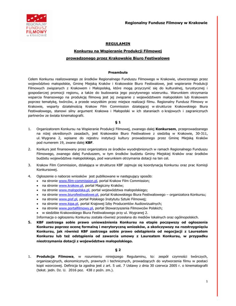 Regionalny Fundusz Filmowy w Krakowie REGULAMIN Konkursu na Wspieranie Produkcji Filmowej prowadzonego przez Krakowskie Biuro Festiwalowe Preambuła Celem Konkursu realizowanego ze środków Regionalnego Funduszu Filmowego w Krakowie, utworzonego przez województwo małopolskie, Gminę Miejską Kraków i Krakowskie Biuro Festiwalowe, jest wspieranie Produkcji Filmowych związanych z Krakowem i Małopolską, które mogą przyczynić się do kulturalnej, turystycznej i gospodarczej promocji regionu, a także do budowania jego pozytywnego wizerunku. Warunkiem otrzymania wsparcia finansowego na produkcję filmową jest jej związanie z województwem małopolskim lub Krakowem poprzez tematykę, twórców, a przede wszystkim przez miejsce realizacji filmu. Regionalny Fundusz Filmowy w Krakowie, wsparty działalnością Krakow Film Commission działającej w strukturze Krakowskiego Biura Festiwalowego, stanowi silny argument Krakowa i Małopolski w ich staraniach o krajowych i zagranicznych partnerów ze świata kinematografii. §1 1. Organizatorem Konkursu na Wspieranie Produkcji Filmowej, zwanego dalej Konkursem, przeprowadzanego na niżej określonych zasadach, jest Krakowskie Biuro Festiwalowe z siedzibą w Krakowie, 30-311, ul. Wygrana 2, wpisane do rejestru instytucji kultury prowadzonego przez Gminę Miejską Kraków pod numerem 19, zwane dalej KBF. 2. Konkurs jest finansowany przez organizatora ze środków wyodrębnionych w ramach Regionalnego Funduszu Filmowego, zwanego dalej Funduszem, w tym środków budżetu Gminy Miejskiej Kraków oraz środków budżetu województwa małopolskiego, pod warunkiem otrzymania dotacji na ten cel. 3. Krakow Film Commission, działająca w strukturze KBF zajmuje się koordynacją Konkursu oraz prac Komisji Konkursowej. 4. Ogłoszenie o naborze wniosków jest publikowane w następujący sposób: na stronie www.film-commission.pl, portal Krakow Film Commission; na stronie www.krakow.pl, portal Magiczny Kraków; na stronie www.malopolska.pl, portal województwa małopolskiego; na stronie www.biurofestiwalowe.pl, portal Krakowskiego Biura Festiwalowego – organizatora Konkursu; na stronie www.pisf.pl, portal Polskiego Instytutu Sztuki Filmowej; na stronie www.kipa.pl, portal Krajowej Izby Producentów Audiowizualnych; na stronie www.portalfilmowy.pl, portal Stowarzyszenia Filmowców Polskich; w siedzibie Krakowskiego Biura Festiwalowego przy ul. Wygranej 2. Informacja o ogłoszeniu Konkursu została również przesłana do mediów lokalnych oraz ogólnopolskich. 5. KBF zastrzega sobie prawo unieważnienia Konkursu na etapie począwszy od ogłoszenia Konkursu poprzez ocenę formalną i merytoryczną wniosków, a skończywszy na rozstrzygnięciu Konkursu, jak również KBF zastrzega sobie prawo odstąpienia od negocjacji z Laureatem Konkursu lub też odstąpienia od zawarcia umowy z Laureatem Konkursu, w przypadku nieotrzymania dotacji z województwa małopolskiego. §2 1. Produkcja Filmowa, w rozumieniu niniejszego Regulaminu, to: zespół czynności twórczych, organizacyjnych, ekonomicznych, prawnych i technicznych, prowadzących do wytworzenia filmu w postaci kopii wzorcowej. Definicja ta zgodna jest z art. 5 ust. 7 Ustawy z dnia 30 czerwca 2005 r. o kinematografii (tekst. jedn. Dz. U. 2016 poz. 438 z poźn. zm.). 1 Regionalny Fundusz Filmowy w Krakowie 2. Film, w rozumieniu niniejszego Regulaminu, to: utwór dowolnej długości, w tym utwór dokumentalny lub animowany, złożony z serii następujących po sobie obrazów z dźwiękiem lub bez dźwięku, utrwalonych na jakimkolwiek nośniku umożliwiającym wielokrotne odtwarzanie, wywołujących wrażenie ruchu i składających się na oryginalną całość, wyrażającą akcję (treść) w indywidualnej formie, a ponadto, z wyjątkiem utworów dokumentalnych i animowanych, przeznaczony do wyświetlania w kinie jako pierwszym polu eksploatacji w rozumieniu przepisów o prawie autorskim i prawach pokrewnych. Definicja ta jest zgodna z art. 4 ust. 1 Ustawy z dnia 30 czerwca 2005 r. o kinematografii (tekst. jedn. Dz. U. 2016 poz. 438 z poźn. zm.). Krakow Film Commission działająca w strukturze KBF, zajmuje się koordynacją Konkursu oraz prac Komisji Konkursowej. 3. Konkurs ma na celu wspieranie produkcji filmów przeznaczonych do emisji jako materiał programowy w telewizji lub Internecie oraz na innych polach eksploatacji uzgodnionych przez koproducentów, w tym do wyświetlania w kinach. §3 Konkurs na Wspieranie Produkcji Filmowej w ramach Regionalnego Funduszu Filmowego, ogłaszany jest co najmniej raz w roku. §4 1. Wspieranie Produkcji Filmowych odbywać się będzie ze środków Funduszu, których dysponentem jest KBF, ewentualnie także poprzez wsparcie w postaci wkładu rzeczowego, na zasadach określonych w Regulaminie oraz umowie koprodukcyjnej. 2. Na zasadach określonych w umowie koprodukcyjnej KBF nabędzie prawa autorskie i pokrewne do Filmu oraz partycypować będzie w przychodach z eksploatacji Filmu. 3. Wsparcie Produkcji Filmowej zgodnie z Regulaminem może mieć następującą formę: a. wkład finansowy rozumiany jako wsparcie Produkcji Filmowej poprzez przekazanie środków pieniężnych na rzecz wnioskodawcy. Przyznany w ramach Konkursu wkład finansowy wyrażony jest w kwocie netto; b. wkład rzeczowy, rozumiany jako wsparcie Produkcji Filmowej poprzez zapewnienie bezpośrednio przez KBF na rzecz wnioskodawcy świadczeń w postaci m.in. usług, towarów lub świadczeń niematerialnych, w tym czynności o charakterze organizacyjnym, administracyjnym, prawnym lub udostępnienia nieruchomości albo ruchomości, bez przekazywania środków pieniężnych na rzecz wnioskodawcy. Wartość świadczeń KBF jest ustalona w oparciu o wartość rynkową tych świadczeń i zaliczana jest do wkładu KBF w produkcję Filmu. §5 1. Nagrodą w Konkursie jest zaproszenie Laureata Konkursu do negocjacji umowy koprodukcyjnej, na podstawie której Laureat Konkursu i KBF stają się koproducentami Fi
