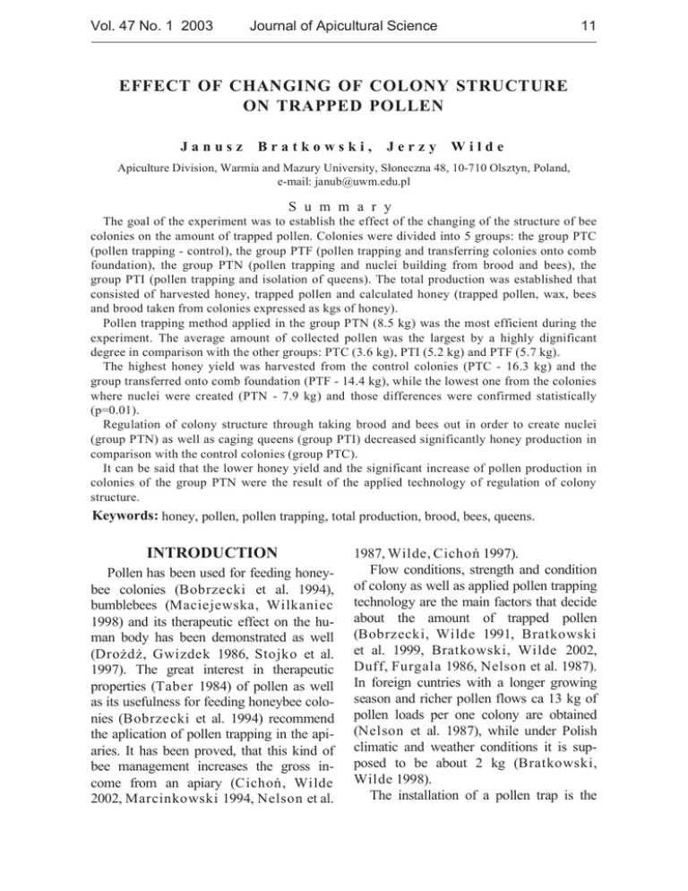 ʱ´ň ěé ұň ď îđđí Ö±«®˛ż´ ±ş ß°·˝«´¬«®ż´ Í˝·»˛˝» ďď ŰÚÚŰÝĚ ŃÚ ÝŘßŇŮ×ŇŮ ŃÚ ÝŃÔŃŇÇ ÍĚÎËÝĚËÎŰ ŃŇ ĚÎßĐĐŰÜ ĐŃÔÔŰŇ Öż˛«¦ Ţ®ż¬µ±©µ·ô Ö»®¦§ É·´Ľ» ß°·˝«´¬«®» Ü·Ş··±˛ô Éż®ł·ż ż˛Ľ Óż¦«®§ ˲·Ş»®·¬§ô Ím±˛»˝¦˛ż ěčô ďđóéďđ Ń´¦¬§˛ô б´ż˛Ľô »ółż·´ć ¶ż˛«ľŕ«©łň»Ľ«ň°´ Í « ł ł ż ® § ̸» ą±ż´ ±ş ¬¸» »¨°»®·ł»˛¬ ©ż ¬± »¬żľ´·¸ ¬¸» »şş»˝¬ ±ş ¬¸» ˝¸ż˛ą·˛ą ±ş ¬¸» ¬®«˝¬«®» ±ş ľ»» ˝±´±˛·» ±˛ ¬¸» żł±«˛¬ ±ş ¬®ż°°»Ľ °±´´»˛ň ݱ´±˛·» ©»®» Ľ·Ş·Ľ»Ľ ·˛¬± ë ą®±«°ć ¬¸» ą®±«° ĐĚÝ ř°±´´»˛ ¬®ż°°·˛ą ó ˝±˛¬®±´÷ô ¬¸» ą®±«° ĐĚÚ ř°±´´»˛ ¬®ż°°·˛ą ż˛Ľ ¬®ż˛ş»®®·˛ą ˝±´±˛·» ±˛¬± ˝±łľ ş±«˛Ľż¬·±˛÷ô ¬¸» ą®±«° ĐĚŇ ř°±´´»˛ ¬®ż°°·˛ą ż˛Ľ ˛«˝´»· ľ«·´Ľ·˛ą ş®±ł ľ®±±Ľ ż˛Ľ ľ»»÷ô ¬¸» ą®±«° ĐĚ× ř°±´´»˛ ¬®ż°°·˛ą ż˛Ľ ·±´ż¬·±˛ ±ş Ż«»»˛÷ň ̸» ¬±¬ż´ °®±Ľ«˝¬·±˛ ©ż »¬żľ´·¸»Ľ ¬¸ż¬ ˝±˛·¬»Ľ ±ş ¸ż®Ş»¬»Ľ ¸±˛»§ô ¬®ż°°»Ľ °±´´»˛ ż˛Ľ ˝ż´˝«´ż¬»Ľ ¸±˛»§ ř¬®ż°°»Ľ °±´´»˛ô ©ż¨ô ľ»» ż˛Ľ ľ®±±Ľ ¬żµ»˛ ş®±ł ˝±´±˛·» »¨°®»»Ľ ż µą ±ş ¸±˛»§÷ň б´´»˛ ¬®ż°°·˛ą ł»¬¸±Ľ ż°°´·»Ľ ·˛ ¬¸» ą®±«° ĐĚŇ řčňë µą÷ ©ż ¬¸» ł±¬ »şş·˝·»˛¬ Ľ«®·˛ą ¬¸» »¨°»®·ł»˛¬ň ̸» żŞ»®żą» żł±«˛¬ ±ş ˝±´´»˝¬»Ľ °±´´»˛ ©ż ¬¸» ´ż®ą»¬ ľ§ ż ¸·ą¸´§ Ľ·ą˛·ş·˝ż˛¬ Ľ»ą®»» ·˛ ˝±ł°ż®·±˛ ©·¬¸ ¬¸» ±¬¸»® ą®±«°ć ĐĚÝ říňę µą÷ô ĐĚ× řëňî µą÷ ż˛Ľ ĐĚÚ řëňé µą÷ň ̸» ¸·ą¸»¬ ¸±˛»§ §·»´Ľ ©ż ¸ż®Ş»¬»Ľ ş®±ł ¬¸» ˝±˛¬®±´ ˝±´±˛·» řĐĚÝ ó ďęňí µą÷ ż˛Ľ ¬¸» ą®±«° ¬®ż˛ş»®®»Ľ ±˛¬± ˝±łľ ş±«˛Ľż¬·±˛ řĐĚÚ ó ďěňě µą÷ô ©¸·´» ¬¸» ´±©»¬ ±˛» ş®±ł ¬¸» ˝±´±˛·» ©¸»®» ˛«˝´»· ©»®» ˝®»ż¬»Ľ řĐĚŇ ó éňç µą÷ ż˛Ľ ¬¸±» Ľ·şş»®»˛˝» ©»®» ˝±˛ş·®ł»Ľ ¬ż¬·¬·˝ż´´§ ř°ăđňđď÷ň Î»ą«´ż¬·±˛ ±ş ˝±´±˛§ ¬®«˝¬«®» ¬¸®±«ą¸ ¬żµ·˛ą ľ®±±Ľ ż˛Ľ ľ»» ±«¬ ·˛ ±®Ľ»® ¬± ˝®»ż¬» ˛«˝´»· řą®±«° ĐĚŇ÷ ż ©»´´ ż ˝żą·˛ą Ż«»»˛ řą®±«° ĐĚ×÷ Ľ»˝®»ż»Ľ ·ą˛·ş·˝ż˛¬´§ ¸±˛»§ °®±Ľ«˝¬·±˛ ·˛ ˝±ł°ż®·±˛ ©·¬¸ ¬¸» ˝±˛¬®±´ ˝±´±˛·» řą®±«° ĐĚÝ÷ň ׬ ˝ż˛ ľ» ż·Ľ ¬¸ż¬ ¬¸» ´±©»® ¸±˛»§ §·»´Ľ ż˛Ľ ¬¸» ·ą˛·ş·˝ż˛¬ ·˛˝®»ż» ±ş °±´´»˛ °®±Ľ«˝¬·±˛ ·˛ ˝±´±˛·» ±ş ¬¸» ą®±«° ĐĚŇ ©»®» ¬¸» ®»«´¬ ±ş ¬¸» ż°°´·»Ľ ¬»˝¸˛±´±ą§ ±ş ®»ą«´ż¬·±˛ ±ş ˝±´±˛§ ¬®«˝¬«®»ň Ő»§©±®Ľć ¸±˛»§ô °±´´»˛ô °±´´»˛ ¬®ż°°·˛ąô ¬±¬ż´ °®±Ľ«˝¬·±˛ô ľ®±±Ľô ľ»»ô Ż«»»˛ň ×ŇĚÎŃÜËÝĚ×ŃŇ Đ±´´»˛ ¸ż ľ»»˛ «»Ľ ş±® ş»»Ľ·˛ą ¸±˛»§ó ľ»» ˝±´±˛·» řޱľ®¦»˝µ· »¬ ż´ň ďççě÷ô ľ«łľ´»ľ»» řÓż˝·»¶»©µżô É·´µż˛·»˝ ďççč÷ ż˛Ľ ·¬ ¬¸»®ż°»«¬·˝ »şş»˝¬ ±˛ ¬¸» ¸«ó łż˛ ľ±Ľ§ ¸ż ľ»»˛ Ľ»ł±˛¬®ż¬»Ľ ż ©»´´ řÜ®±aĽaô Ů©·¦Ľ»µ ďçčęô ͬ±¶µ± »¬ ż´ň ďççé÷ň ̸» ą®»ż¬ ·˛¬»®»¬ ·˛ ¬¸»®ż°»«¬·˝ °®±°»®¬·» řĚżľ»® ďçčě÷ ±ş °±´´»˛ ż ©»´´ ż ·¬ «»ş«´˛» ş±® ş»»Ľ·˛ą ¸±˛»§ľ»» ˝±´±ó ˛·» řޱľ®¦»˝µ· »¬ ż´ň ďççě÷ ®»˝±łł»˛Ľ ¬¸» ż°´·˝ż¬·±˛ ±ş °±´´»˛ ¬®ż°°·˛ą ·˛ ¬¸» ż°·ó ż®·»ň ׬ ¸ż ľ»»˛ °®±Ş»Ľô ¬¸ż¬ ¬¸· µ·˛Ľ ±ş ľ»» łż˛żą»ł»˛¬ ·˛˝®»ż» ¬¸» ą®± ·˛ó ˝±ł» ş®±ł ż˛ ż°·ż®§ řÝ·˝¸±/ô É·´Ľ» îđđîô Óż®˝·˛µ±©µ· ďççěô Ň»´±˛ »¬ ż´ň ďçčéô É·´Ľ»ô Ý·˝¸±/ ďççé÷ň Ú´±© ˝±˛Ľ·¬·±˛ô ¬®»˛ą¬¸ ż˛Ľ ˝±˛Ľ·¬·±˛ ±ş ˝±´±˛§ ż ©»´´ ż ż°°´·»Ľ °±´´»˛ ¬®ż°°·˛ą ¬»˝¸˛±´±ą§ ż®» ¬¸» łż·˛ şż˝¬±® ¬¸ż¬ Ľ»˝·Ľ» żľ±«¬ ¬¸» żł±«˛¬ ±ş ¬®ż°°»Ľ °±´´»˛ řޱľ®¦»˝µ·ô É·´Ľ» ďççďô Ţ®ż¬µ±©µ· »¬ ż´ň ďçççô Ţ®ż¬µ±©µ·ô É·´Ľ» îđđîô Ü«şşô Ú«®ąż´ż ďçčęô Ň»´±˛ »¬ ż´ň ďçčé÷ň ײ ş±®»·ą˛ ˝«˛¬®·» ©·¬¸ ż ´±˛ą»® ą®±©·˛ą »ż±˛ ż˛Ľ ®·˝¸»® °±´´»˛ ş´±© ˝ż ďí µą ±ş °±´´»˛ ´±żĽ °»® ±˛» ˝±´±˛§ ż®» ±ľ¬ż·˛»Ľ řŇ»´±˛ »¬ ż´ň ďçčé÷ô ©¸·´» «˛Ľ»® б´·¸ ˝´·łż¬·˝ ż˛Ľ ©»ż¬¸»® ˝±˛Ľ·¬·±˛ ·¬ · «°ó °±»Ľ ¬± ľ» żľ±«¬ î µą řŢ®ż¬µ±©µ·ô É·´Ľ» ďççč÷ň ̸» ·˛¬ż´´ż¬·±˛ ±ş ż °±´´»˛ ¬®ż° · ¬¸» ďî ·ł°´»¬ °±´´»˛ ¬®ż°°·˛ą ł»¬¸±Ľň ß ďđóĽż§ó˝§˝´» ±ş °±´´»˛ ¬®ż°°·˛ą ·˛¬ż´´ż¬·±˛ ¸ż ľ»»˛ ®»˝±łł»˛Ľ»Ľ ·˛ ±®Ľ»® ¬± żŞ±·Ľ łżµ·˛ą °±´´»˛ ¬®ż°°·˛ą Ľ·şş·˝«´¬ ¬± ľ»»ć °±´´»˛ · ¬®ż°°»Ľ ş±® ë Ľż§ ż˛Ľ żş¬»® ¬¸ż¬ °»®·±Ľ ·¬ ¸±«´Ľ ľ» ¬±°°»Ľ ş±® ¬¸»