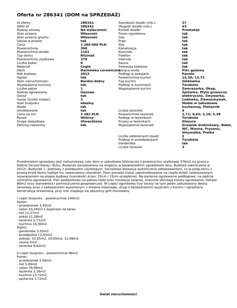 Oferta nr 286341 (DOM na SPRZEDAŻ) Id oferty SWO ID Rodzaj umowy Stan prawny Stan prawny gruntu Udział w prawie Cena Powierzchnia Powierzchnia działki Typ domu Powierzchnia użytkowa Liczba pokoi Materiał Dach Rok budowy Ogród Stan nieruchomości Wyposażona kuchnia Liczba pięter Rodzaj ogrzewania Garaż Garaż (liczba miejsc) Stan budynku Woda Umeblowane Cena za m2 Rynek Droga dojazdowa Parking naziemny 286341 Szerokość działki (mb.) 286341 Długość działki (mb.) Na wyłączność Kształt działki Własność Teren ogrodzony Własność Gaz tak Prąd 1 280 000 PLN Siła 390 Kanalizacja 1161 Kominek Bliźniak Telefon 379 Internet 8 Sauna Cegła Telewizja kablowa Dachówka ceramiczna Gorąca woda 2012 Podłogi w pokojach tak Powierzchnia kuchni Bardzo dobry Typ kuchni tak Podłogi w kuchniach 1 Wyposażenie kuchni Gazowe tak 3 Idealny tak tak Liczba łazienek 3 282 PLN Powierzchnie łazienek Wtórny Podłogi w łazienkach Utwardzona Sciany w łazienkach tak Wyposażenie łazienek Liczba oddzielnych toalet Podłogi w przedpokojach Garderoba Liczba tarasów 27 43 Prostokąt tak tak tak tak tak tak tak tak tak tak Piec gazowy Panele 14,30; 13,72 Oddzielna Terakota Zamrażarka, Okap, Spiżarka, Płyta grzewcza elektryczna, Zmywarka, Lodówka, Zlewozmywak, Meble w zabudowie kuchennej, Piekarnik 4 2,71; 9,62; 2,16; 5,39 Terakota Glazura Grzejnik drabinkowy, Bidet, WC, Wanna, Prysznic, Umywalka, Pralka 2 Terakota tak 3 Przedmiotem sprzedaży jest nietuzinkowy cały dom w zabudowie bliźniaczej o powierzchni użytkowej 379m2 na granicy Dobrej Szczecińskiej i Buku. Budynek posadowiony na wzgórzu w bezpośrednim sąsiedztwie lasu. Budowa zakończona w 2012r. Budynek 1- piętrowy z poddaszem użytkowym. Szczytowa elewacja wykończona odeskowaniem, co w połączeniu z prostą bryłą domu nadaje mu nowoczesny charakter. Dom posiada niskie zapotrzebowanie na ciepło dzięki zastosowanym rozwiązaniom na etapie budowy (szerokość ścian: 25cm i 15cm ocieplenie). Na parterze ogrzewanie podłogowe, na piętrze centralne ogrzewanie. Piec podajnikowy na paliwo stałe oraz instalacja solarna, znacznie obniżają koszty ogrzewania. Garaże 80m2 (trzy stanowiska i pomieszczenia gospodarcze). W części ogrodowej trzy tarasy (w tym jeden zabudowany deską tarasową wraz z zadaszeniem wykonanym z drewna klejonego, drugi z bezpośrednim wyjściem z kuchni i ogrodzony konstrukcją drewnianą, przy nim znajduje się obszerny grill murowany. I część budynku - powierzchnia 140m2: Parter: - przedsionek 3,93m2 - salon 33,24m2 z wyjściem na taras, - hol 11,27m2 - pokój 11,28m2 - łazienka 2,71m2 - kuchnia 14,30m2. Piętro: - garderoba 3,55m2 - przedpokój 13,43m2 - pokoje: 10,05m2, 10,05m2, 12,08m2 - sauna 5m2 - łazienka 9,62m2. II część budynku - powierzchnia 96m2 Parter: - przedsionek 5,58m2 - hol 5,09m2 - salon 29,99m2 - łazienka 2,16m2 - kuchnia 13,72m2 - spiżarnia 1,72m2. Świat nieruchomości Piętro: - pokoje: 10,43m2, 14,95m2 - łazienka 5,39m2 - pomieszczenie gospodarcze 3,50m2 - garderoba 3,72m2 Całość domu utrzymana w pastelowych, klasycznych kolorach, gustownie umeblowana i wyposażona w wysokiej klasy sprzęty i urządzenia. Działka ogrodzona siatką z podmurówką z dwiema furtkami oraz automatyczną bramą do garaży. Ponadto w ogrodzie liczne nasadzenia, klomby, skarpy, trawnik, oświetlenie ogrodowe. Posesja usytuowana na wzniesieniu, co daje piękny widok na okolicę i tereny zalesione. Dojazd do Szczecina w zaledwie 15-20min. Zgodnie z porozumieniem podpisanym przez Prezydenta Miasta Szczecina oraz burmistrza Gminy Dobra od 2015r. gminy te połączyła komunikacja miejska. Polecamy. Dane maklera Arka Nieruchomości tel. tel. 91 433 59 85, tel. 91 433 52 49, tel. tel. 512 080 803, tel. 508 382 979 Świat nieruchomości Powered by TCPDF (www.tcpdf.org)