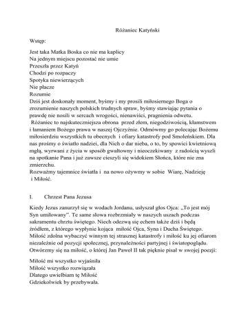 Różaniec Katyński Wstęp: Jest taka Matka Boska co nie ma kaplicy Na jednym miejscu pozostać nie umie Przeszła przez Katyń Chodzi po rozpaczy Spotyka niewierzących Nie płacze Rozumie Dziś jest doskonały moment, byśmy i my prosili miłosiernego Boga o zrozumienie naszych polskich trudnych spraw, byśmy stawiając pytania o prawdę nie nosili w sercach wrogości, nienawiści, pragnienia odwetu. Różaniec to najskuteczniejsza obrona przed złem, niegodziwością, kłamstwem i łamaniem Bożego prawa w naszej Ojczyźnie. Odmówmy go polecając Bożemu miłosierdziu wszystkich tu obecnych i ofiary katastrofy pod Smoleńskiem. Dla nas prośmy o światło nadziei, dla Nich o dar nieba, o to, by spowici kwietniową mgłą, wyrwani z życia w sposób gwałtowny i nieoczekiwany z radością wyszli na spotkanie Pana i już zawsze cieszyli się widokiem Słońca, które nie zna zmierzchu. Rozważmy tajemnice światła i na nowo ożywmy w sobie Wiarę, Nadzieję i Miłość. I. Chrzest Pana Jezusa Kiedy Jezus zanurzył się w wodach Jordanu, usłyszał głos Ojca: „To jest mój Syn umiłowany”. Te same słowa rozbrzmiały w naszych uszach podczas sakramentu chrztu świętego. Niech odezwą się echem także dziś i będą źródłem, z którego wypłynie kojąca miłość Ojca, Syna i Ducha Świętego. Miłość zdolna wybaczyć winnym tej strasznej katastrofy i miłość ku jej ofiarom niezależnie od pozycji społecznej, przynależności partyjnej i światopoglądu. Otwórzmy się na miłość, o której Jan Paweł II tak pięknie pisał w swojej poezji: Miłość mi wszystko wyjaśniła Miłość wszystko rozwiązała Dlatego uwielbiam tę Miłość Gdziekolwiek by przebywała. II. Objawienie siebie w Kanie Galilejskiej Cud w Kanie Galilejskiej potwierdza zatroskanie Jezusa i Jego Matki o rodzinę. Ukazuje też ogromną wartość wstawienniczej prośby Pocieszycielki i Orędowniczki człowieka. Prośmy zatem Maryję, by była wsparciem i pocieszeniem dla każdej polskiej rodziny, zwłaszcza dla rodzin członków załogi TU 154. Ufni w to, że Królowa Polski wyszła na spotkanie całej załodze samolotu, każdego z osobna przedstawiła swemu Synowi i wyprosiła potrzebne łaski, powtórzmy za błogosławionym Janem Pawłem II „ Totus tuus” i dodajmy: Módl się także za nami w godzinę naszej śmierci. III. Głoszenie Królestwa Bożego i wzywanie do nawrócenia Modlitwa różańcowa odkrywa tajemnice Ewangelii, doskonali, wzmacnia i broni przed złem. Pokazuje, że każdy z nas zawierzając Bogu i Niepokalanej buduje Królestwo Boże już tu, na ziemi. Dziękujmy Bożemu Sercu za wszystkie dobre czyny Pana Prezydenta, Jego Małżonki i współtowarzyszy ostatniego lotu na groby pomordowanych Synów polskiej ziemi. Prośmy, by zasiedli na tronie sprawiedliwych i dostąpili łaski oglądania Boga twarzą w twarz. IV. Przemienienie na Górze Tabor Gdy uczniowie zobaczyli przemienione ciało Jezusa, poczuli się szczęśliwi i zapragnęli pozostać na Górze. To samo uczucie ogarnia człowieka, który doświadcza bliskości Boga Wierzymy, że polscy patrioci, powołani przez Boga do nowego życia w dniu 10 kwietnia 2010 roku dostąpili tej cudownej przemiany, że nie prowadzą już sporów o władzę i pierwszeństwo, nie licytują kto więcej zrobił dla Polski lecz wzorem polskiego papieża adorują Boga w ciszy i pokorze. Uwielbiajmy Boga za dar spotkania z tymi, którzy dobrocią i pokorą serca przemieniali świat polityki, troszcząc się o rodzinę i Ojczyznę. Powierzmy Chrystusowi także tych, którzy szukając wygodnego miejsca dla siebie odważyli się podnieś rękę na chrześcijańskie wartości i zaczęli wyrzucać Boga z przestrzeni publicznej. V. Ustanowienie Eucharystii Aby żyć, trzeba jeść. Aby żyć wiecznie, trzeba spożywać pokarm wieczności, karmić się Eucharystią. Eucharystia to doświadczenie bliskości Boga i moc Miłości, która „cierpliwa jest, łaskawa jest, nie szuka poklasku, nie pamięta złego i nigdy nie ustaje”. Nauczmy się żyć Eucharystią na co dzień. Uczyńmy ją kamieniem węgielnym odrodzonej Ojczyzny - wolnej od braterskich waśni i kłamstwa, wiernej Bogu i papieskiemu nauczaniu. Ofiarujmy ją w najbliższym czasie za poległych w Lesie Katyńskim w roku 1940 i pod Smoleńskiem w 2010r. Niech pamięć o nich żyje w nas, nie tylko w symbolicznych dębach i na pamiątkowych tablicach. Zanim odmówimy ostatnią dziesiątkę różańca zwróćmy się do Maryi słowami Ks. Peszkowskiego: „Ty znasz ich tajemnicę tak ukrywaną przed światem(…) I przebaczyłaś im wszystkim? Nie mogłaś inaczej. Pamiętałaś przecież słowa twojego Syna: Ojcze, odpuść im, bo nie wiedzą, co czynią”. I nam pomóż przebaczyć. Amen.