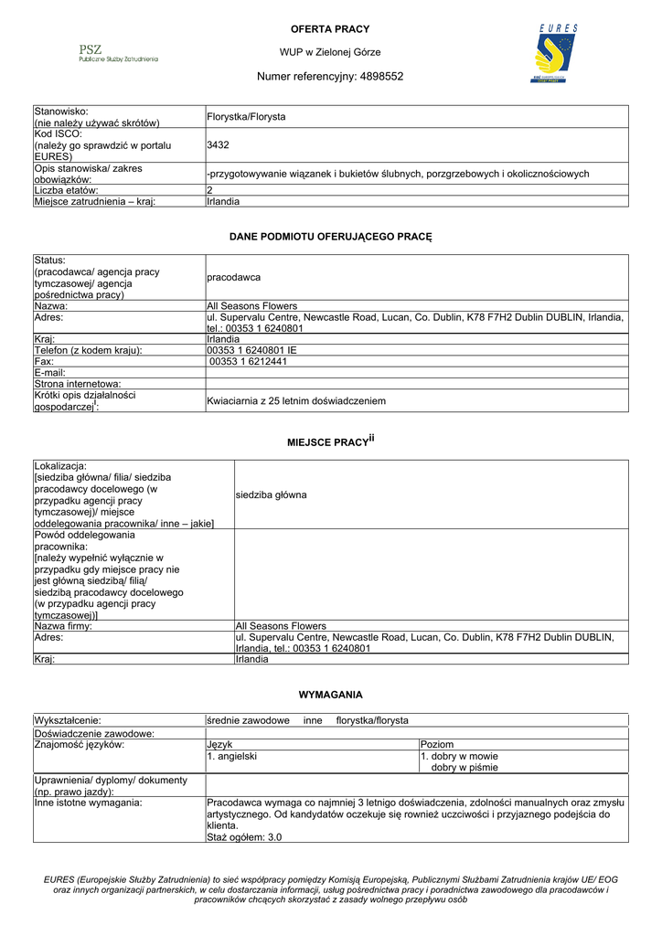 OFERTA PRACY WUP w Zielonej Górze Numer referencyjny: 4898552 Stanowisko: (nie należy używać skrótów) Kod ISCO: (należy go sprawdzić w portalu EURES) Opis stanowiska/ zakres obowiązków: Liczba etatów: Miejsce zatrudnienia – kraj: Florystka/Florysta 3432 -przygotowywanie wiązanek i bukietów ślubnych, porzgrzebowych i okolicznościowych 2 Irlandia DANE PODMIOTU OFERUJĄCEGO PRACĘ Status: (pracodawca/ agencja pracy tymczasowej/ agencja pośrednictwa pracy) Nazwa: Adres: Kraj: Telefon (z kodem kraju): Fax: E-mail: Strona internetowa: Krótki opis działalności gospodarczeji: pracodawca All Seasons Flowers ul. Supervalu Centre, Newcastle Road, Lucan, Co. Dublin, K78 F7H2 Dublin DUBLIN, Irlandia, tel.: 00353 1 6240801 Irlandia 00353 1 6240801 IE 00353 1 6212441 Kwiaciarnia z 25 letnim doświadczeniem MIEJSCE PRACYii Lokalizacja: [siedziba główna/ filia/ siedziba pracodawcy docelowego (w przypadku agencji pracy tymczasowej)/ miejsce oddelegowania pracownika/ inne – jakie] Powód oddelegowania pracownika: [należy wypełnić wyłącznie w przypadku gdy miejsce pracy nie jest główną siedzibą/ filią/ siedzibą pracodawcy docelowego (w przypadku agencji pracy tymczasowej)] Nazwa firmy: Adres: Kraj: siedziba główna All Seasons Flowers ul. Supervalu Centre, Newcastle Road, Lucan, Co. Dublin, K78 F7H2 Dublin DUBLIN, Irlandia, tel.: 00353 1 6240801 Irlandia WYMAGANIA Wykształcenie: Doświadczenie zawodowe: Znajomość języków: Uprawnienia/ dyplomy/ dokumenty (np. prawo jazdy): Inne istotne wymagania: średnie zawodowe Język 1. angielski inne florystka/florysta Poziom 1. dobry w mowie dobry w piśmie Pracodawca wymaga co najmniej 3 letnigo doświadczenia, zdolności manualnych oraz zmysłu artystycznego. Od kandydatów oczekuje się rownież uczciwości i przyjaznego podejścia do klienta. Staż ogółem: 3.0 EURES (Europejskie Służby Zatrudnienia) to sieć współpracy pomiędzy Komisją Europejską, Publicznymi Służbami Zatrudnienia krajów UE/ EOG oraz innych organizacji partnerskich, w celu dostarczania informacji, usług pośrednictwa pracy i poradnictwa zawodowego dla pracodawców i pracowników chcących skorzystać z zasady wolnego przepływu osób WYNAGRODZENIE I WARUNKI ZATRUDNIENIA Wysokość pensji brutto: Wysokość pensji netto: Waluta, w jakiej wypłacana jest pensja: Rodzaj stawki wynagrodzenia: (godzinowa/ tygodniowa/ miesięczna/ roczna/ inna) Premie: Dodatkowe świadczenia (zakwaterowanie, wyżywienie, koszty związane ze zmianą miejsca zamieszkania, koszty podróży itp.): Nazwa firmy, z którą zostanie podpisana umowa: Rodzaj umowy: (umowa o pracę, umowa zlecenia, wolontariat, praktyka zawodowa/ staż, praca zdalna, agencja pracy tymczasowej, inne): Wymiar czasu pracy (praca na pełen etat/ część etatu): Czas trwania umowy: (nieokreślony/ określony) 10,00 Liczba godzin tygodniowo: Zmiany i praca w dni wolne: Data rozpoczęcia: Inne informacje: 40,00 Praca 5 dni w tygodniu (również w weekdny) 2016-04-15 Praca 5 dni w tygodniu (również w weekndy) Euro Czasowy ze stawką godzinową Pracodawca pomaga w znalezieniu zakwaterowania. All Seasons Flowers umowa o pracę pełen etat nieokreślony Data wygaśnięcia umowy (w przypadku umowy na czas określony): SPOSÓB SKŁADANIA WNIOSKU Wymagane dokumenty (list motywacyjny, CV itp.): Język, w którym muszą być sporządzone przedkładane dokumenty: Do kogo należy wysłać dokumenty: (do pracodawcy/ doradcy EURES) Gdzie należy wysłać dokumenty: (adres, adres e-mail, nr faksu z kodem kraju itp.) Dane teleadresowe doradcy EURES lub przedstawiciela pracodawcy: (nazwisko, adres, telefon, fax, e-mail itp.) CV i krótki list motywacyjny angielski do pracodawcy dokumenty należy przesłać do pracodawcy na adres: [email protected] Osoba do kontaktu: Mary Gaynor DODATKOWE INFORMACJE WAŻNOŚĆ 2016-03-16 Data publikacji: Termin przedkładania podań o pracę / 2016-12-31 zakończenia ważności oferty: Uprzejmie informujemy, że skontaktujemy się wyłącznie z wybranymi kandydatami. UWAGA: 1. Umowa z zagranicznym pracodawcą jest zawierana, co do zasady, zgodnie z prawem kraju zatrudnienia. Oznacza to, że wszystkie roszczenia odnośnie warunków, które obejmuje umowa, można kierować wyłącznie do odpowiedniego sądu w kraju zatrudnienia. Publiczne służby zatrudnienia (EURES) nie mogą pośredniczyć ani reprezentować pracownika w sądzie kraju zatrudnienia w przypadku sporu z pracodawcą. 2. Publiczne służby zatrudnienia (EURES) dokładają wszelkich starań, aby zapewnić rzetelność i wiarygodność ofert pracy zgłoszonych w lokalnym urzędzie pracy. Należy wyjaśnić, że oferta pracy została zgłoszona przez stronę trzecią i EURES nie odpowiada za ewentualne rozbieżności między warunkami pracy określonymi w ofercie pracy i warunkami oferowanymi przez potencjalnego pracodawcę. 3. Publiczne służby zatrudnienia (EURES) informują, że będą zbierać, przetwarzać i przekazywać potencjalnym pracodawcom zgodnie z przepisami dotyczącymi ochrony danych osobowych wszystkie dane osobowe dostarczone przez osoby poszukujące pracy. EURES (Europejskie Służby Zatrudnienia) to sieć współpracy pomiędzy Komisją Europejską, Publicznymi Służbami Zatrudnienia krajów UE/ EOG oraz innych organizacji partnerskich, w celu dostarczania informacji, usług pośrednictwa pracy i poradnictwa zawodowego dla pracodawców i pracowników chcących skorzystać z zasady wolnego przepływu osób iInformacje o firmie, takie jak: status prawny, sektor, typ działalności, rodzaj produktów lub świadczonych usług, data rozpoczęcia działalności gospodarczej, liczba pracowników itp. iiMiejsce, w którym będzie wykonywana praca. Należy wypełnić w przypadku gdy: 1) miejsce wykonywania pracy jest inne niż siedziba podmiotu oferującego pracę, 2) pracę oferuje agencja pośrednictwa pracy/ agencja pracy tymczasowej. EURES (Europejskie Służby Zatrudnienia) to sieć współpracy pomiędzy