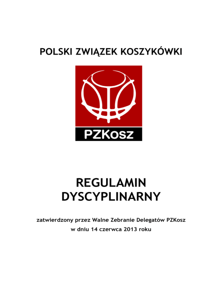 POLSKI ZWIĄZEK KOSZYKÓWKI REGULAMIN DYSCYPLINARNY zatwierdzony przez Walne Zebranie Delegatów PZKosz w dniu 14 czerwca 2013 roku ROZDZIAŁ I POSTANOWIENIA OGÓLNE § 1. 1. Niniejszy Regulamin reguluje zasady orzekania w sprawach dyscyplinarnych, rodzaje zachowań uznawanych za przewinienia dyscyplinarne a także rodzaje i wysokość kar za popełnienie czynów stanowiących przewinienia dyscyplinarne, związane z udziałem osób fizycznych i prawnych we współzawodnictwie sportowym w koszykówce, organizowanym przez Polski Związek Koszykówki (PZKosz) lub na jego zlecenie, na podstawie przepisów ustawy z dnia 25 czerwca 2010 roku o sporcie. 2. Przepisy regulaminu mają zastosowanie do wszystkich klubów, zawodników, trenerów i innych osób reprezentujących kluby sportowe lub zawodników, a także do sędziów, komisarzy i innych osób biorących udział w organizowaniu i prowadzeniu współzawodnictwa w ramach rozgrywek organizowanych przez Polski Związek Koszykówki lub na jego zlecenie. § 2. Na potrzeby niniejszego regulaminu poniższe pojęcia otrzymują następujące znaczenie: 1. klub – osoba prawna prowadząca działalność w zakresie sportu i uczestnicząca lub zamierzająca uczestniczyć we współzawodnictwie sportowym organizowanym przez PZKosz lub na jego zlecenie; 2. zawodnik – osoba fizyczna posiadająca licencję uprawniającą do uczestnictwa we współzawodnictwie sportowym w koszykówce; 2 3. zmiana barw klubowych - transfer zawodnika z jednego klubu do innego klubu niezwiązany z podpisaniem umowy o wypożyczeniu lub umowy szkoleniowej; 4. kontrakt – każda umowa, z której jednoznacznie wynika, że zawodnik lub trener zobowiązuje się do reprezentowania klubu we współzawodnictwie sportowym w koszykówce; 5. licencja klubowa – licencja wydawana klubowi, uprawniająca do udziału we współzawodnictwie sportowym w koszykówce; 6. klubowa licencja okresowa - licencja potwierdzająca uprawnienie klubu do udziału we współzawodnictwie sportowym w danym sezonie i cyklu rozgrywkowym, wydawana przez organizatora rozgrywek; 7. licencja zawodnika obywatelstwo – polskie, licencja wydawana uprawniająca do osobie fizycznej udziału we posiadającej współzawodnictwie sportowym w koszykówce; 8. licencja okresowa – licencja potwierdzająca uprawnienie zawodnika do reprezentowania określonego klubu w danym sezonie i cyklu rozgrywek wydawana przez organizatora rozgrywek; 9. sędzia – osoba fizyczna posiadająca aktualne uprawnienia do wykonywania funkcji sędziego koszykówki, wydane na podstawie przepisów PZKosz; 10. komisarz - osoba fizyczna posiadająca aktualne uprawnienia do wykonywania funkcji komisarza technicznego PZKosz, wydane na podstawie przepisów PZKosz; 11. trener - osoba fizyczna posiadająca licencję trenera wydaną na podstawie przepisów PZKosz; 12. agent – osoba fizyczna działająca w imieniu klubu, zawodnika lub trenera w sprawach dotyczących wzajemnych relacji tych podmiotów; 13. działacz – osoba fizyczna będąca we władzach klubu uczestniczącego we współzawodnictwie sportowym prowadzonym przez organizatora rozgrywek; 14. organizator rozgrywek – Polski Związek Koszykówki lub osoba prawna działająca na jego zlecenie; 15. osoba towarzysząca – osoba fizyczna posiadająca licencję osoby towarzyszącej wydaną przez organizatora rozgrywek; 3 16. dyskwalifikacja – okresowy zakaz uczestnictwa w zawodach w charakterze zawodnika, trenera, osoby towarzyszącej, sędziego wyrażony w liczbie meczów (maksymalnie 12) lub terminie (maksymalnie dożywotni) lub zakaz działalności w koszykówce; 17. rozgrywki młodzieżowe – cykle rozgrywek wymienione w § 4 ust. 1 pkt. 3 i 5 Regulaminu Współzawodnictwa Sportowego PZKosz. § 3. 1. Odpowiedzialności dyscyplinarnej podlega osoba fizyczna lub jednostka organizacyjna, która osobiście lub działając przez upoważnionych przedstawicieli popełnia czyn zabroniony pod groźbą kary dyscyplinarnej przez przepisy niniejszego regulaminu lub doprowadza do powstania skutku, z którym łączy się zagrożenie karą dyscyplinarną, w szczególności zawodnik, trener, osoba towarzysząca, sędzia, komisarz, działacz, agent, a także klub. 2. Odpowiedzialność dyscyplinarną ponoszą wszystkie osoby, o których mowa w ust. 2, jeżeli w czasie popełnienia przewinienia dyscyplinarnego podlegały odpowiedzialności, wynikającej z niniejszego Regulaminu, nawet jeżeli w czasie orzekania podstawa odpowiedzialności ustała. 3. Kara dyscyplinarna może być także orzeczona w przypadku zawinionego naruszenia przepisów prawa powszechnego lub powszechnie uznawanych i stosowanych reguł sportowej rywalizacji. 4. Kara dyscyplinarna może być wymierzona jedynie w przypadku, gdy przepisy niniejszego Regulaminu lub zasady określone przez organizatora rozgrywek wyraźnie wskazują, iż określone zachowania stanowią przewinienie dyscyplinarne i wiążą się z możliwością nałożenia kary dyscyplinarnej. 5. Organy orzekające w sprawach dyscyplinarnych przestrzegają zasady, że kara dyscyplinarna powinna być adekwatna do wagi naruszenia przepisów, za które jest wymierzana oraz do stopnia zawinienia osoby lub osób odpowiedzialnych za naruszenie przepisów. 4 6. Stroną jest każdy, czyjego interesu prawnego lub obowiązku dotyczy postępowanie dyscyplinarne albo kto żąda czynności organu dyscyplinarnego ze względu na swój interes prawny lub obowiązek. 7. Stronami mogą być osoby fizyczne i osoby prawne, w tym w szczególności kluby i organizatorzy rozgrywek w koszykówce. 8. Korespondencja w sprawie postępowania dyscyplinarnego oraz orzeczenia są doręczane stronom za pomocą dokumentów skanowanych i wysyłanych pocztą elektroniczną. W przypadku osób fizycznych posiadających licencje okresowe wydane przez PZKosz i podmioty prowadzące rozgrywki na jego zlecenie, korespondencja doręczana jest na adres e-mail klubu podany w oficjalnym zgłoszeniu do rozgrywek w