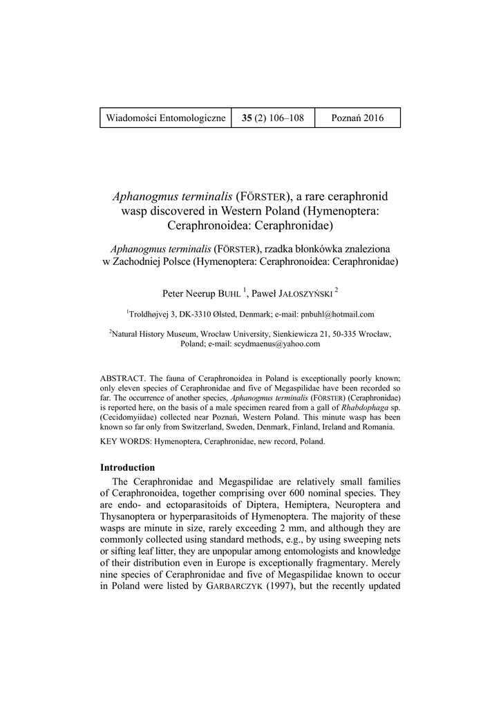 Wiadomości Entomologiczne 35 (2) 106–108 Poznań 2016 Aphanogmus terminalis (FÖRSTER), a rare ceraphronid wasp discovered in Western Poland (Hymenoptera: Ceraphronoidea: Ceraphronidae) Aphanogmus terminalis (FÖRSTER), rzadka błonkówka znaleziona w Zachodniej Polsce (Hymenoptera: Ceraphronoidea: Ceraphronidae) Peter Neerup BUHL 1, Paweł JAŁOSZYŃSKI 2 1 Troldhøjvej 3, DK-3310 Ølsted, Denmark; e-mail: [email protected] Natural History Museum, Wrocław University, Sienkiewicza 21, 50-335 Wrocław, Poland; e-mail: [email protected] 2 ABSTRACT. The fauna of Ceraphronoidea in Poland is exceptionally poorly known; only eleven species of Ceraphronidae and five of Megaspilidae have been recorded so far. The occurrence of another species, Aphanogmus terminalis (FÖRSTER) (Ceraphronidae) is reported here, on the basis of a male specimen reared from a gall of Rhabdophaga sp. (Cecidomyiidae) collected near Poznań, Western Poland. This minute wasp has been known so far only from Switzerland, Sweden, Denmark, Finland, Ireland and Romania. KEY WORDS: Hymenoptera, Ceraphronidae, new record, Poland. Introduction The Ceraphronidae and Megaspilidae are relatively small families of Ceraphronoidea, together comprising over 600 nominal species. They are endo- and ectoparasitoids of Diptera, Hemiptera, Neuroptera and Thysanoptera or hyperparasitoids of Hymenoptera. The majority of these wasps are minute in size, rarely exceeding 2 mm, and although they are commonly collected using standard methods, e.g., by using sweeping nets or sifting leaf litter, they are unpopular among entomologists and knowledge of their distribution even in Europe is exceptionally fragmentary. Merely nine species of Ceraphronidae and five of Megaspilidae known to occur in Poland were listed by GARBARCZYK (1997), but the recently updated APHANOGMUS TERMINALIS (FÖRSTER), A RARE CERAPHRONID WASP […] 107 checklist (KRZYŻYŃSKI & ULRICH 2015) comprises eleven species of Ceraphronidae and five of Megaspilidae. This is a relatively small number, compared to 28 species of Ceraphronidae and 64 Megaspilidae known in the Great Britain (BROAD & LIVERMORE 2014) Only two genera of Ceraphronidae are known to occur in Poland, Aphanogmus THOMSON, 1858 (with eight species) and Ceraphron JURINE, 1807 (with three species). Aphanogmus is known to parasitize Cecidomyiidae (Diptera) developing in galls and in prepupae and pupae of Cybocephalidae (Coleoptera); a hyperparasitic development on various other insects was also reported in this poorly known genus (EVANS et al. 2005). Interestingly, species of Aphanogmus were reported as endoparasitoids (e.g., PARNELL 1963) and ectoparasitoids (LUHMAN et al. 1999; EVANS et al. 2005), both idiobiont and koinobiont. In the present paper a record of another species of Aphanogmus is given. The voucher specimen is deposited in the collection of the second author, Wrocław, Poland. Aphanogmus terminalis (FÖRSTER, 1861) – Wielkopolsko-Kujawska Lowland: XU51 Promno ad Poznań, 23 III 2015, 1♂, reared from galls of a gall midge Rhabdophaga sp. (Diptera, Cecidomyiidae) collected from willows in marshland, adult obtained in April 2015, leg. & cult. P. JAŁOSZYŃSKI. Aphanogmus terminalis (Fig. 1) has been recorded from the following countries: Switzerland (FÖRSTER 1861) Sweden, Denmark (POLASZEK, www document), Finland (HELLÉN 1966), Ireland (BUHL & O'CONNOR 2011) and Romania (TEODORESCU 1967). Fig. 1. Aphanogmus terminalis, male. 108 P.N. BUHL, P. JAŁOSZYŃSKI STRESZCZENIE Aphanogmus terminalis, rzadka błonkówka należąca do rodziny Ceraphronidae, jest po raz pierwszy wykazana z terytorium Polski, na podstawie samca wyhodowanego z galasu Rhabdophaga sp. (Cecidomyiidae) zebranego w okolicach Poznania. Gatunek ten był wcześniej podawany tylko ze Szwajcarii, Szwecji, Danii, Finlandii, Irlandii i Rumunii. REFERENCES BROAD G.R., LIVERMORE L. 2014: Checklist of British and Irish Hymenoptera – Ceraphronoidea. Biodiversity Data Journal, 2: 1-22. BUHL P.N., O'CONNOR J.P. 2011: Nine species of Ceraphronidae (Hymenoptera: Ceraphronoidea) new to Ireland. Irish Naturalist’s Journal, 31: 126-127. EVANS G.A., DESSART P., GLENN H. 2005: Two new species of Aphanogmus (Hymenoptera: Ceraphronidae) of economic importance reared from Cybocephalus nipponicus (Coleoptera: Cybocephalidae). Zootaxa, 1018: 47-54. FÖRSTER A. 1861: Ein Tag in den Hoch-Alpen. Programm der Realschule zu Aachen für das Schuljahr 1860/61. Aachen. 44 pp. GARBARCZYK H. 1997: Ceraphronoidea, [In:] RAZOWSKI J. (ed.): Wykaz zwierząt Polski. Wyd. ISEZ PAN, Kraków, 5: 131-132. HELLÉN W. 1966: Die Ceraphroniden Finnlands (Hymenoptera Proctotrupoidea). Fauna Fennica, 20: 1-45. KRZYŻYŃSKI M., ULRICH W. 2015: Ceraphronidae and Megaspilidae (Hymenoptera: Ceraphronoidea) of Poland: current state of knowledge with corrections to the Polish checklist. Polish Entomological Journal, 84: 191-200. LUHMAN J.C., HOLZENTHAL R.W., KJAERANDSEN J.K. 1999: New host record of a ceraphronid (Hymenoptera) in Trichoptera pupae. Journal of Hymenoptera Research, 8 (1): 126. PARNELL J.R. 1963: Three gall midges (Diptera: Cecidomyidae) and their parasites found in the pods of broom (Sarothamnus scoparius (L.) WIMMER) Transactions of the Royal Entomological Society of London, 115: 261-275. POLASZEK A. Aphanogmus terminalis (Foerster, 1861). Accessed through: Fauna Europaea at http://www.faunaeur.org/full_results.php?id=67516 TEODORESCU I. 1967: Specii de Proctotrupidae (Hymenoptera – Proctotrupoidea) noi pentru fauna Romaniei. Studii si Cercetari de Biologie, Seria Zoologie, 19: 369-374.