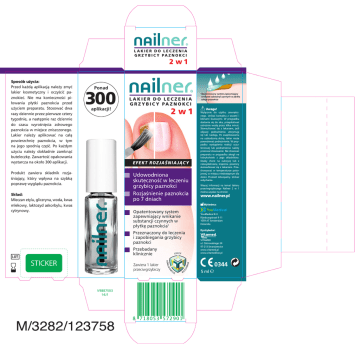 LAKIER DO LECZENIA G R Z Y B IC Y PA Z N O KC I 2 w1 Ponad 300 aplikacji! 2 w1 E F E K T R O Z JA Ś N IA JĄC Y Produkt zawiera składnik rozjaśniający, który wpływa na szybką poprawę wyglądu paznokcia. Udowodniona skuteczność w leczeniu grzybicy paznokci Rozjaśnienie paznokcia po 7 dniach Skład: Mleczan etylu, gliceryna, woda, kwas mlekowy, laktozyd askorbylu, kwas cytrynowy. Opatentowany system zapewniający wnikanie substancji czynnych w płytkę całego paznokcia 1 LAKIER DO LECZENIA G R Z Y B I C Y PA Z N O KC I Uwaga! Wyłącznie do użytku zewnętrznego. Unikać kontaktu z oczami i błonami śluzowymi. W przypadku dostania się do oka, przepłukiwać ostrożnie wodą przez kilka minut. Skonsultować się z lekarzem, jeśli objawy podrażnienia utrzymują się lub nasilają. Po zaaplikowaniu na uszkodzoną skórę, lakier może powodować podrażnienie. W przypadku wystąpienia reakcji uczuleniowej lub podrażnienia należy przerwać stosowanie. Nie stosować preparatu w przypadku alergii na którykolwiek z jego składników. Osoby chore na cukrzycę lub z niewydolnością krążenia powinny skonsultować się z lekarzem. Przechowywać w temperaturze pokojowej, w miejscu niedostępnym dla dzieci. Produkt łatwopalny. Unikać wdychania. Więcej informacji na temat lakieru przeciwgrzybiczego Nailner 2 w 1 można uzyskać na stronie: www.nailner.pl Wytwórca: Opatentowany system zapewniający wnikanie substancji czynnych w płytkę paznokcia1 YouMedical B.V. Rijnsburgstraat 9-11 1059 AT Amsterdam Holandia Dystrybutor: Przeznaczony do leczenia i zapobiegania grzybicy paznokci Przebadany klinicznie 0344 NIA AŚ DO UJ W V9887503 14J1 L ECZY ODBU Zawiera 1 lakier przeciwgrzybiczy VITAMED ul. Ostrowskiego 24 97-213 Smardzewice www.vitamed.pl www.vitamedlive.pl ZJ Sposób użycia: Przed każdą aplikacją należy zmyć lakier kosmetyczny i oczyścić paznokieć. Nie ma konieczności piłowania płytki paznokcia przed użyciem preparatu. Stosować dwa razy dziennie przez pierwsze cztery tygodnie, a następnie raz dziennie do czasu wyrośnięcia zdrowego paznokcia w miejsce zniszczonego. Lakier należy aplikować na całą powierzchnię paznokcia, w tym na jego spodnią część. Po każdym użyciu należy dokładnie zamknąć buteleczkę. Zawartość opakowania wystarcza na około 300 aplikacji. E RO 5 ml SZTYFT DO LECZENIA GRZYBICY PAZNOKCI Opatentowany system zapewniający wnikanie substancji czynnych w płytkę paznokcia 1 SZTYFT DO LECZENIA G R Z Y B I C Y PA Z N O KC I Ponad 400 aplikacji ! Wytwórca: Udowodniona skuteczność w leczeniu grzybicy paznokci YouMedical B.V. Rijnsburgstraat 9-11, 1059 AT Amsterdam, Holandia Dystrybutor: Opatentowany system zapewniający wnikanie substancji czynnych w płytkę paznokcia1 Przeznaczony do leczenia i zapobiegania grzybicy paznokci Skład: Mleczan etylu, woda, gliceryna, kwas mlekowy, kwas cytrynowy. L ECZY 0344 BI GN ZAPO UJE Przebadany klinicznie Zawiera 1 sztyft VITAMED ul. Ostrowskiego 24 97-213 Smardzewice www.vitamed.pl www.vitamedlive.pl E G A 4 ml LĘ Box Nailner Pen 2.0 76 x 128,5 x 26 mm PI E V9904565 14E2 Sposób użycia: Przed każdą aplikacją należy oczyścić paznokieć i zmyć lakier kosmetyczny. Nie ma konieczności piłowania płytki paznokcia przed użyciem preparatu. Stosować dwa razy dziennie przez pierwsze cztery tygodnie, a następnie raz dziennie do czasu wyrośnięcia zdrowego paznokcia w miejsce zniszczonego. Preparat należy aplikować na całą powierzchnię paznokcia, w tym na jego spodnią część. Nie wywierać dodatkowego nacisku podczas stosowania. Po każdym użyciu należy dokładnie zamknąć sztyft nasadką. Zawartość opakowania wystarcza na około 400 aplikacji. Sztyft Nailner można także stosować profilaktycznie. W celu zapobiegania zakażeniom grzybiczym paznokci należy używać raz dziennie. Uwaga! Wyłącznie do użytku zewnętrznego. Unikać kontaktu z oczami i błonami śluzowymi. Nie stosować preparatu w przypadku alergii na którykolwiek z jego składników. W przypadku wystąpienia reakcji uczuleniowej należy przerwać stosowanie. Przechowywać w temperaturze pokojowej, w miejscu niedostępnym dla dzieci. Więcej informacji na temat sztyftu Nailner można uzyskać na stronie: www.nailner.pl