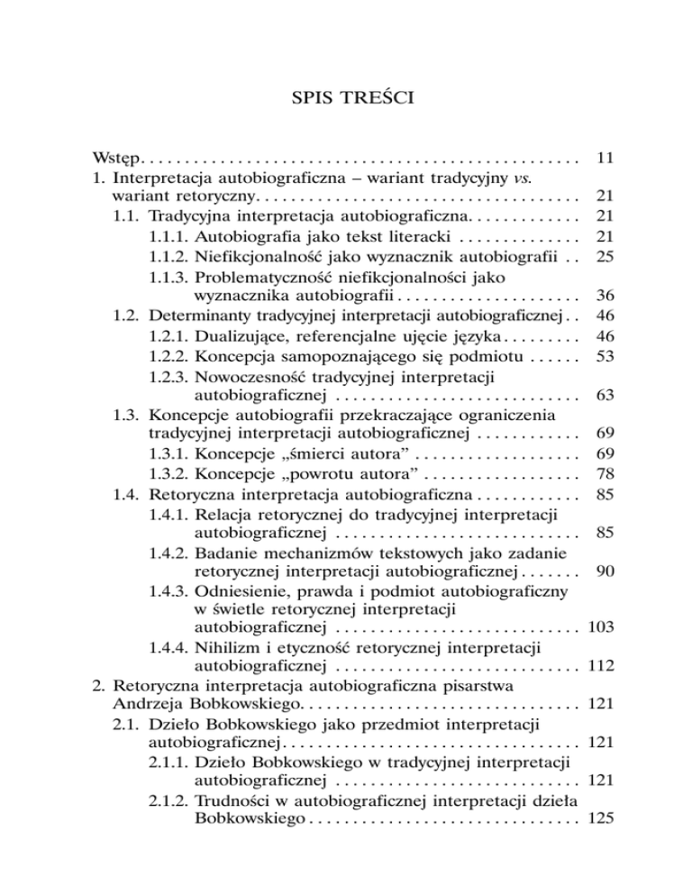 Spis treści Wstęp . . . . . . . . . . . . . . . . . . . . . . . . . . . . . . . . . . . . . . . . . . . . . . . . . . 11 1.Interpretacja autobiograficzna – wariant tradycyjny vs. wariant retoryczny . . . . . . . . . . . . . . . . . . . . . . . . . . . . . . . . . . . . . 21 1.1.Tradycyjna interpretacja autobiograficzna . . . . . . . . . . . . . 21 1.1.1.Autobiografia jako tekst literacki . . . . . . . . . . . . . . . 21 1.1.2.Niefikcjonalność jako wyznacznik autobiografii . . . 25 1.1.3.Problematyczność niefikcjonalności jako wyznacznika autobiografii . . . . . . . . . . . . . . . . . . . . . 36 1.2. Determinanty tradycyjnej interpretacji autobiograficznej . . 46 1.2.1.Dualizujące, referencjalne ujęcie języka . . . . . . . . . 46 1.2.2.Koncepcja samopoznającego się podmiotu . . . . . . . 53 1.2.3.Nowoczesność tradycyjnej interpretacji autobiograficznej . . . . . . . . . . . . . . . . . . . . . . . . . . . . . 63 1.3. Koncepcje autobiografii przekraczające ograniczenia tradycyjnej interpretacji autobiograficznej . . . . . . . . . . . . . 69 1.3.1.Koncepcje „śmierci autora” . . . . . . . . . . . . . . . . . . . . 69 1.3.2.Koncepcje „powrotu autora” . . . . . . . . . . . . . . . . . . . 78 1.4.Retoryczna interpretacja autobiograficzna . . . . . . . . . . . . . 85 1.4.1.Relacja retorycznej do tradycyjnej interpretacji autobiograficznej . . . . . . . . . . . . . . . . . . . . . . . . . . . . . 85 1.4.2.Badanie mechanizmów tekstowych jako zadanie retorycznej interpretacji autobiograficznej . . . . . . . 90 1.4.3.Odniesienie, prawda i podmiot autobiograficzny w świetle retorycznej interpretacji autobiograficznej . . . . . . . . . . . . . . . . . . . . . . . . . . . . . 103 1.4.4.Nihilizm i etyczność retorycznej interpretacji autobiograficznej . . . . . . . . . . . . . . . . . . . . . . . . . . . . . 112 2.Retoryczna interpretacja autobiograficzna pisarstwa Andrzeja Bobkowskiego . . . . . . . . . . . . . . . . . . . . . . . . . . . . . . . . 121 2.1. Dzieło Bobkowskiego jako przedmiot interpretacji autobiograficznej . . . . . . . . . . . . . . . . . . . . . . . . . . . . . . . . . . 121 2.1.1.Dzieło Bobkowskiego w tradycyjnej interpretacji autobiograficznej . . . . . . . . . . . . . . . . . . . . . . . . . . . . . 121 2.1.2.Trudności w autobiograficznej interpretacji dzieła Bobkowskiego . . . . . . . . . . . . . . . . . . . . . . . . . . . . . . . 125 8 Spis treści 2.1.3.Romantyczny rodowód pisarstwa Bobkowskiego . . . 132 2.2. Autobiograficzny podmiot w transakcji z naturą . . . . . . . 138 2.2.1.Dziecięctwo autobiograficznego podmiotu . . . . . . . 138 2.2.2.Sprzeciw autobiograficznego podmiotu wobec „kartezjańskiej dialektyki” . . . . . . . . . . . . . . . . . . . . . 142 2.2.3.Metafora jako figura autobiograficznego podmiotu (I) – epifania więzi z naturą . . . . . . . . . . 149 2.2.4.Metafora jako figura autobiograficznego podmiotu (II) – zachwianie epifanicznej równowagi . . . . . . . . . . . . . . . . . . . . . . . . . . . . . . . . . . . 162 2.3. Autobiograficzny podmiot w poszukiwaniu autentyczności . . . . . . . . . . . . . . . . . . . . . . . . . . . . . . . . . . . . . 173 2.3.1.Autentyczność jako romantyczna idea w pisarstwie Bobkowskiego . . . . . . . . . . . . . . . . . . . . 173 2.3.2.Dygresja metodologiczna . . . . . . . . . . . . . . . . . . . . . . 183 2.3.3.Ironia jako figura autobiograficznego podmiotu – wyzwanie egzotyczności . . . . . . . . . . . . . . . . . . . . . . . 187 2.3.4.Zahamowanie ironii jako figury autobiograficznego podmiotu – autentyczny kolonizator . . . . . . . . . . . . . . 200 2.4. Autobiograficzny podmiot w potrzebie metafizycznego punktu oparcia . . . . . . . . . . . . . . . . . . . . . . . . . . . . . . . . . . . . 210 2.4.1.Punkt oparcia w przeszłości . . . . . . . . . . . . . . . . . . . . 210 2.4.2.Symbol jako figura autobiograficznego podmiotu – punkt oparcia w wymiarze transcendencji . . . . . . 215 2.4.3.Destabilizacja symbolu jako figury autobiograficznego podmiotu (I) – nicość i swojskość zaświatów . . . . . . . . . . . . . . . . . . . . . . . . . 225 2.4.4.Destabilizacja symbolu jako figury autobiograficznego podmiotu (II) – ziemska strona transcendencji . . . . . . . . . . . . . . . . . . . . . . . . . 233 3.Retoryczna interpretacja autobiograficzna pisarstwa Zygmunta Haupta . . . . . . . . . . . . . . . . . . . . . . . . . . . . . . . . . . . . . 245 3.1. Dzieło Haupta jako przedmiot interpretacji autobiograficznej . . . . . . . . . . . . . . . . . . . . . . . . . . . . . . . . . . 245 3.1.1.Dzieło Haupta w tradycyjnej interpretacji autobiograficznej . . . . . . . . . . . . . . . . . . . . . . . . . . . . . 245 3.1.2.Trudności w autobiograficznej interpretacji dzieła Haupta . . . . . . . . . . . . . . . . . . . . . . . . . . . . . . . . . . . . . 250 3.1.3.Modernistyczny rodowód pisarstwa Haupta . . . . . . 256 Spis treści 9 3.2. Autobiograficzny podmiot w patogennej melancholii . . . 262 3.2.1.Nostalgia a melancholia w pisarstwie Haupta . . . . 262 3.2.2.Melancholiczny świat przedstawiony . . . . . . . . . . . . 266 3.2.3.Melancholiczny związek autobiograficznego podmiotu i utraconego . . . . . . . . . . . . . . . . . . . . . . . . 276 3.2.4.Figury detrakcji autobiograficznego podmiotu – redukcja Ja . . . . . . . . . . . . . . . . . . . . . . . . . . . . . . . . . . 283 3.3. Autobiograficzny podmiot w fantazmatycznej fazie autoterapii . . . . . . . . . . . . . . . . . . . . . . . . . . . . . . . . . . . . . . . . 294 3.3.1.Wyobraźnia – nadzieja dla melancholika . . . . . . . . 294 3.3.2.Wspomnienie-wyobrażenie (I) – zwiększanie dystansu autobiograficznego podmiotu do utraconego . . . . . . . . . . . . . . . . . . . . . . . . . . . . . . . . . . 301 3.3.3.Wspomnienie-wyobrażenie (II) – zmniejszanie dystansu autobiograficznego podmiotu do utraconego . . . . . . . . . . . . . . . . . . . . . . . . . . . . . . . . . . 312 3.3.4.Alegoria jako figura autobi