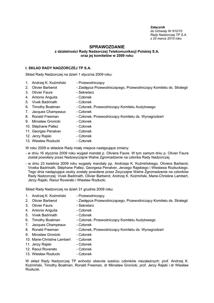 Załącznik do Uchwały Nr 610/10 Rady Nadzorczej TP S.A. z 25 marca 2010 roku SPRAWOZDANIE z działalności Rady Nadzorczej Telekomunikacji Polskiej S.A. oraz jej komitetów w 2009 roku I. SKŁAD RADY NADZORCZEJ TP S.A. Skład Rady Nadzorczej na dzień 1 stycznia 2009 roku: 1. 2. 3. 4. 5. 6. 7. 8. 9. 10. 11. 12. 13. Andrzej K. Koźmiński Olivier Barberot Olivier Faure Antonio Anguita Vivek Badrinath Timothy Boatman Jacques Champeaux Ronald Freeman Mirosław Gronicki Stéphane Pallez Georges Penalver Jerzy Rajski Wiesław Rozłucki - Przewodniczący - Zastępca Przewodniczącego, Przewodniczący Komitetu ds. Strategii - Sekretarz - Członek - Członek - Członek, Przewodniczący Komitetu Audytowego - Członek - Członek, Przewodniczący Komitetu ds. Wynagrodzeń - Członek - Członek - Członek - Członek - Członek W roku 2009 w składzie Rady miały miejsce następujące zmiany: - w dniu 16 stycznia 2009 roku wygasł mandat p. Oliviera Faure. W tym samym dniu p. Olivier Faure został powołany przez Nadzwyczajne Walne Zgromadzenie na członka Rady Nadzorczej. - w dniu 23 kwietnia 2009 roku wygasły mandaty pp. Andrzeja K. Koźmińskiego, Oliviera Barberot, Viveka Badrinath, Stéphane Pallez, Georgesa Penalver, Jerzego Rajskiego i Wiesława Rozłuckiego. Tego dnia następujące osoby zostały powołane przez Zwyczajne Walne Zgromadzenie na członków Rady Nadzorczej: Vivek Badrinath, Olivier Barberot, Andrzej K. Koźmiński, Marie-Christine Lambert, Jerzy Rajski, Raoul Roverato i Wiesław Rozłucki. Skład Rady Nadzorczej na dzień 31 grudnia 2009 roku: 1. 2. 3. 4. 5. 6. 7. 8. 9. 10. 11. 12. 13. Andrzej K. Koźmiński Olivier Barberot Olivier Faure Antonio Anguita Vivek Badrinath Timothy Boatman Jacques Champeaux Ronald Freeman Mirosław Gronicki Marie-Christine Lambert Jerzy Rajski Raoul Roverato Wiesław Rozłucki - Przewodniczący - Zastępca Przewodniczącego, Przewodniczący Komitetu ds. Strategii - Sekretarz - Członek - Członek - Członek, Przewodniczący Komitetu Audytowego - Członek - Członek, Przewodniczący Komitetu ds. Wynagrodzeń - Członek - Członek - Członek - Członek - Członek W skład Rady Nadzorczej TP wchodzi obecnie sześciu członków niezależnych: prof. Andrzej K. Koźmiński, Timothy Boatman, Ronald Freeman, dr Mirosław Gronicki, prof. Jerzy Rajski i dr Wiesław Rozłucki. Sprawozdanie z działalności Rady Nadzorczej TP S.A. oraz jej komitetów w roku 2009 2 Działają trzy stałe komitety, których skład na dzień 31 grudnia 2009 roku przedstawiał się następująco: - Komitet Audytowy: Timothy Boatman – Przewodniczący, Olivier Faure, Ronald Freeman i MarieChristine Lambert - członkowie; - Komitet ds. Wynagrodzeń: Ronald Freeman – Przewodniczący, Olivier Barberot, Jacques Champeaux i Wiesław Rozłucki - członkowie; - Komitet ds. Strategii: Olivier Barberot – Przewodniczący, Jacques Champeaux, Olivier Faure, Mirosław Gronicki i Jerzy Rajski - członkowie. II. DZIAŁALNOŚĆ Rada Nadzorcza TP S.A., działając zgodnie z postanowieniami Kodeksu spółek handlowych i Statutem Spółki, sprawowała stały nadzór nad działalnością Spółki we wszystkich dziedzinach jej działalności. W 2009 roku Rada Nadzorcza TP S.A. wykonała obowiązki wynikające z Kodeksu spółek handlowych: 1) dokonała oceny sprawozdanie Zarządu z działalności Spółki, sprawozdanie finansowe za rok obrotowy 2008 oraz wniosków Zarządu dotyczących podziału zysku Spółki, 2) dokonała oceny sprawozdanie Zarządu z działalności Grupy Kapitałowej Telekomunikacja Polska oraz skonsolidowanego sprawozdanie finansowego za rok obrotowy 2008, 3) złożyła Walnemu Zgromadzeniu sprawozdania z wyników powyższej oceny. Rada Nadzorcza dołożyła należytych starań w celu zapewnienia by sprawozdanie finansowe oraz sprawozdanie z działalności Spółki spełniały wymagania przewidziane prawem. Rada Nadzorcza TP S.A. wykonywała także prawa i obowiązki wynikające ze Statutu TP S.A. i Kodeksu Dobrych Praktyk, wśród których należy wymienić: 1) powołanie członków Zarządu, 2) wyrażanie opinii dotyczących wniosków kierowanych pod obrady Walnego Zgromadzenia, w tym wniosku o zmianę Statutu Spółki, 3) wybór biegłego rewidenta do przeprowadzenia badania sprawozdań finansowych Spółki, 4) wyrażenie opinii dotyczącej budżetu Telekomunikacji Polskiej S.A. i Grupy TP, 5) nadzór nad realizacją celów operacyjnych i finansowych Grupy TP, 6) wyrażenie opinii dotyczącej zaciągnięcia zobowiązań przekraczających równowartość 100 mln EURO, 7) sporządzenie zwięzłej oceny sytuacji Grupy TP. W 2009 roku, działalność Rady Nadzorczej oraz jej stałych komitetów koncentrowała się na następujących zagadnieniach: a) wyniki finansowe i operacyjne Grupy TP w odniesieniu do budżetu, b) strategia Grupy TP w warunkach rosnącej konkurencji i globalnego kryzysu, c) porozumienie z Prezesem Urzędu Komunikacji Elektronicznej, d) zmiany w składzie Zarządu, e) program emisji obligacji EMTN, f) program optymalizacji kosztów, g) satysfakcja klienta, h) program optymalizacji portfela nieruchomości. W 2009 roku Rada Nadzorcza TP S.A. odbyła 10 posiedzeń i podjęła 38 uchwał, w tym 1 w trybie pisemnym (korespondencyjnym). W swojej działalności Rada Nadzorcza korzystała z opinii przekazywanych przez Komitet Audytowy, Komitet ds. Wynagrodzeń i Komitet ds. Strategii. Sprawozdanie z działalności Rady Nadzorczej TP S.A. oraz jej komitetów w roku 2009 3 Sprawozdania z działalności komitetów Rady Nadzorczej: Audytowego, ds. Wynagrodzeń oraz ds. Strategii, stanowią odpowiednio załączniki nr 1, 2 i 3. Rada Nadzorcza sformułowała szereg zaleceń, uwag i wniosków dla Zarządu, odnoszących się do różnych aspektów działalności Spółki. Rada Nadzorcza na bieżąco nadzorowała wykonanie swoich uchwał i zaleceń, analizując informacje przedstawiane przez Zarząd na kolejnych posiedzeniach. III. OCENA PRACY RADY NADZORCZEJ Uwzględniaj