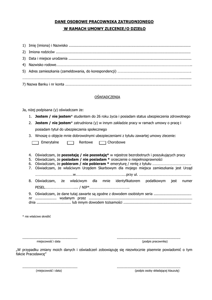DANE OSOBOWE PRACOWNIKA ZATRUDNIONEGO W RAMACH UMOWY ZLECENIE/O DZIEŁO 1) Imię (imiona) i Nazwisko ................................................................................................................. 2) Imiona rodziców ............................................................................................................................. 3) Data i miejsce urodzenia .................................................................................................................. 4) Nazwisko rodowe………………………………………………………………………………………………………………………….. 5) Adres zamieszkania (zameldowania, do korespondencji) …………………………………………………………………. ………………………………………………………………………………………………………………………………………………........... 7) Nazwa Banku i nr konta …………………………………………………………………………………………………………………. OŚWIADCZENIA Ja, niżej podpisana (y) oświadczam że: 1. Jestem / nie jestem* studentem do 26 roku życia i posiadam status ubezpieczenia zdrowotnego 2. Jestem / nie jestem* zatrudniona (y) w innym zakładzie pracy w ramach umowy o pracę i posiadam tytuł do ubezpieczenia społecznego 3. Wnoszę o objęcie mnie dobrowolnymi ubezpieczeniami z tytułu zawartej umowy zlecenie: Emerytalne 4. 5. 6. 7. Oświadczam, Oświadczam, Oświadczam, Oświadczam, Rentowe Chorobowe że pozostaję / nie pozostaję* w rejestrze bezrobotnych i poszukujących pracy że posiadam / nie posiadam * orzeczenie o niepełnosprawności że pobieram / nie pobieram * emeryturę / rentę z tytułu …………………………………. że właściwym Urzędem Skarbowym dla mojego miejsca zamieszkania jest Urząd …………………………………w………………………………………….…przy ul. ……………………………………………… 8. Oświadczam, że właściwym dla mnie identyfikatorem podatkowym jest numer PESEL………………………….... / NIP*………………………………….. 9. Oświadczam, że dane tutaj zawarte są zgodne z dowodem osobistym seria ................................... nr .................... wydanym przez ................................................................................................ dnia ................................ lub innym dowodem tożsamości ............................................................... * nie właściwe skreślić ................................................... miejscowość i data ........................................................... (podpis pracownika) „W przypadku zmiany moich danych i oświadczeń zobowiązuję się niezwłocznie pisemnie powiadomić o tym fakcie Pracodawcę” ................................................... (miejscowość i data) ........................................................... (podpis osoby składającej klauzulę)