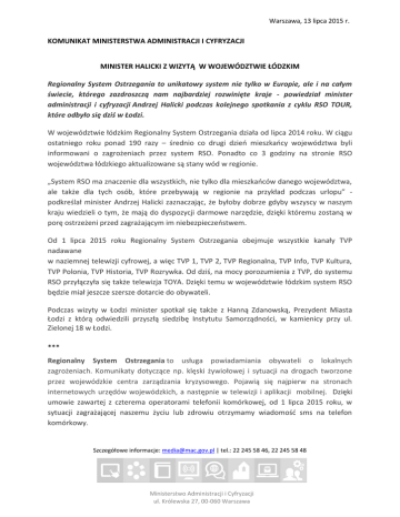 Warszawa, 13 lipca 2015 r. KOMUNIKAT MINISTERSTWA ADMINISTRACJI I CYFRYZACJI MINISTER HALICKI Z WIZYTĄ W WOJEWÓDZTWIE ŁÓDZKIM Regionalny System Ostrzegania to unikatowy system nie tylko w Europie, ale i na całym świecie, którego zazdroszczą nam najbardziej rozwinięte kraje - powiedział minister administracji i cyfryzacji Andrzej Halicki podczas kolejnego spotkania z cyklu RSO TOUR, które odbyło się dziś w Łodzi. W województwie łódzkim Regionalny System Ostrzegania działa od lipca 2014 roku. W ciągu ostatniego roku ponad 190 razy – średnio co drugi dzień mieszkańcy województwa byli informowani o zagrożeniach przez system RSO. Ponadto co 3 godziny na stronie RSO województwa łódzkiego aktualizowane są stany wód w regionie. „System RSO ma znaczenie dla wszystkich, nie tylko dla mieszkańców danego województwa, ale także dla tych osób, które przebywają w regionie na przykład podczas urlopu” podkreślał minister Andrzej Halicki zaznaczając, że byłoby dobrze gdyby wszyscy w naszym kraju wiedzieli o tym, że mają do dyspozycji darmowe narzędzie, dzięki któremu zostaną w porę ostrzeżeni przed zagrażającym im niebezpieczeństwem. Od 1 lipca 2015 roku Regionalny System Ostrzegania obejmuje wszystkie kanały TVP nadawane w naziemnej telewizji cyfrowej, a więc TVP 1, TVP 2, TVP Regionalna, TVP Info, TVP Kultura, TVP Polonia, TVP Historia, TVP Rozrywka. Od dziś, na mocy porozumienia z TVP, do systemu RSO przyłączyła się także telewizja TOYA. Dzięki temu w województwie łódzkim system RSO będzie miał jeszcze szersze dotarcie do obywateli. Podczas wizyty w Łodzi minister spotkał się także z Hanną Zdanowską, Prezydent Miasta Łodzi z którą odwiedzili przyszłą siedzibę Instytutu Samorządności, w kamienicy przy ul. Zielonej 18 w Łodzi. *** Regionalny System Ostrzegania to usługa powiadamiania obywateli o lokalnych zagrożeniach. Komunikaty dotyczące np. klęski żywiołowej i sytuacji na drogach tworzone przez wojewódzkie centra zarządzania kryzysowego. Pojawią się najpierw na stronach internetowych urzędów wojewódzkich, a następnie w telewizji i aplikacji mobilnej. Dzięki umowie zawartej z czterema operatorami telefonii komórkowej, od 1 lipca 2015 roku, w sytuacji zagrażającej naszemu życiu lub zdrowiu otrzymamy wiadomość sms na telefon komórkowy. Szczegółowe informacje: [email protected] | tel.: 22 245 58 46, 22 245 58 48 Ministerstwo Administracji i Cyfryzacji ul. Królewska 27, 00-060 Warszawa Więcej informacji: https://mac.gov.pl/projekty/regionalny-system-ostrzegania-rso; http://lodz.uw.gov.pl/page/3509,komunikaty-rso.html. Artur Koziołek rzecznik prasowy MAC Ministerstwo Administracji i Cyfryzacji ul. Królewska 27, 00-060 Warszawa
