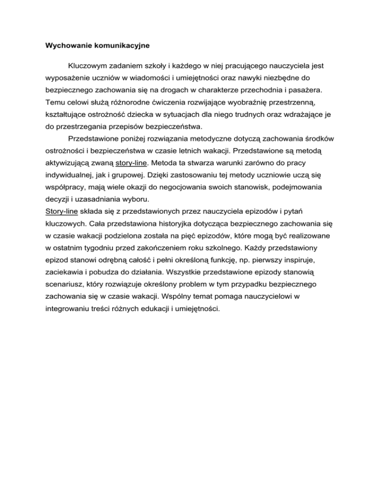 Wychowanie komunikacyjne Kluczowym zadaniem szkoły i każdego w niej pracującego nauczyciela jest wyposażenie uczniów w wiadomości i umiejętności oraz nawyki niezbędne do bezpiecznego zachowania się na drogach w charakterze przechodnia i pasażera. Temu celowi służą różnorodne ćwiczenia rozwijające wyobraźnię przestrzenną, kształtujące ostrożność dziecka w sytuacjach dla niego trudnych oraz wdrażające je do przestrzegania przepisów bezpieczeństwa. Przedstawione poniżej rozwiązania metodyczne dotyczą zachowania środków ostrożności i bezpieczeństwa w czasie letnich wakacji. Przedstawione są metodą aktywizującą zwaną story-line. Metoda ta stwarza warunki zarówno do pracy indywidualnej, jak i grupowej. Dzięki zastosowaniu tej metody uczniowie uczą się współpracy, mają wiele okazji do negocjowania swoich stanowisk, podejmowania decyzji i uzasadniania wyboru. Story-line składa się z przedstawionych przez nauczyciela epizodów i pytań kluczowych. Cała przedstawiona historyjka dotycząca bezpiecznego zachowania się w czasie wakacji podzielona została na pięć epizodów, które mogą być realizowane w ostatnim tygodniu przed zakończeniem roku szkolnego. Każdy przedstawiony epizod stanowi odrębną całość i pełni określoną funkcję, np. pierwszy inspiruje, zaciekawia i pobudza do działania. Wszystkie przedstawione epizody stanowią scenariusz, który rozwiązuje określony problem w tym przypadku bezpiecznego zachowania się w czasie wakacji. Wspólny temat pomaga nauczycielowi w integrowaniu treści różnych edukacji i umiejętności. Epizod I Niedługo wakacje Nauczyciel pokazuje kalendarz – czerwiec 2005 rok Pytanie kluczowe: 1. Kiedy rozpoczynają się wakacje? 2. Po co są wakacje? 3. Gdzie będziesz spędzać wakacje? 4. O czym należy pamiętać, aby bezpiecznie wrócić po wakacjach do domu i szkoły? 5. Czego nie wolno robić? Proponowane formy aktywności: ćwiczenia z kalendarzem – pisanie dat, wspólne układanie i redagowanie zakazów, pisanie swobodnych tekstów nt. wakacyjnych przygód, wykonanie ilustracji nt. wakacyjnych zabaw, redagowanie haseł na gazetkę szkolną dotyczącą tematu „O czym należy pamiętać w czasie letnich wakacji?”, swobodne wypowiedzi dzieci nt. spędzania wolnego czasu oraz ulubionych zabaw. Epizod II Niebezpieczne zabawy w pobliżu jezdni Wysłuchanie nagrania, w którym słychać odgłosy z ulicy: przejeżdżające samochody, pisk hamulców, sygnał pogotowia ratunkowego, płacz dziecka: boli, boli, rozmowy przechodniów: co się stało, czy muszą się bawić w pobliżu ulicy? Pytanie kluczowe: 1. W jaki sposób doszło do wypadku? 2. Czy można było uniknąć tego przykrego wydarzenia? 3. Czy wypadek mógł się zakończyć inaczej? 4. Dlaczego dzieci giną w wypadkach drogowych? Proponowane formy aktywności: • zapisywanie numerów alarmowych, • układanie zadań z rozsypanki wyrazowej • przeprowadzenie rozmów telefonicznych (wzywanie pomocy), • wspólne układanie i pisanie zdań n/t wysłuchanego nagrania, • uzupełnianie luk w tekście, • swobodne dłuższe wypowiedzi dzieci dotyczące dalszego ciągu przygód dziecka, które wpadło pod samochód. Epizod III Droga zatrzymania się pojazdu Obserwacja eksperymentu. Umówiony kierowca wykonuje na boisku hamowanie przy prędkości ok. 50 km/godz. Uczniowie obserwują, jaki odcinek drogi pojazd przejechał do całkowitego zahamowania. Pytania kluczowe: 1. Dlaczego kierowca natychmiast nie zatrzymał jadącego pojazdu? 2. Od czego zależy długość drogi hamowania pojazdu? 3. Dlaczego nie można wbiegać na ulicę, jezdnię? 4. Dlaczego trzeba być widocznym w ruchu ulicznym? Proponowane formy aktywności: wspólne redagowanie zadań rozkazujących, wyciągnięcie i zapisanie wniosku, wykonanie ilustracji „Zabawy dzieci w bezpiecznym miejscu”, pisanie rad dla młodszych kolegów. Epizod IV Podróżowanie Wesoły pociąg Już parowóz para pyka „Proszę wsiadać. Drzwi zamykać” Opuszczamy pierwszą stację Odjeżdżamy na wakacje! Oraz prędzej mkną wagony Każdy wagon natłoczony Trzy siostrzyczki w sukniach w ciapki Jadą z babcią aż do Rabki. Kazik, Jurek i Helenka Jadą z mamą do Krościenka. A w oddzielnych trzech przedziałach Jedzie nasza klasa cała. Na kolonie nad Dunajcem ślicznie będzie tam jak w bajce. O, już widać pierwsze wzgórza! Pędzi pociąg, mija stacje, Na wakacje, na wakacje! Maria Terlikowska Pytania kluczowe: 1. Jakie znasz inne środki lokomocji? 2. Jak należy zachować się w czasie podróżowania pociągiem? 3. Jak należy zachować się na przystanku w czasie oczekiwania na autobus? 4. Jak należy zachować się w autobusie? Proponowane formy aktywności: swobodne rozmowy na temat środków lokomocji, którymi poruszały się dzieci, wspólne układanie i pisanie zdań nt. bezpiecznego zachowania się w autobusie lub pociągu, wykonanie wystawki pt. „Środki lokomocji” z miniaturek różnych pojazdów, uzupełnianie luk w zdaniach, omawianie ilustracji dotyczących bezpiecznego zachowania się w różnych środkach lokomocji. Epizod V Wakacyjne życzenia Życzenia zapisane na tablicy od nauczyciela: Życzę Wam: radości, uśmiechu, pogody, wielu przygód, zdrowia. Chciałbym, aby wszystkie dzieci wróciły wypoczęte i zdrowe. Pytania kluczowe: 1. O czym musicie pamiętać, aby moje życzenia się sprawdziły? 2. Jakie macie plany wakacyjne? Proponowane formy aktywności: wspólne lub indywidualne redagowanie zdań nt. „Bezpiecznie bawimy się w czasie wakacji”, pokaz ilustracji przedstawiających właściwe i niewłaściwe zachowanie się dzieci w różnych sytuacjach, swobodne wypowiedzi dzieci nt. planów wakacyjnych i bezpiecznego spędzania wakacji, zachowanie się w różnych sytuacjach podczas wakacji: w lesie, nad wodą, w górach, na wsi, w dużym mieście.