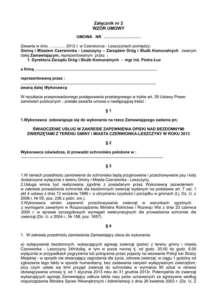 Załącznik nr 2 WZÓR UMOWY UMOWA NR ………………………. Zawarta w dniu …........... 2012 r. w Czerwionce - Leszczynach pomiędzy: Gminą i Miastem Czerwionka - Leszczyny – Zarządem Dróg i Służb Komunalnych zwanym dalej Zamawiającym, reprezentowanym przez : 1. Dyrektora Zarządu Dróg i Służb Komunalnych - mgr inż. Piotra Łuc a firmą ….......................................................................................................... reprezentowaną przez : …...................................................................................................................... zwaną dalej Wykonawcą W rezultacie przeprowadzonego postępowania przetargowego w trybie art. 39 Ustawy Prawo zamówień publicznych - została zawarta umowa o następującej treści : §1 1.Wykonawca zobowiązuje się do wykonania na rzecz Zamawiającego zadania pn; ŚWIADCZENIE USŁUG W ZAKRESIE ZAPEWNIENIA OPIEKI NAD BEZDOMNYMI ZWIERZĘTAMI Z TERENU GMINY i MIASTA CZERWIONKA-LESZCZYNY W ROKU 2013 §2 Wykonawca oświadcza, iż prowadzi schronisko położone w : ................................................................................................................................ §3 1.W ramach przedmiotu zamówienia do schroniska będą przyjmowane i przechowywane psy i koty dostarczone wyłącznie z terenu Gminy i Miasta Czerwionka - Leszczyny. 2.Usługa winna być realizowana zgodnie z posiadanym przez Wykonawcę zezwoleniem w zakresie prowadzenia schronisk dla bezdomnych zwierząt wydanym na podstawie art. 7 ust. 1 pkt 4 ustawy z dnia 13 września 1996 r. o utrzymaniu czystości i porządku w gminach (t.j. Dz. U. z 2008 r. Nr 05, poz. 236 z późn. zm.). 3.Wykonawca winien zapewnić przechowywanie zwierząt w warunkach zgodnych z wymogami zawartymi w Rozporządzeniu Ministra Rolnictwa i Rozwoju Wsi z dnia 23 czerwca 2004 r. w sprawie szczegółowych wymagań weterynaryjnych dla prowadzenia schronisk dla zwierząt (Dz. U. z 2004 r., Nr 158, poz. 1657). §4 1. W zakresie przedmiotu zamówienia Zamawiający zleca do wykonania: a) wyłapywanie bezdomnych, wykazujących agresję zwierząt (psów) z terenu gminy i miasta Czerwionka - Leszczyny 24h/dobę, w tym w porze nocnej tj. od godz. 20.00 do godz. 6.00 wyłącznie w przypadkach pogryzienia lub potrącenia przez pojazdy na wezwanie Policji lub Straży Miejskiej - w sposób nie stwarzający zagrożenia dla życia, zdrowia zwierząt, w ciągu 1 godziny od zgłoszenia tego faktu w sposób humanitarny, bez zadawania cierpień wyłapywanym zwierzętom, przy czym ustala się limit przyjęć zwierząt do schroniska w wymiarze 90 sztuk w okresie obowiązywania umowy tj. od 1 stycznia 2013 roku do 31 grudnia 2013r. Potencjalnie do zwierząt wykazujących agresję Zamawiający zalicza także rasy psów uznawanych za agresywne według rozporządzenia Ministra Spraw Wewnętrznych i Administracji z dnia 26 kwietnia 2003 r. (Dz. U. Z dnia 8 maja 2003 r.) b) dowóz do schroniska zwierząt, o których mowa wyżej* *- zwierzęta inne niż wymienione w ppkt. a) oraz koty dowożone będą przez służby gminne tj. straż miejską lub zarząd dróg i służby komunalne c) przyjęcie i przetrzymywanie w schronisku bezdomnych zwierząt z terenu gminy i miasta Czerwionka - Leszczyny, d) zapewnienie niezbędnej opieki weterynaryjnej przetrzymywanym zwierzętom, w tym obligatoryjną sterylizację (maksymalnie 7 szt na rok) albo kastrację (maksymalnie 8 szt na rok) zwierząt przekazanych do schroniska a także usypianie ślepych miotów, przy czym zabiegi sterylizacji i kastracji wykonywane będą nie wcześniej niż po 3 miesiącach od dnia przyjęcia zwierzęcia do schroniska e) zapewnienie podstawowych warunków sanitarno - bytowych przetrzymywanym zwierzętom, f) utylizację padłych zwierząt, g) prowadzenie ewidencji przyjętych i rozdysponowanych zwierząt, zawierającej co najmniej następujące dane dotyczące opieki nad nimi i ich losy: rasa, płeć, wiek, stan zdrowia, przebieg obserwacji i leczenia, datę sterylizacji lub kastracji, uśpienia, pobytu w schronisku do nadal dane osób którym zwierzę przekazano. Obowiązkiem Wykonawcy będzie składanie 1 raz na kwartał sprawozdania z tych działań do 20 dnia miesiąca następnego oraz dodatkowo sporządzenie takiej samej ewidencji, zawierającej wszystkie w/w dane za cały rok kalendarzowy dla wszystkich zwierząt przyjętych do schroniska z terenu Gminy i Miasta Czerwionka-Leszczyny ( historia przyjętego psa/kota ) np. sporządzona do 20 stycznia roku następnego tj. 2014 r. h) zapewnienie stałego kontaktu telefonicznego we wszystkie dni tygodnia (w tym soboty, niedziele i święta) i) inne usługi związane z problemami bezdomnych zwierząt w tym między innymi poszukiwanie właścicieli dla bezdomnych zwierząt. 2. Zadania wskazane w ust. 1 muszą być wykonane zgodnie z obowiązującymi przepisami, normami oraz na ustalonych niniejszą umową warunkach. 3. Ustala się limit przyjęć zwierząt do schroniska w wymiarze 90 szt w ciągu okresu obowiązywania umowy tj. od 1 stycznia 2013 r do 31 grudnia 2013 r. §5 Wykonawca ponosi pełną odpowiedzialność za warunki bytowe psów i kotów dostarczonych do schroniska z terenu Gminy i Miasta Czerwionka - Leszczyny. §6 1. Za wykonanie przedmiotu umowy Zamawiający zapłaci miesięczne wynagrodzenie ryczałtowe, które wynosi netto: ........... zł + podatek VAT (.......... zł (zgodnie z obowiązującymi przepisami w tym zakresie), co daje kwotę brutto: ............... zł (słownie: ....................... złotych .../100). Łączna wartość zamówienia w roku 2013 wynosi netto ................ zł powiększona o podatek VAT (.... %)..............zł co daje kwotę brutto ................ zł.(słownie złotych .....................). 2. Za wykonanie przedmiotu umowy w zakresie zabiegu sterylizacji Zamawiający zapłaci wynagrodzenie za 1 zabieg, które wynosi: a) suka – netto ….............. zł + podatek VAT ….......