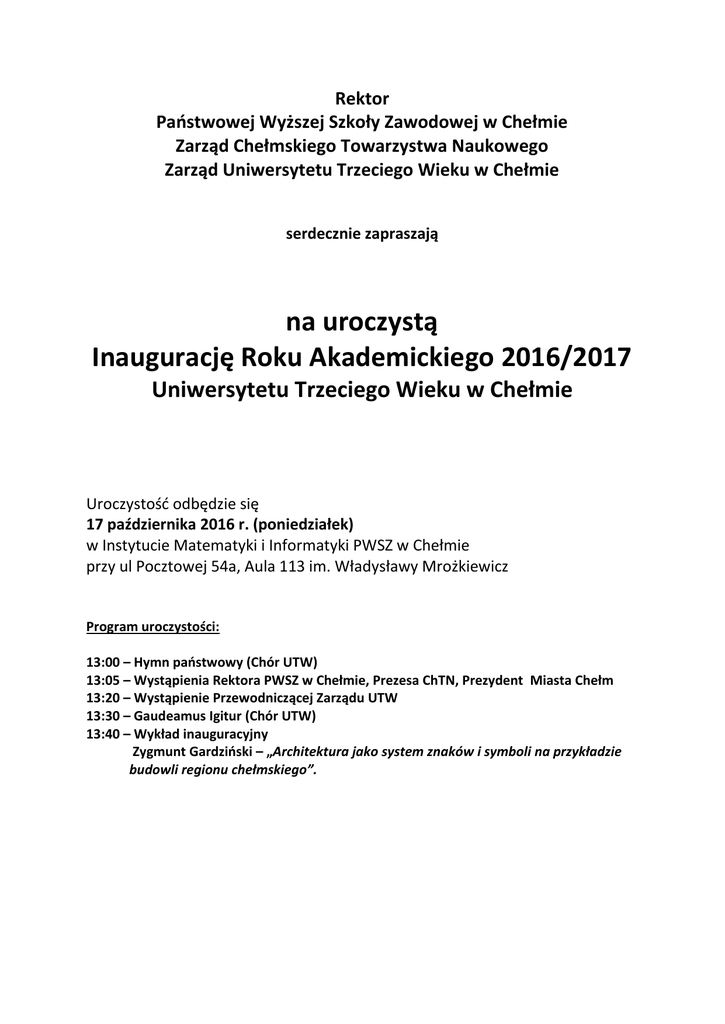 Rektor Państwowej Wyższej Szkoły Zawodowej w Chełmie Zarząd Chełmskiego Towarzystwa Naukowego Zarząd Uniwersytetu Trzeciego Wieku w Chełmie serdecznie zapraszają na uroczystą Inaugurację Roku Akademickiego 2016/2017 Uniwersytetu Trzeciego Wieku w Chełmie Uroczystość odbędzie się 17 października 2016 r. (poniedziałek) w Instytucie Matematyki i Informatyki PWSZ w Chełmie przy ul Pocztowej 54a, Aula 113 im. Władysławy Mrożkiewicz Program uroczystości: 13:00 – Hymn państwowy (Chór UTW) 13:05 – Wystąpienia Rektora PWSZ w Chełmie, Prezesa ChTN, Prezydent Miasta Chełm 13:20 – Wystąpienie Przewodniczącej Zarządu UTW 13:30 – Gaudeamus Igitur (Chór UTW) 13:40 – Wykład inauguracyjny Zygmunt Gardziński – „Architektura jako system znaków i symboli na przykładzie budowli regionu chełmskiego”.