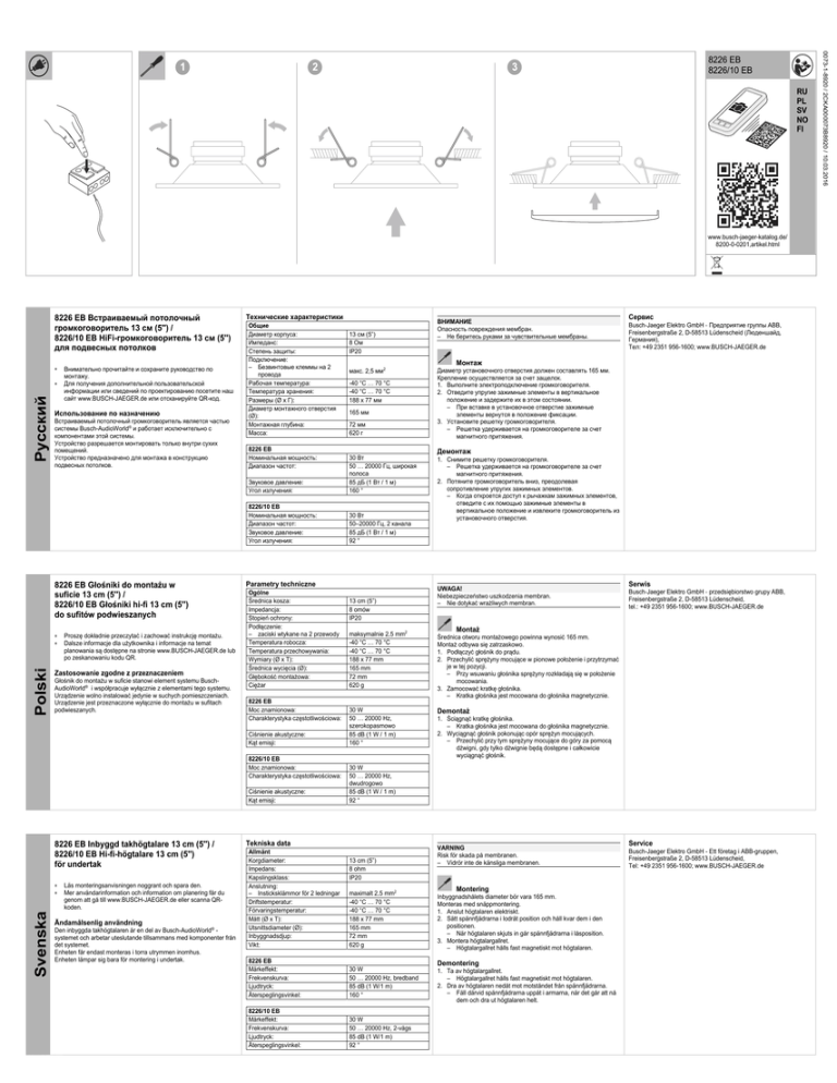 Pos: 2 /Faltblatt 35x42/00_FB-Kopf/FB-Köpfe in Anleitungen/8226 @ 44\mod_1448555888231_0.docx @ 405148 @ @ 1 RU PL SV NO FI www.busch-jaeger-katalog.de/ 8200-0-0201,artikel.html === Ende der Liste für Textmarke Titel === Pos: 13 /Faltblatt 35x42/Multimedia/Busch-AudioWorld/8226/8226 @ 44\mod_1448555923425_112766.docx @ 405162 @ 122222 @ 1 8226 EB Встраиваемый потолочный громкоговоритель 13 см (5'') / 8226/10 EB HiFi-громкоговоритель 13 см (5'') для подвесных потолков ■ Русский ■ Внимательно прочитайте и сохраните руководство по монтажу. Для получения дополнительной пользовательской информации или сведений по проектированию посетите наш сайт www.BUSCH-JAEGER.de или отсканируйте QR-код. Использование по назначению Встраиваемый потолочный громкоговоритель является частью системы Busch-AudioWorld® и работает исключительно с компонентами этой системы. Устройство разрешается монтировать только внутри сухих помещений. Устройство предназначено для монтажа в конструкцию подвесных потолков. Технические характеристики Общие Диаметр корпуса: Импеданс: Степень защиты: Подключение: – Безвинтовые клеммы на 2 провода Рабочая температура: Температура хранения: Размеры (Ø x Г): Диаметр монтажного отверстия (Ø): Монтажная глубина: Масса: 8226 EB Номинальная мощность: Диапазон частот: 13 см (5”) 8 Ом IP20 ВНИМАНИЕ Опасность повреждения мембран. – Не беритесь руками за чувствительные мембраны. Сервис Busch‐Jaeger Elektro GmbH ‐ Предприятие группы ABB, Freisenbergstraße 2, D-58513 Lüdenscheid (Люденшайд, Германия), Тел: +49 2351 956-1600; www.BUSCH-JAEGER.de Монтаж макс. 2,5 мм2 -40 °C … 70 °C -40 °C … 70 °C 188 x 77 мм 165 мм 72 мм 620 г Звуковое давление: Угол излучения: 30 Вт 50 … 20000 Гц, широкая полоса 85 дБ (1 Вт / 1 м) 160 ° 8226/10 EB Номинальная мощность: Диапазон частот: Звуковое давление: Угол излучения: 30 Вт 50–20000 Гц, 2 канала 85 дБ (1 Вт / 1 м) 92 ° Диаметр установочного отверстия должен составлять 165 мм. Крепление осуществляется за счет защелок. 1. Выполните электроподключение громкоговорителя. 2. Отведите упругие зажимные элементы в вертикальное положение и задержите их в этом состоянии. – При вставке в установочное отверстие зажимные элементы вернутся в положение фиксации. 3. Установите решетку громкоговорителя. – Решетка удерживается на громкоговорителе за счет магнитного притяжения. Демонтаж 1. Снимите решетку громкоговорителя. – Решетка удерживается на громкоговорителе за счет магнитного притяжения. 2. Потяните громкоговоритель вниз, преодолевая сопротивление упругих зажимных элементов. – Когда откроется доступ к рычажкам зажимных элементов, отведите с их помощью зажимные элементы в вертикальное положение и извлеките громкоговоритель из установочного отверстия. Pos: 14 /Faltblatt 35x42/Multimedia/Busch-AudioWorld/8226/8226 @ 44\mod_1448555923425_124510.docx @ 405161 @ 122222 @ 1 8226 EB Głośniki do montażu w suficie 13 cm (5'') / 8226/10 EB Głośniki hi-fi 13 cm (5'') do sufitów podwieszanych ■ Polski ■ Proszę dokładnie przeczytać i zachować instrukcję montażu. Dalsze informacje dla użytkownika i informacje na temat planowania są dostępne na stronie www.BUSCH-JAEGER.de lub po zeskanowaniu kodu QR. Zastosowanie zgodne z przeznaczeniem Głośnik do montażu w suficie stanowi element systemu BuschAudioWorld® i współpracuje wyłącznie z elementami tego systemu. Urządzenie wolno instalować jedynie w suchych pomieszczeniach. Urządzenie jest przeznaczone wyłącznie do montażu w sufitach podwieszanych. Parametry techniczne Ogólne Średnica kosza: Impedancja: Stopień ochrony: Podłączenie: – zaciski wtykane na 2 przewody Temperatura robocza: Temperatura przechowywania: Wymiary (Ø x T): Średnica wycięcia (Ø): Głębokość montażowa: Ciężar 8226 EB Moc znamionowa: Charakterystyka częstotliwościowa: Ciśnienie akustyczne: Kąt emisji: 8226/10 EB Moc znamionowa: Charakterystyka częstotliwościowa: Ciśnienie akustyczne: Kąt emisji: 13 cm (5”) 8 omów IP20 maksymalnie 2,5 mm2 -40 °C … 70 °C -40 °C … 70 °C 188 x 77 mm 165 mm 72 mm 620 g 30 W 50 … 20000 Hz, szerokopasmowo 85 dB (1 W / 1 m) 160 ° UWAGA! Niebezpieczeństwo uszkodzenia membran. – Nie dotykać wrażliwych membran. Serwis Busch‐Jaeger Elektro GmbH ‐ przedsiębiorstwo gr