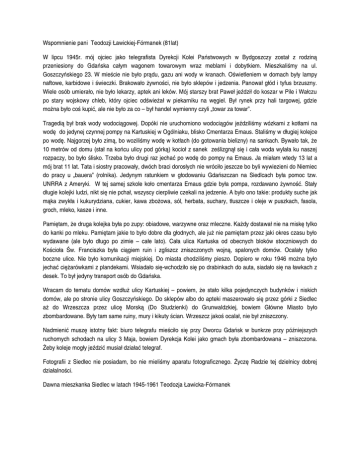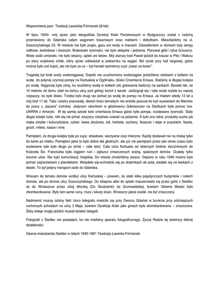Wspomnienie pani Teodozji Ławickiej-Fórmanek (81lat) W lipcu 1945r. mój ojciec jako telegrafista Dyrekcji Kolei Państwowych w Bydgoszczy został z rodziną przeniesiony do Gdańska całym wagonem towarowym wraz meblami i dobytkiem. Mieszkaliśmy na ul. Goszczyńskiego 23. W mieście nie było prądu, gazu ani wody w kranach. Oświetleniem w domach były lampy naftowe, karbidowe i świeczki. Brakowało żywności, nie było sklepów i jedzenia. Panował głód i tyfus brzuszny. Wiele osób umierało, nie było lekarzy, aptek ani leków. Mój starszy brat Paweł jeździł do koszar w Pile i Wałczu po stary wojskowy chleb, który ojciec odświeżał w piekarniku na węgiel. Był rynek przy hali targowej, gdzie można było coś kupić, ale nie było za co – był handel wymienny czyli „towar za towar”. Tragedią był brak wody wodociągowej. Dopóki nie uruchomiono wodociągów jeździliśmy wózkami z kotłami na wodę do jedynej czynnej pompy na Kartuskiej w Ogólniaku, blisko Cmentarza Emaus. Staliśmy w długiej kolejce po wodę. Najgorzej było zimą, bo woziliśmy wodę w kotłach (do gotowania bielizny) na sankach. Bywało tak, że 10 metrów od domu (stał na końcu ulicy pod górką) kocioł z sanek ześlizgnął się i cała woda wylała ku naszej rozpaczy, bo było ślisko. Trzeba było drugi raz jechać po wodę do pompy na Emaus. Ja miałam wtedy 13 lat a mój brat 11 lat. Tata i siostry pracowały, dwóch braci dorosłych nie wróciło jeszcze bo byli wywiezieni do Niemiec do pracy u „bauera” (rolnika). Jedynym ratunkiem w głodowaniu Gdańszczan na Siedlcach była pomoc tzw. UNRRA z Ameryki. W tej samej szkole koło cmentarza Emaus gdzie była pompa, rozdawano żywność. Stały długie kolejki ludzi, nikt się nie pchał, wszyscy cierpliwie czekali na jedzenie. A było ono takie: produkty suche jak mąka zwykła i kukurydziana, cukier, kawa zbożowa, sól, herbata, suchary, tłuszcze i oleje w puszkach, fasola, groch, mleko, kasze i inne. Pamiętam, że druga kolejka była po zupy: obiadowe, warzywne oraz mleczne. Każdy dostawał nie na miskę tylko do kanki po mleku. Pamiętam jakie to było dobre dla głodnych, ale już nie pamiętam przez jaki okres czasu było wydawane (ale było długo po zimie – całe lato). Cała ulica Kartuska od obecnych bloków stoczniowych do Kościoła Św. Franciszka była ciągiem ruin i zgliszcz zniszczonych wojną, spalonych domów. Ocalały tylko boczne ulice. Nie było komunikacji miejskiej. Do miasta chodziliśmy pieszo. Dopiero w roku 1946 można było jechać ciężarówkami z plandekami. Wsiadało się-wchodziło się po drabinkach do auta, siadało się na ławkach z desek. To był jedyny transport osób do Gdańska. Wracam do tematu domów wzdłuż ulicy Kartuskiej – powiem, że stało kilka pojedynczych budynków i niskich domów, ale po stronie ulicy Goszczyńskiego. Do sklepów albo do apteki maszerowało się przez górki z Siedlec aż do Wrzeszcza przez ulicę Morską (Do Studzienki) do Grunwaldzkiej, bowiem Główne Miasto było zbombardowane. Były tam same ruiny, mury i kikuty ścian. Wrzeszcz jakoś ocalał, nie był zniszczony. Nadmienić muszę istotny fakt: biuro telegrafu mieściło się przy Dworcu Gdańsk w bunkrze przy późniejszych ruchomych schodach na ulicy 3 Maja, bowiem Dyrekcja Kolei jako gmach była zbombardowana – zniszczona. Żeby koleje mogły jeździć musiał działać telegraf. Fotografii z Siedlec nie posiadam, bo nie mieliśmy aparatu fotograficznego. Życzę Radzie tej dzielnicy dobrej działalności. Dawna mieszkanka Siedlec w latach 1945-1961 Teodozja Ławicka-Fórmanek