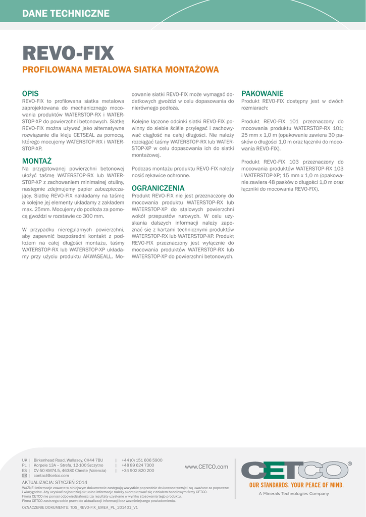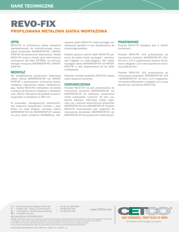 DANE TECHNICZNE REVO-FIX PROFILOWANA METALOWA SIATKA MONTAŻOWA OPIS REVO-FIX to profilowana siatka metalowa zaprojektowana do mechanicznego mocowania produktów WATERSTOP-RX i WATERSTOP-XP do powierzchni betonowych. Siatkę REVO-FIX można używać jako alternatywne rozwiązanie dla kleju CETSEAL za pomocą, którego mocujemy WATERSTOP-RX i WATERSTOP-XP. MONTAŻ Na przygotowanej powierzchni betonowej ułożyć taśmę WATERSTOP-RX lub WATERSTOP-XP z zachowaniem minimalnej otuliny, następnie zdejmujemy papier zabezpieczający. Siatkę REVO-FIX nakładamy na taśmę a kolejne jej elementy układamy z zakładem max. 25mm. Mocujemy do podłoża za pomocą gwoździ w rozstawie co 300 mm. W przypadku nieregularnych powierzchni, aby zapewnić bezpośredni kontakt z podłożem na całej długości montażu, taśmy WATERSTOP-RX lub WATERSTOP-XP układamy przy użyciu produktu AKWASEALL. Mo- UK | PL | ES | | Birkenhead Road, Wallasey, CH44 7BU Korpele 13A – Strefa, 12-100 Szczytno CV-50 KM74.5, 46380 Cheste (Valencia) [email protected] cowanie siatki REVO-FIX może wymagać dodatkowych gwoździ w celu dopasowania do nierównego podłoża. PAKOWANIE Kolejne łączone odcinki siatki REVO-FIX powinny do siebie ściśle przylegać i zachowywać ciągłość na całej długości. Nie należy rozciągać taśmy WATERSTOP-RX lub WATERSTOP-XP w celu dopasowania ich do siatki montażowej. Produkt REVO-FIX 101 przeznaczony do mocowania produktu WATERSTOP-RX 101; 25 mm x 1,0 m (opakowanie zawiera 30 pasków o długości 1,0 m oraz łączniki do mocowania REVO-FIX). Podczas montażu produktu REVO-FIX należy nosić rękawice ochronne. OGRANICZENIA Produkt REVO-FIX nie jest przeznaczony do mocowania produktu WATERSTOP-RX lub WATERSTOP-XP do stalowych powierzchni wokół przepustów rurowych. W celu uzyskania dalszych informacji należy zapoznać się z kartami technicznymi produktów WATERSTOP-RX lub WATERSTOP-XP. Produkt REVO-FIX przeznaczony jest wyłącznie do mocowania produktów WATERSTOP-RX lub WATERSTOP-XP do powierzchni betonowych. | +44 (0) 151 606 5900 | +48 89 624 7300 | +34 902 820 200 AKTUALIZACJA: STYCZEŃ 2014 www.CETCO.com WAŻNE: Informacje zawarte w niniejszym dokumencie zastępują wszystkie poprzednie drukowane wersje i są uważane za poprawne i wiarygodne. Aby uzyskać najbardziej aktualne informacje należy skontaktować się z działem handlowym firmy CETCO. Firma CETCO nie ponosi odpowiedzialności za rezultaty uzyskane w wyniku stosowania tego produktu. Firma CETCO zastrzega sobie prawo do aktualizacji informacji bez wcześniejszego powiadomienia. OZNACZENIE DOKUMENTU: TDS_REVO-FIX_EMEA_PL_201401_V1 Produkt REVO-FIX dostępny jest w dwóch rozmiarach: Produkt REVO-FIX 103 przeznaczony do mocowania produktów WATERSTOP-RX 103 i WATERSTOP-XP; 15 mm x 1,0 m (opakowanie zawiera 48 pasków o długości 1,0 m oraz łączniki do mocowania REVO-FIX).