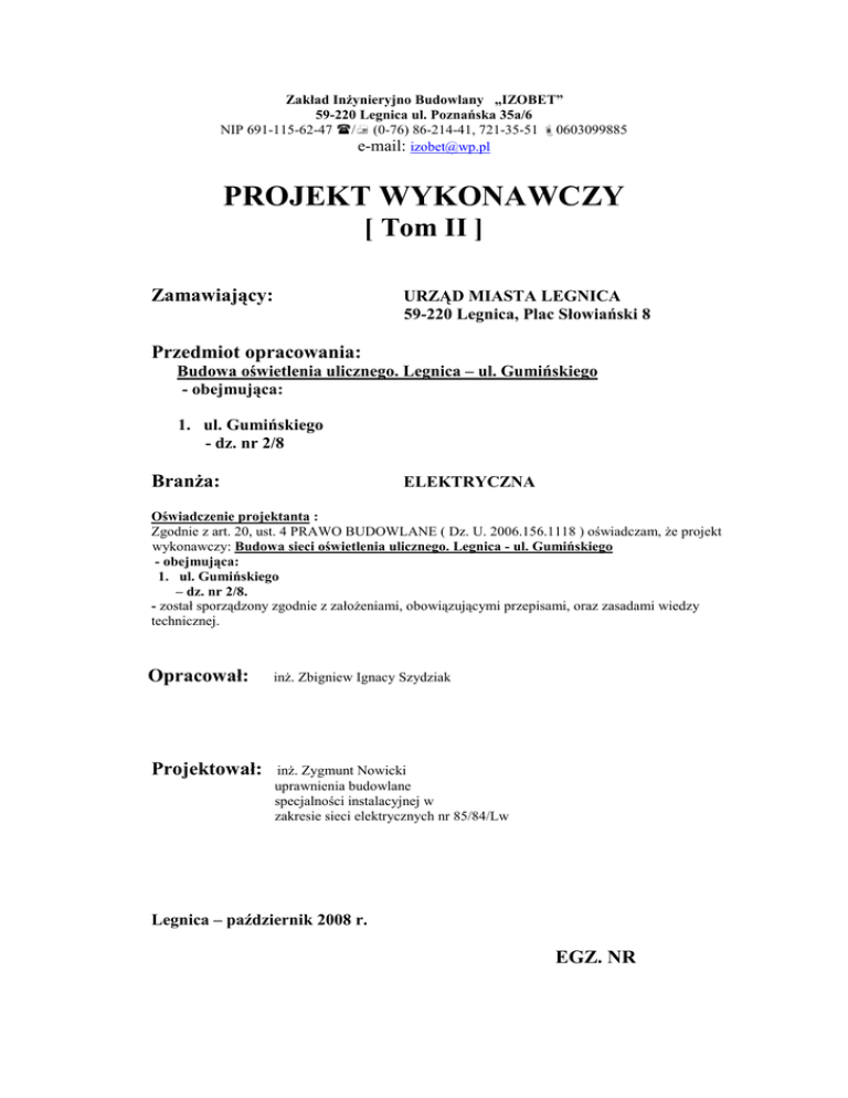 Zakład InŜynieryjno Budowlany „IZOBET” 59-220 Legnica ul. Poznańska 35a/6 NIP 691-115-62-47 / (0-76) 86-214-41, 721-35-51 0603099885 e-mail: [email protected] PROJEKT WYKONAWCZY [ Tom II ] Zamawiający: URZĄD MIASTA LEGNICA 59-220 Legnica, Plac Słowiański 8 Przedmiot opracowania: Budowa oświetlenia ulicznego. Legnica – ul. Gumińskiego - obejmująca: 1. ul. Gumińskiego - dz. nr 2/8 BranŜa: ELEKTRYCZNA Oświadczenie projektanta : Zgodnie z art. 20, ust. 4 PRAWO BUDOWLANE ( Dz. U. 2006.156.1118 ) oświadczam, Ŝe projekt wykonawczy: Budowa sieci oświetlenia ulicznego. Legnica - ul. Gumińskiego - obejmująca: 1. ul. Gumińskiego – dz. nr 2/8. - został sporządzony zgodnie z załoŜeniami, obowiązującymi przepisami, oraz zasadami wiedzy technicznej. Opracował: inŜ. Zbigniew Ignacy Szydziak Projektował: inŜ. Zygmunt Nowicki uprawnienia budowlane specjalności instalacyjnej w zakresie sieci elektrycznych nr 85/84/Lw Legnica – październik 2008 r. EGZ. NR 2. Spis zawartości teczki DO PROJEKTU WYKONAWCZEGO 1. Strona tytułowa. 2. Spis zawartości teczki. 3. Opis techniczny. 4. Obliczenia techniczne. 5. Rysunki techniczne: rys. nr 1 - Plan trasy oświetleniowej linii kablowej nN 0,42 kV 1 : 500 rys. nr 2 - Schemat ideowy oświetlenia ulicznego. 6. Uzgodnienia, dokumenty. 3. OPIS TECHNICZNY 3.1. PRZEDMIOT OPRACOWANIA Przedmiotem niniejszego opracowania jest: PROJEKT WYKONAWCZY oświetlenia ulicznego ul. Gumińskiego – w Legnicy, w skład projektu wchodzić będzie kablowa lina n. n. zasilająca projektowane latarnie uliczne. Projekt opracowano na podstawie: - mapa do celów projektowych z aktualnym uzbrojeniem terenu 1:500 - warunków przyłączenia – znak: RD-2.1/RB/856/9429/2008 z dn. 27/10/2008 r. wydanych przez EnergiaPro O/Legnica SA - typowych opracowań katalogowych słupów stalowych ocynkowanych, - obowiązujących przepisów i norm [PN-76/E-05125 + N SEP-E-001 + N SEP-E004 + PN-IEC 60364-5-523 + PN-EN/ 13201-1 – Oświetlenie dróg]. 3.2. STAN ISTNIEJĄCY Ul. Gumińskiego, na całej nowo wybudowanej i utwardzonej długości nie posiada oświetlenia zewnętrznego. 3.3. PROJEKTOWANE ROZWIĄZANIA TECHNICZNE Projektowane oświetlenie zewnętrzne odcinka ul. Gumińskiego, zrealizowane zostanie w oparciu o słupy stalowe ocynkowane 9 m z wysięgnikami 1,5 m + oprawy sodowe szerokostrumieniowe, aluminiowe z kloszem szklanym - o mocy 150 W. Latarnie będą zasilane kablową linią nN - kabel YAKXS 4x35 mm2. Ze względu na róŜnorodność terenu, i występowanie grup starodrzewia - kabel będzie układany poza skrajnią jezdni w róŜnej od niej odległości. Same latarnie naleŜy montować w odległości 0,8m od skrajni jezdni. Przy przejściach obok zgrupowań drzew, kabel oświetleniowy prowadzić w odległościach 2 m od ich pni – metodami obejściowymi, i w przeciskach ręcznych, aby nie doprowadzić do uszkodzeń systemów korzeniowych. Zgodnie z „Warunkami Przyłączenia” miejsce przyłączenia projektowanego kabla oświetleniowego oświetlenia zewnętrznego stanowi projektowana wolnostojąca, 6-obwodowa szafka oświetleniowa SOU-6, usytuowana przy ul. Gumińskiego – dz. nr 2/8. Szafka SOU-6 zasilana będzie z projektowanej kablowej szafki zasilającej ZK-1b/1R zamontowanej na dz. nr 2/8 [ul. T. Gumińskiego] – przy granicy z dz. nr 2/15. Projektowana kablowa szafka zasilająca pracować będzie w przelocie istniejącej kablowej linii zasilającej [relacji: stacja R 275-21 – kierunek złącze Z-2 ul. Kertyńskiego], wykonanej kablem YAKXS 4x240 mm2. Od szafki ZK-1b/1R , do zestawu szafki oświetleniowej wykonać jej zasilanie kablem YAKXS 4x70 mm2. Zasilanie przelotowe projektowanej szafki zasilającej wykonać metodą „jednego mufowania” z zastosowaniem mufy przelotowej ZRM-5/JLP-CX4-240 RADPOL. Projektowane kable zasilające i oświetleniowe prowadzić na głębokościach 0,7m z przykryciem folią kalandrowaną w kolorze niebieskim + 2x warstwa piasku po 10cm , w miejscach skrzyŜowań i zbliŜeń z obcym uzbrojeniem kabel układać w rurach ochronnych typu AROT DVK 75 - a w przekroczeniach dróg, w rurach ochronnych typu AROT SRS 110 układanymi na głębokości 1m. Na końcach kabli oświetleniowych zastosować czteropalczatki termokurczliwe AK 4-35 RADPOL [w słupach]. Wraz z projektowaną oświetleniową linią kablową, w tym samym wykopie ułoŜyć dodatkowo bednarkę Fe/Zn 25x3 mm - jako dodatkowe uziemienie konstrukcji słupów. Wszystkie prace ziemne w pobliŜu korzeni drzew i istniejącego podziemnego uzbrojenia terenu prowadzić sposobem ręcznym, przy zachowaniu wszelkich środków ostroŜności. Przed zasypaniem wykopów, roboty zanikowe (kablowe) zgłosić do sprawdzenia oraz inwentaryzacji geodezyjnej. Całość robót wykonać zgodnie z PN-76/E-05125 + N SEP-E-004. 3.4. OCHRONA PRZECIWPORAśENIOWA Podstawową ochronę przeciwporaŜeniową stanowi odpowiednia klasa izolacji uniemoŜliwiająca wystąpienie napięcia na obudowach urządzeń rozdzielczych. Dodatkową ochronę przeciwporaŜeniową samoczynne szybkie wyłączenie poprzez zastosowanie wkładek topikowych zabezpieczeń nadprądowych. 3.5. UWAGI KOŃCOWE 1. Wytyczenie tras linii kablowych powinno być wykonane przez uprawnione słuŜby geodezyjne. 2. Przed przystąpieniem do robót ziemnych dokonać uzgodnień dotyczących głębokości i tras istniejącego podziemnego uzbrojenia terenu 3. Przed wejściem na plac budowy powiadomić pisemnie właścicieli urządzeń podziemnych i właścicieli terenu o terminach rozpoczęcia i zakończenia robót. 4. Przestrzegać warunków podanych w uzgodnieniach. 5. Roboty montaŜowe wykonywać zgodnie z aktualnie obowiązującymi normami i przepisami ze szczególnym uwzględnieniem zasad BHP określonych w rozporządzeniu ministra infrastruktury z dnia 06.02.2003 r. Obowiązującym od dnia 19.09.2003 r. (Dz. U.Nr 47 poz. 401 z dn. 19.03.2003 r.). 6. Roboty ziemne w pobliŜu innych urządzeń i sieci podziemnych wykonywać ręcz