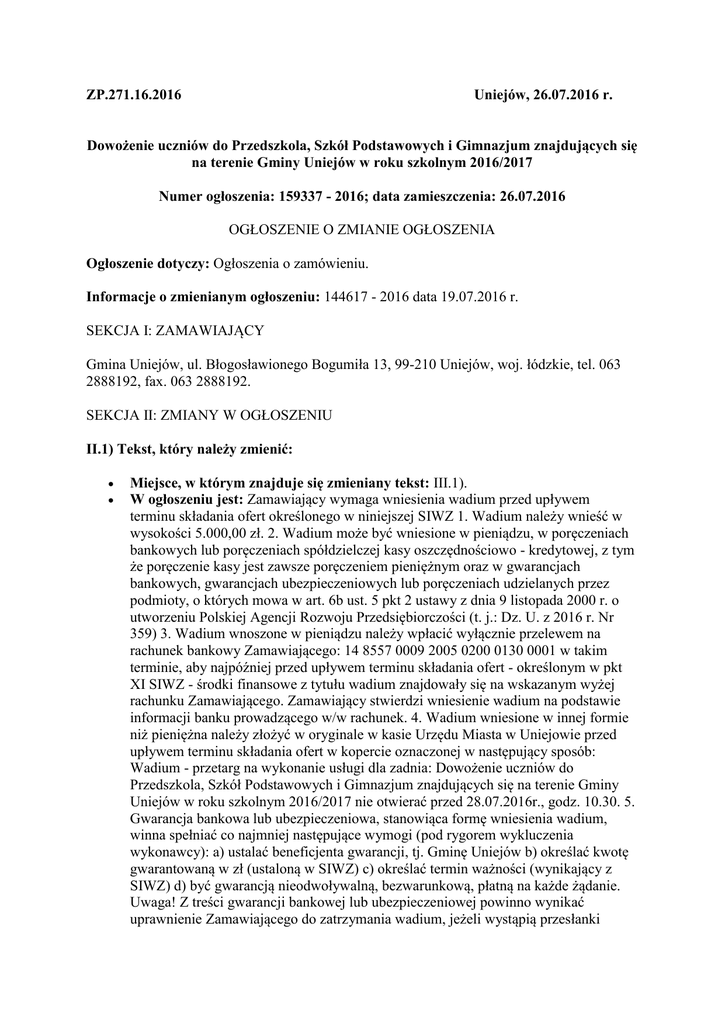 Uniejów, 26.07.2016 r. ZP.271.16.2016 Dowożenie uczniów do Przedszkola, Szkół Podstawowych i Gimnazjum znajdujących się na terenie Gminy Uniejów w roku szkolnym 2016/2017 Numer ogłoszenia: 159337 - 2016; data zamieszczenia: 26.07.2016 OGŁOSZENIE O ZMIANIE OGŁOSZENIA Ogłoszenie dotyczy: Ogłoszenia o zamówieniu. Informacje o zmienianym ogłoszeniu: 144617 - 2016 data 19.07.2016 r. SEKCJA I: ZAMAWIAJĄCY Gmina Uniejów, ul. Błogosławionego Bogumiła 13, 99-210 Uniejów, woj. łódzkie, tel. 063 2888192, fax. 063 2888192. SEKCJA II: ZMIANY W OGŁOSZENIU II.1) Tekst, który należy zmienić: Miejsce, w którym znajduje się zmieniany tekst: III.1). W ogłoszeniu jest: Zamawiający wymaga wniesienia wadium przed upływem terminu składania ofert określonego w niniejszej SIWZ 1. Wadium należy wnieść w wysokości 5.000,00 zł. 2. Wadium może być wniesione w pieniądzu, w poręczeniach bankowych lub poręczeniach spółdzielczej kasy oszczędnościowo - kredytowej, z tym że poręczenie kasy jest zawsze poręczeniem pieniężnym oraz w gwarancjach bankowych, gwarancjach ubezpieczeniowych lub poręczeniach udzielanych przez podmioty, o których mowa w art. 6b ust. 5 pkt 2 ustawy z dnia 9 listopada 2000 r. o utworzeniu Polskiej Agencji Rozwoju Przedsiębiorczości (t. j.: Dz. U. z 2016 r. Nr 359) 3. Wadium wnoszone w pieniądzu należy wpłacić wyłącznie przelewem na rachunek bankowy Zamawiającego: 14 8557 0009 2005 0200 0130 0001 w takim terminie, aby najpóźniej przed upływem terminu składania ofert - określonym w pkt XI SIWZ - środki finansowe z tytułu wadium znajdowały się na wskazanym wyżej rachunku Zamawiającego. Zamawiający stwierdzi wniesienie wadium na podstawie informacji banku prowadzącego w/w rachunek. 4. Wadium wniesione w innej formie niż pieniężna należy złożyć w oryginale w kasie Urzędu Miasta w Uniejowie przed upływem terminu składania ofert w kopercie oznaczonej w następujący sposób: Wadium - przetarg na wykonanie usługi dla zadnia: Dowożenie uczniów do Przedszkola, Szkół Podstawowych i Gimnazjum znajdujących się na terenie Gminy Uniejów w roku szkolnym 2016/2017 nie otwierać przed 28.07.2016r., godz. 10.30. 5. Gwarancja bankowa lub ubezpieczeniowa, stanowiąca formę wniesienia wadium, winna spełniać co najmniej następujące wymogi (pod rygorem wykluczenia wykonawcy): a) ustalać beneficjenta gwarancji, tj. Gminę Uniejów b) określać kwotę gwarantowaną w zł (ustaloną w SIWZ) c) określać termin ważności (wynikający z SIWZ) d) być gwarancją nieodwoływalną, bezwarunkową, płatną na każde żądanie. Uwaga! Z treści gwarancji bankowej lub ubezpieczeniowej powinno wynikać uprawnienie Zamawiającego do zatrzymania wadium, jeżeli wystąpią przesłanki opisane w art. 46 ust. 4a i 5 ustawy z dnia 29 stycznia 2004 roku Prawo zamówień publicznych (tekst jedn. Dz.U. z 2015 r. poz. 2164), w szczególności uprawnienie Zamawiającego do zatrzymania wadium wraz z odsetkami, jeżeli wykonawca w odpowiedzi na wezwanie, o którym mowa w art. 26 ust. 3 z przyczyn leżących po jego stronie, nie złożył dokumentów lub oświadczeń, o których mowa w art. 25 ust. 1, pełnomocnictw, listy podmiotów należących do tej samej grupy kapitałowej, o której mowa w art. 24 ust. 2 pkt 5, lub informacji o tym, że nie należy do grupy kapitałowej lub nie wyraził zgody na poprawienie omyłki, o której mowa w art. 87 ust. 2 pkt 3, co powodowało brak możliwości wybrania oferty złożonej przez wykonawcę jako najkorzystniejszej. 6. Do wadium wniesionego w formie poręczenia wymagania opisane w pkt. 5 stosuje się odpowiednio 7. W przypadku nie wniesienia wadium na warunkach określonych w pkt. 1-4 Wykonawca zostanie wykluczony z dalszego postępowania, a złożona przez niego oferta zostanie odrzucona. 8. Zwrot wadium nastąpi na zasadach określonych w art. 46 ustawy z dnia 29 listopada 2004 r.- Prawo zamówień publicznych (t. j.: Dz. U. z 2015 r., poz. 2164). Oferent zobowiązany jest podać w ofercie dokładną informację odnośnie zwrotu wadium tj. adres banku, numer konta itp.. W ogłoszeniu powinno być: Zamawiający wymaga wniesienia wadium przed upływem terminu składania ofert określonego w niniejszej SIWZ 1. Wadium należy wnieść w wysokości 5.000,00 zł. 2. Wadium może być wniesione w pieniądzu, w poręczeniach bankowych lub poręczeniach spółdzielczej kasy oszczędnościowo kredytowej, z tym że poręczenie kasy jest zawsze poręczeniem pieniężnym oraz w gwarancjach bankowych, gwarancjach ubezpieczeniowych lub poręczeniach udzielanych przez podmioty, o których mowa w art. 6b ust. 5 pkt 2 ustawy z dnia 9 listopada 2000 r. o utworzeniu Polskiej Agencji Rozwoju Przedsiębiorczości (t. j.: Dz. U. z 2016 r. Nr 359) 3. Wadium wnoszone w pieniądzu należy wpłacić wyłącznie przelewem na rachunek bankowy Zamawiającego: 14 8557 0009 2005 0200 0130 0001 w takim terminie, aby najpóźniej przed upływem terminu składania ofert określonym w pkt XI SIWZ - środki finansowe z tytułu wadium znajdowały się na wskazanym wyżej rachunku Zamawiającego. Zamawiający stwierdzi wniesienie wadium na podstawie informacji banku prowadzącego w/w rachunek. 4. Wadium wniesione w innej formie niż pieniężna należy złożyć w oryginale w kasie Urzędu Miasta w Uniejowie przed upływem terminu składania ofert w kopercie oznaczonej w następujący sposób: Wadium - przetarg na wykonanie usługi dla zadnia: Dowożenie uczniów do Przedszkola, Szkół Podstawowych i Gimnazjum znajdujących się na terenie Gminy Uniejów w roku szkolnym 2016/2017 nie otwierać przed 01.08.2016 r., godz. 12:30. 5. Gwarancja bankowa lub ubezpieczeniowa, stanowiąca formę wniesienia wadium, winna spełniać co najmniej następujące wymogi (pod rygorem wykluczenia wykonawcy): a) ustalać beneficjenta gwarancji, tj. Gminę Uniejów b) określać kwotę gwarantowaną w zł (ustaloną w SIWZ) c) określać termin ważności (w