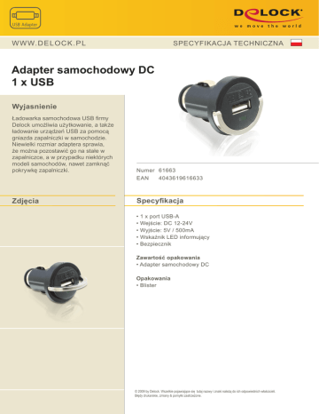 SPECYFIKACJA TECHNICZNA WWW. D E L O C K . P L Adapter samochodowy DC 1 x USB Wyjasnienie Ładowarka samochodowa USB firmy Delock umożliwia użytkowanie, a także ładowanie urządzeń USB za pomocą gniazda zapalniczki w samochodzie. Niewielki rozmiar adaptera sprawia, że można pozostawić go na stałe w zapalniczce, a w przypadku niektórych modeli samochodów, nawet zamknąć pokrywkę zapalniczki. Numer 61663 EAN Zdjęcia 4043619616633 Specyfikacja • • • • • 1 x port USB-A Wejście: DC 12-24V Wyjście: 5V / 500mA Wskaźnik LED informujący Bezpiecznik Zawartość opakowania • Adapter samochodowy DC Opakowania • Blister © 2009 by Delock. Wszelkie pojawiające się tutaj nazwy i znaki należą do ich odpowiednich właścicieli. Błędy drukarskie, zmiany & pomyłki zastrzeżone.