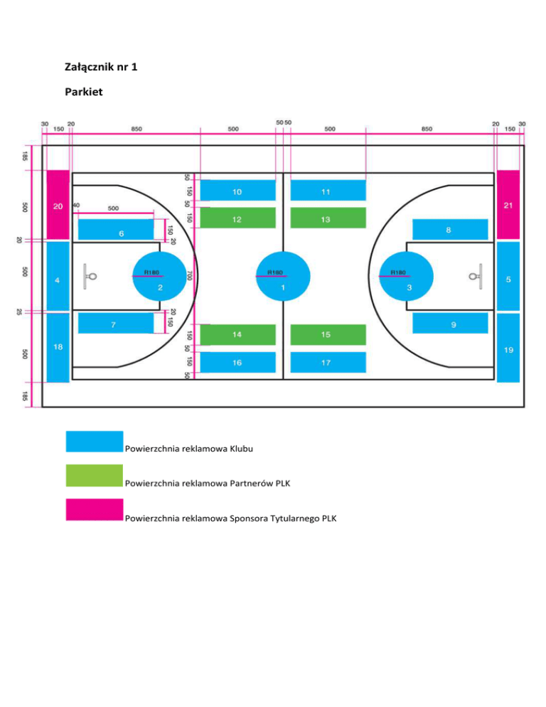 Załącznik nr 1 Parkiet Powierzchnia reklamowa Klubu Powierzchnia reklamowa Partnerów PLK Powierzchnia reklamowa Sponsora Tytularnego PLK Schemat powierzchni reklamowej na parkiecie Powierzchnia reklamowa Klubu 1. Koło środkowe o średnicy 360 cm (pole 1). 2. Dwa koło podkoszowe o średnicy 360 cm (pole 2 - 3). 3. Dwa miejsca reklamowe pod koszem o wymiarach 5m x 1,5m w strefie bezpieczeństwa (pole 4 - 5). 4. Cztery miejsca reklamowe o wymiarach 5m x 1,5m przy liniach pola ograniczonego (pola 6 9). 5. Dwa miejsca reklamowe o wymiarach 5m x 1,5m przy dalszej linii bocznej (pola 10 – 11). 6. Dwa miejsca reklamowe o wymiarach 5m x 1,5m przy bliższej linii bocznej (pola 16 – 17). 7. Dwa miejsca reklamowe o wymiarach 5m x 1,5m przy liniach końcowych boiska po stronie kamer TV. (pola 18 – 19(. Powierzchnia reklamowa PLK (Sponsor Tytularny) 8. Dwa miejsca reklamowe o wymiarach 5m x 1, 5m przy liniach końcowych boiska. (pole 20 i 21). Powierzchnia reklamowa PLK (Partnerzy PLK) 9. Cztery miejsca reklamowe o wymiarach 5m x 1,5m przy linii środkowej boiska (pole 12 – 15). Bandy reklamowe elektroniczne / dynamiczne Kamery TV Kamery TV Kamery TV Schemat powierzchni reklamowej na bandach elektronicznych / dynamicznych 1. Bandy reklamowe o wymiarze 28m x 1m wzdłuż linii bocznej ustawione w trzech rzędach –85 % czasu ekspozycji stanowi powierzchnię reklamową Klubu. 2. Bandy reklamowe o wymiarze 6m x 1m wzdłuż linii końcowej – 85 % czasu ekspozycji stanowi powierzchnię reklamową Klubu. 3. Bandy reklamowe o wymiarze 28m x 1m wzdłuż linii bocznej ustawione w trzech rzędach – 15 % czasu ekspozycji stanowi powierzchnię reklamową PLK przeznaczoną dla Sponsora Tytularnego i Partnerów PLK. (realny czas ekspozycji nie krótszy niż 16-18 min). 4. Bandy reklamowe o wymiarze 6m x 1m wzdłuż linii bocznej – 15 % czasu ekspozycji stanowi powierzchnię PLK przeznaczoną dla Sponsora Tytularnego i Partnerów PLK. (realny czas ekspozycji nie krótszy niż 16-18 min). 5. Umożliwienie ekspozycji na bandach elektronicznych dodatkowych spotów reklamowych promujących akcje społeczne/niekomercyjne Partnerów PLK lub inne rozgrywki PLK w wymiarze nie większym niż 3% łącznego czasu reklamowego podczas wybranych meczów rozgrywek.Pierwsza emisja reklamy na bandach elektronicznych / dynamicznych podczas rozpoczęcia meczu, przy podrzucie piłki zarezerwowana jest zawsze dla Sponsora Tytularnego PLK. 6. Emisje reklam na bandach elektronicznych / dynamicznych muszę się odbywać w postaci 15 sekundowych bloków reklamowych. Dopuszczalne jest łączenie reklam jednego sponsora w dłuższe bloki stanowiące zawsze wielokrotność 15 sek. 7. Telebimy zainstalowane wewnątrz oraz na zewnątrz hal - 85 % czasu ekspozycji stanowi powierzchnię reklamową Klubu. 8. Telebimy zainstalowane wewnątrz oraz na zewnątrz hal - 15 % czasu ekspozycji stanowi powierzchnię PLK przeznaczoną dla Sponsora Tytularnego i Partnerów PLK. 9. Umożliwienie ekspozycji na telebimach dodatkowych spotów reklamowych promujących akcje społeczne/niekomercyjne Partnerów PLK lub inne rozgrywki PLK w wymiarze nie większym niż 3% łącznego czasu reklamowego podczas wybranych meczów rozgrywek. Bandy reklamowe statyczne Kamery TV Kamery TV Kamery TV Powierzchnia reklamowa na bandach statycznych 1. Trzy tablice reklamowe o wymiarach 3m x 1m umieszczone w trzech rzędach za linią boczną boiska do dyspozycji Sponsora Tytularnego PLK. 2. Pozostała powierzchnia reklamowa o wymiarach 3m x 1m za linią boczną i liniami końcowymi stanowi powierzchnię reklamową Klubu. Wymiary tablic reklamowych muszą stanowić wielokrotność szerokości 3m. Załącznik nr 2 Stroje meczowe, rozgrzewkowe, techniczne Przód koszulki meczowej Oficjalny logotyp rozgrywek Powierzchnia reklamowa Klubu Logotyp producenta sprzętu Schemat powierzchni reklamowej na przodzie koszulki. 1. Logo rozgrywek po prawej stronie koszulki o powierzchni 36cm² (sugerowane wymiary 6cm x 6cm). 2. Logo producenta w środkowej części koszulki o powierzchni max. 12 cm². 3. Herb klubu po lewej stornie koszulki o powierzchni 36cm² (sugerowane wymiary 6cm x 6cm). 4. Numer zawodnika po lewej stronie koszulki o wysokości min. 10 cm. 5. Miejsca reklamowe na środku koszulki: a. dwie powierzchnie reklamowe w linii o powierzchni 320 cm² (sugerowane wymiary 40cm x 8cm). b. jedna powierzchnia reklamowa w linii o max powierzchni 400 cm² (sugerowane wymiary 40cm x 10cm). Tył koszulki meczowej Powierzchnia reklamowa Klubu Schemat powierzchni reklamowej z tyłu koszulki 1. Jedno miejsce reklamowe w linii o powierzchni 320 cm² (sugerowane wymiary 40cm x 8 cm). 2. Nazwisko zawodnika w linii o minimalnym wymiarze 40cm x 4cm. 3. Numer zawodnika o wysokości min. 20 cm. 4. Jedno miejsca reklamowe w linii o powierzchni 320 cm² (sugerowane wymiary 40cm x 8 cm). Spodenki - przód Oficjalny logotyp rozgrywek Logotyp producenta Schemat powierzchni reklamowej z przodu spodenek meczowych 1. Prawa nogawka – oficjalny logotyp rozgrywek o powierzchni 100cm² (sugerowane wymiary 10cm x 10cm). 2. Lewa nogawka – numer zawodnika o wysokości 10cm. 3. Logo producenta sprzętu o powierzchni max 12cm². Spodenki – tył Powierzchnia reklamowa Sponsora PLK Powierzchnia reklamowa Klubu Schemat powierzchni reklamowej z tyłu spodenek meczowych 1. Miejsce reklamowe o powierzchni 320cm² (sugerowane wymiary 40cm x 8 cm) przeznaczone dla Sponsora PLK. 2. Lewa i prawa nogawka jedno miejsce reklamowe o powierzchni 100cm² (sugerowane wymiary 10cm x 10cm) przeznaczone dla Sponsorów Klubu. Dres sportowy i narzutka treningowa s s Oficjalny logotyp rozgrywek Schemat powierzchni reklamowej na dresie sportowym i narzutce treningowej 1. Przód bluzy dresowej prawa strona - oficjalny logotyp rozgrywek o powierzchni 100cm² (sugerowane wymiary 10cm x 10cm). 2. Przód narzutki reklamowej prawa strona - oficjalny logotyp rozgrywek o powierzchni 100cm² (sugerowane wymiary 10cm x 10cm). S
