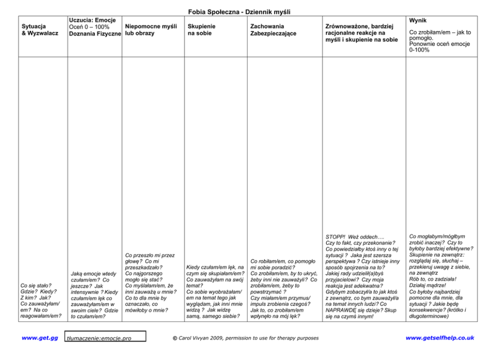Fobia Społeczna - Dziennik myśli Sytuacja & Wyzwalacz Co się stało? Gdzie? Kiedy? Z kim? Jak? Co zauważyłam/ em? Na co reagowałam/em? www.get.gg Uczucia: Emocje Niepomocne myśli Oceń 0 – 100% Doznania Fizyczne lub obrazy Jaką emocje wtedy czułam/em? Co jeszcze? Jak intensywnie ? Kiedy czułam/em lęk co zauważyłam/em w swoim ciele? Gdzie to czułam/em? Co przeszło mi przez głowę? Co mi przeszkadzało? Co najgorszego mogło się stać? Co myślałam/em, że inni zauważą u mnie? Co to dla mnie by oznaczało, co mówiłoby o mnie? tłumaczenie:emocje.pro Skupienie na sobie Kiedy czułam/em lęk, na czym się skupiałam/em? Co zauważyłam na swój temat? Co sobie wyobrażałam/ em na temat tego jak wyglądam, jak inni mnie widzą ? Jak widzę samą, samego siebie? Zachowania Zabezpieczające Co robiłam/em, co pomogło mi sobie poradzić? Co zrobiłam/em, by to ukryć, żeby inni nie zauważyli? Co zrobiłam/em, żeby to powstrzymać ? Czy miałam/em przymus/ impuls zrobienia czegoś? Jak to, co zrobiłam/em wpłynęło na mój lęk? © Carol Vivyan 2009, permission to use for therapy purposes Zrównoważone, bardziej racjonalne reakcje na myśli i skupienie na sobie STOPP! Weź oddech…. Czy to fakt, czy przekonanie? Co powiedziałby ktoś inny o tej sytuacji ? Jaka jest szersza perspektywa ? Czy istnieje inny sposób spojrzenia na to? Jakiej rady udzielił(a)byś przyjacielowi? Czy moja reakcja jest adekwatna? Gdybym zobaczył/a to jak ktoś z zewnątrz, co bym zauważył/a na temat innych ludzi? Co NAPRAWDĘ się dzieje? Skup się na czymś innym! Wynik Co zrobiłam/em – jak to pomogło. Ponownie oceń emocje 0-100% Co mogłabym/mógłbym zrobić inaczej? Czy to byłoby bardziej efektywne? Skupienie na zewnątrz: rozglądaj się, słuchaj – przekieruj uwagę z siebie, na zewnątrz Rób to, co zadziała! Działaj mądrze! Co byłoby najbardziej pomocne dla mnie, dla sytuacji ? Jakie będę konsekwencje? (krótko i długoterminowe) www.getselfhelp.co.uk