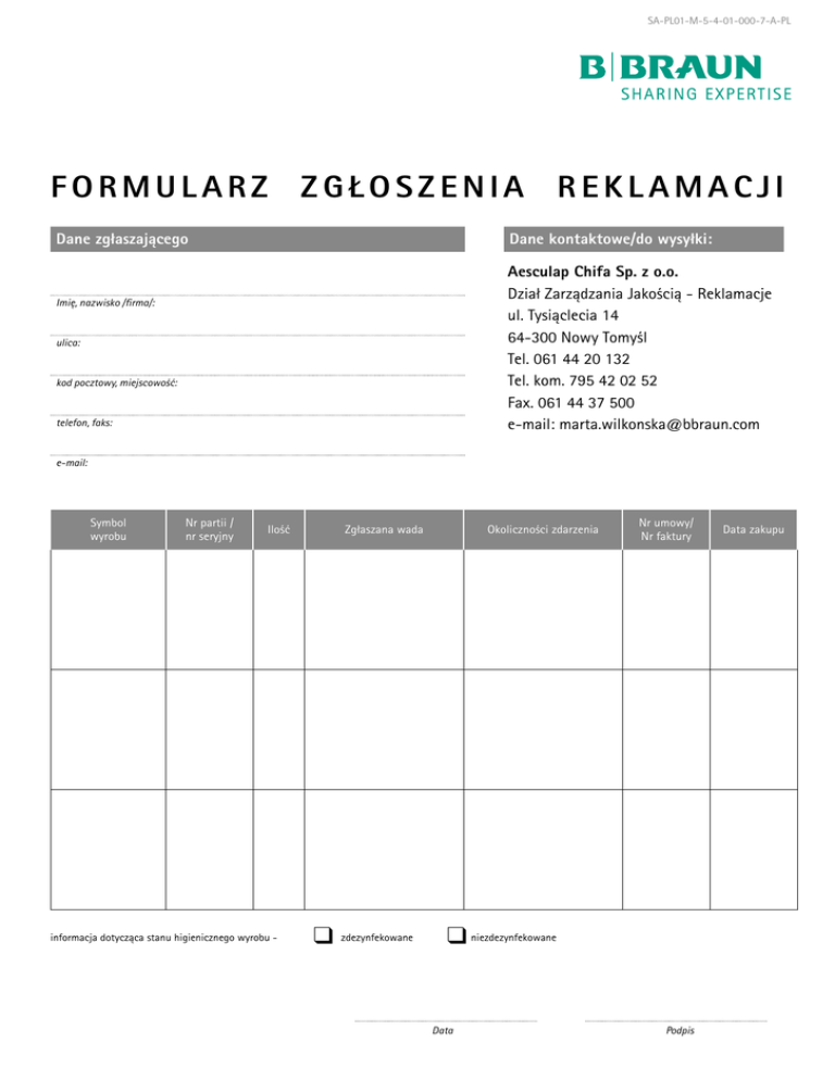 SA-PL01-M-5-4-01-000-7-A-PL FORMULARZ ZGŁOSZENIA REKLAMACJI Dane zgłaszającego Dane kontaktowe/do wysyłki: Aesculap Chifa Sp. z o.o. Dział Zarządzania Jakością - Reklamacje ul. Tysiąclecia 14 64-300 Nowy Tomyśl Tel. 061 44 20 132 Tel. kom. 795 42 02 52 Fax. 061 44 37 500 e-mail: [email protected] Imię, nazwisko /firma/: ulica: kod pocztowy, miejscowość: telefon, faks: e-mail: Symbol wyrobu Nr partii / nr seryjny Ilość informacja dotycząca stanu higienicznego wyrobu - Zgłaszana wada zdezynfekowane Okoliczności zdarzenia Nr umowy/ Nr faktury niezdezynfekowane Data Podpis Data zakupu