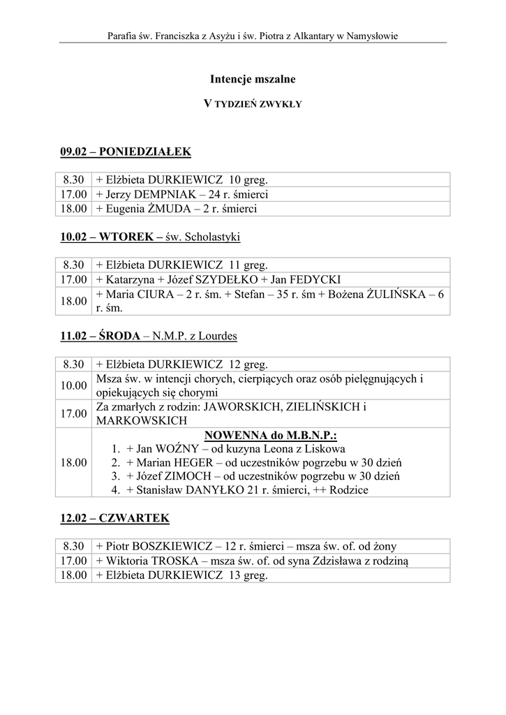 Intencje mszalne 2015.02.09 - Parafia Św. Franciszka i Św. Piotra z