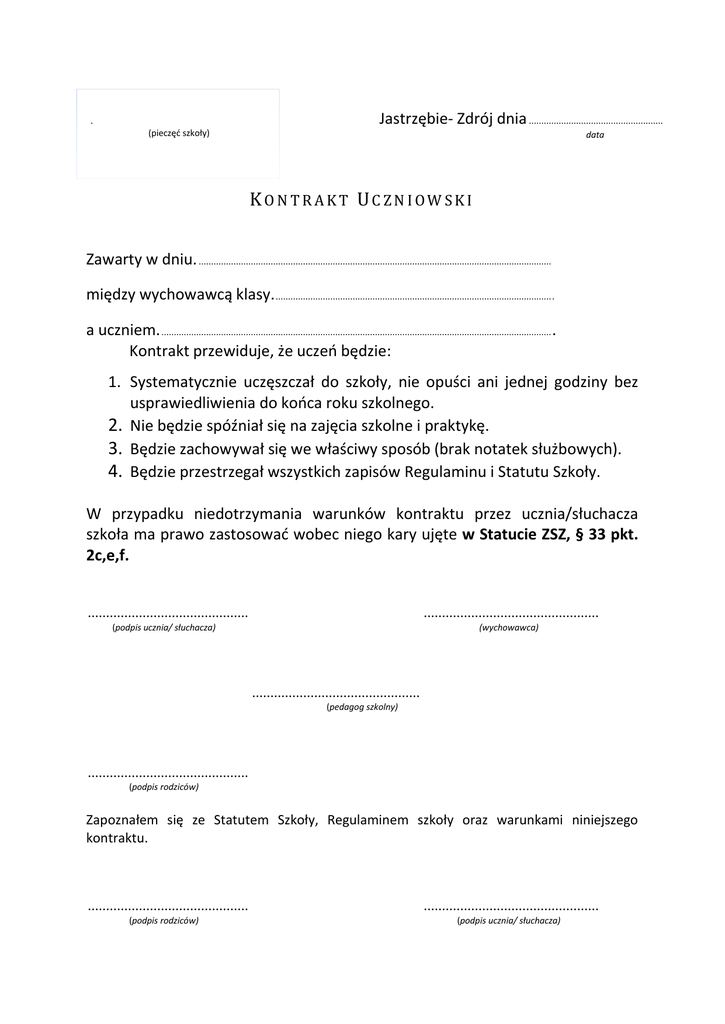 Jastrzębie- Zdrój dnia ...................................................... . (pieczęć szkoły) data KONTRAKT UCZNIOWSKI Zawarty w dniu. .............................................................................................................................................. między wychowawcą klasy. ............................................................................................................... . a uczniem. ............................................................................................................................................................. . Kontrakt przewiduje, że uczeń będzie: 1. Systematycznie uczęszczał do szkoły, nie opuści ani jednej godziny bez usprawiedliwienia do końca roku szkolnego. 2. Nie będzie spóźniał się na zajęcia szkolne i praktykę. 3. Będzie zachowywał się we właściwy sposób (brak notatek służbowych). 4. Będzie przestrzegał wszystkich zapisów Regulaminu i Statutu Szkoły. W przypadku niedotrzymania warunków kontraktu przez ucznia/słuchacza szkoła ma prawo zastosować wobec niego kary ujęte w Statucie ZSZ, § 33 pkt. 2c,e,f. ............................................ ................................................ (podpis ucznia/ słuchacza) (wychowawca) .............................................. (pedagog szkolny) ............................................ (podpis rodziców) Zapoznałem się ze Statutem Szkoły, Regulaminem szkoły oraz warunkami niniejszego kontraktu. ............................................ (podpis rodziców) ................................................ (podpis ucznia/ słuchacza)