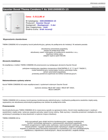 Informacje o produkcie Utworzono 07-03-2017 Saunier Duval Thema Condens F As S0010008835-15 Cena : 5.512,86 zł Nr katalogowy : S0010008833-15 Producent : Saunier Duval Dostępność : Dostępność - 3 dni Stan magazynowy : niski Średnia ocena : brak recenzji Wyposażenie standardowe THEMA CONDENS AS to kompletny kocioł jednofunkcyjny, gotowy do podłączenia do instalacji. W zestawie posiada: wbudowaną automatykę pogodową, zestaw do podłączenia kotła, wbudowany zawór trójdrogowy do podłączenia zasobnika c.w.u., regulację rodzaju gazu, adaptor wyjścia spalin 60/100. ● ● ● ● ● Akcesoria dodatkowe Do współpracy z kotłem THEMA CONDENS AS przeznaczone są następujące akcesoria Saunier Duval: pokojowe modulacyjne regulatory temperatury EXACONTROL E, E 7 C lub E 7 RADIO C, moduł wielofunkcyjny rozszerzający funkcje automatyki kotła, sensor automatyki pogodowej, przewody powietrzno-spalinowe do kotłów kondensacyjnych. ● ● ● ● Rekomendowane systemy solarne Kocioł THEMA CONDENS AS może współpracować z systemami solarnymi Saunier Duval: wybrane zestawy HELIO SET 150/3 i HELIO SET 250/3, HELIO CONCEPT. ● ● THEMA CONDENS AS to wiszący kocioł gazowy kondensacyjny jednofunkcyjny z możliwością podłączenia zasobnika ciepłej wody, wyposażony we wbudowaną automatykę pogodową oraz zestaw do podłączenia kotła. Przeznaczenie: Kocioł jednofunkcyjny THEMA CONDENS AS to nowoczesny sposób na ogrzewanie domu. Kocioł może współpracować z osobnym zasobnikiem ciepłej wody i wówczas zaspokoi potrzeby nawet licznej rodziny. Małe wymiary i niewielka przestrzeń niezbędna do celów serwisowych pozwalają na dużą dowolność w wyborze miejsca lokalizacji. THEMA CONDENS AS to: ● ● ● ● ● ● duża oszczędność gazu dzięki technice kondensacyjnej i regulacji modulacyjnej, komfort centralnego ogrzewania z zastosowaniem automatyki pogodowej, możliwość przygotowania ciepłej wody użytkowej z wykorzystaniem osobnego zasobnika, bezpieczeństwo i wygoda użytkowania dzięki najnowszym układom sterującym, wygodny w obsłudze panel sterowania wyposażony w wyświetlacz LCD oraz autodiagnostyka, współpraca z regulatorami modulacyjnymi więcej oszczędności i wygoda obsługi. Wygenerowano w programie www.oscGold.com