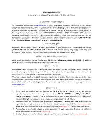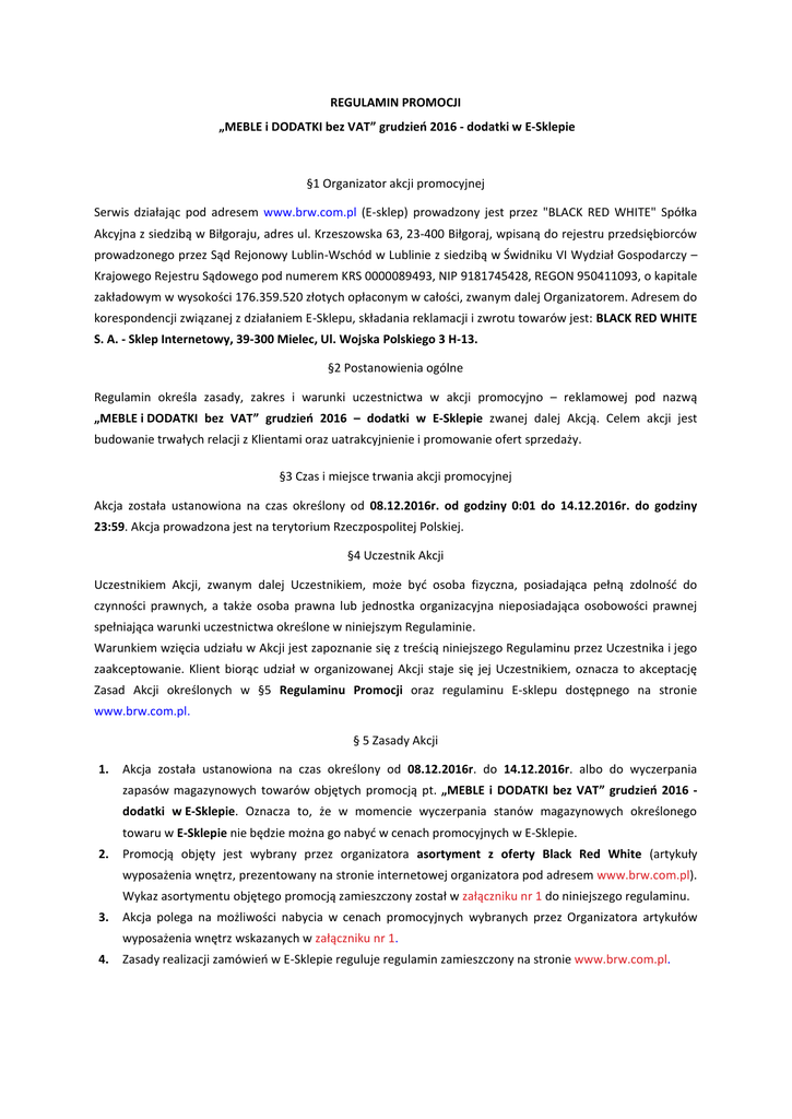 REGULAMIN PROMOCJI „MEBLE i DODATKI bez VAT” grudzień 2016 - dodatki w E-Sklepie §1 Organizator akcji promocyjnej Serwis działając pod adresem www.brw.com.pl (E-sklep) prowadzony jest przez "BLACK RED WHITE" Spółka Akcyjna z siedzibą w Biłgoraju, adres ul. Krzeszowska 63, 23-400 Biłgoraj, wpisaną do rejestru przedsiębiorców prowadzonego przez Sąd Rejonowy Lublin-Wschód w Lublinie z siedzibą w Świdniku VI Wydział Gospodarczy – Krajowego Rejestru Sądowego pod numerem KRS 0000089493, NIP 9181745428, REGON 950411093, o kapitale zakładowym w wysokości 176.359.520 złotych opłaconym w całości, zwanym dalej Organizatorem. Adresem do korespondencji związanej z działaniem E-Sklepu, składania reklamacji i zwrotu towarów jest: BLACK RED WHITE S. A. - Sklep Internetowy, 39-300 Mielec, Ul. Wojska Polskiego 3 H-13. §2 Postanowienia ogólne Regulamin określa zasady, zakres i warunki uczestnictwa w akcji promocyjno – reklamowej pod nazwą „MEBLE i DODATKI bez VAT” grudzień 2016 – dodatki w E-Sklepie zwanej dalej Akcją. Celem akcji jest budowanie trwałych relacji z Klientami oraz uatrakcyjnienie i promowanie ofert sprzedaży. §3 Czas i miejsce trwania akcji promocyjnej Akcja została ustanowiona na czas określony od 08.12.2016r. od godziny 0:01 do 14.12.2016r. do godziny 23:59. Akcja prowadzona jest na terytorium Rzeczpospolitej Polskiej. §4 Uczestnik Akcji Uczestnikiem Akcji, zwanym dalej Uczestnikiem, może być osoba fizyczna, posiadająca pełną zdolność do czynności prawnych, a także osoba prawna lub jednostka organizacyjna nieposiadająca osobowości prawnej spełniająca warunki uczestnictwa określone w niniejszym Regulaminie. Warunkiem wzięcia udziału w Akcji jest zapoznanie się z treścią niniejszego Regulaminu przez Uczestnika i jego zaakceptowanie. Klient biorąc udział w organizowanej Akcji staje się jej Uczestnikiem, oznacza to akceptację Zasad Akcji określonych w §5 Regulaminu Promocji oraz regulaminu E-sklepu dostępnego na stronie www.brw.com.pl. § 5 Zasady Akcji 1. Akcja została ustanowiona na czas określony od 08.12.2016r. do 14.12.2016r. albo do wyczerpania zapasów magazynowych towarów objętych promocją pt. „MEBLE i DODATKI bez VAT” grudzień 2016 dodatki w E-Sklepie. Oznacza to, że w momencie wyczerpania stanów magazynowych określonego towaru w E-Sklepie nie będzie można go nabyć w cenach promocyjnych w E-Sklepie. 2. Promocją objęty jest wybrany przez organizatora asortyment z oferty Black Red White (artykuły wyposażenia wnętrz, prezentowany na stronie internetowej organizatora pod adresem www.brw.com.pl). Wykaz asortymentu objętego promocją zamieszczony został w załączniku nr 1 do niniejszego regulaminu. 3. Akcja polega na możliwości nabycia w cenach promocyjnych wybranych przez Organizatora artykułów wyposażenia wnętrz wskazanych w załączniku nr 1. 4. Zasady realizacji zamówień w E-Sklepie reguluje regulamin zamieszczony na stronie www.brw.com.pl. § 6 Postanowienia końcowe 1. Regulamin wchodzi w życie z dniem 08.12.2016r. od godziny 0:01 i obowiązuje do dnia 14.12.2016r. do godziny 23:59, a jego treść dostępna jest w siedzibie spółki ”BLACK RED WHITE” S.A., oraz na stronie www.brw.com.pl. 2. We wszystkich sprawach nieuregulowanych w niniejszym Regulaminie zastosowanie mają odpowiednie przepisy Kodeksu Cywilnego.