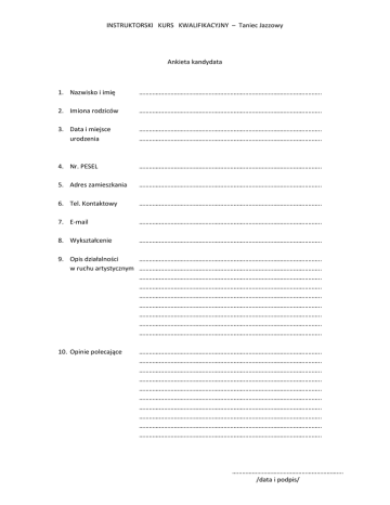 INSTRUKTORSKI KURS KWALIFIKACYJNY – Taniec Jazzowy Ankieta kandydata 1. Nazwisko i imię ……………………………………………………………………………………………….. 2. Imiona rodziców ……………………………………………………………………………………………….. 3. Data i miejsce urodzenia ……………………………………………………………………………………………….. ……………………………………………………………………………………………….. 4. Nr. PESEL ……………………………………………………………………………………………….. 5. Adres zamieszkania ……………………………………………………………………………………………….. 6. Tel. Kontaktowy ……………………………………………………………………………………………….. 7. E-mail ……………………………………………………………………………………………….. 8. Wykształcenie ……………………………………………………………………………………………….. 9. Opis działalności ……………………………………………………………………………………………….. w ruchu artystycznym ……………………………………………………………………………………………….. ……………………………………………………………………………………………….. ……………………………………………………………………………………………….. ……………………………………………………………………………………………….. ……………………………………………………………………………………………….. ……………………………………………………………………………………………….. ……………………………………………………………………………………………….. ……………………………………………………………………………………………….. 10. Opinie polecające ……………………………………………………………………………………………….. ……………………………………………………………………………………………….. ……………………………………………………………………………………………….. ……………………………………………………………………………………………….. ……………………………………………………………………………………………….. ……………………………………………………………………………………………….. ……………………………………………………………………………………………….. ……………………………………………………………………………………………….. ……………………………………………………………………………………………….. ……………………………………………………………………………………………….. …………………………………………………………. /data i podpis/