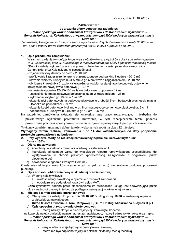 Otwock, dnia 11.10.2016 r. ZAPROSZENIE do złożenia oferty cenowej na zadanie pt: „Remont parkingu wraz z obniżeniem krawężników i dostosowaniem wjazdów w ul. Generalskiej oraz ul. Kuklińskiego z wykorzystaniem płyt MON będących własnością miasta Otwocka” Zamówienie, którego wartość nie przekracza wyrażonej w złotych równowartości kwoty 30 000 euro - art. 4 pkt 8 ustawy prawo zamówień publicznych (Dz.U. z 2015 r. poz.2164 ze. zm ). 1. Opis przedmiotu zamówienia: W ramach zadania remont parkingu wraz z obniżeniem krawężników i dostosowaniem wjazdów w ul. Generalskiej oraz ul. Kuklińskiego z wykorzystaniem płyt MON będących własnością miasta Otwocka należy wykonać prace związane z utwardzeniem części pasa drogowego ulicy Generalskiej oraz Kuklińskiego w szczególności: - zdjęcie warstwy darniny do 5 cm - 2010 m2 - profilowanie i zagęszczenie terenu przeznaczonego pod parking i jezdnię - 2010 m2 - ułożenie warstwy kruszywa 0-31.5 mm o gr. 5 cm wraz z zagęszczeniem - 2010 m2 - obniżenie krawężnika ( rozbiórka krawężnika, rozbiórka starej ławy betonowej, ustawienie krawężnika na nowej ławie betonowej ) – 27 m - ustawienie opornika 12x25x100 na ławie betonowej z oporem – 12 m - uszczelnienie masą zalewową połączenia jezdni z krawężnikiem – 27 m - wykonanie koryta o gr. 10 cm – 124 m2 - ułożenie płyt betonowych na podsypce piaskowej o grubości 5 cm. będących własnością miasta Otwocka na powierzchni - 99 m2, - ułożenie kostki betonowej Holland o gr. 8 cm na posypce cementowo piaskowej gr. 3 cm i podbudowie z kruszywa 0-31/5 mm o gr. 10 cm – 25 m2 niezbędne do Na przedmiot zamówienia składają się wszystkie inne prace towarzyszące, prawidłowego wykonania przedmiotu zmówienia, w tym zabezpieczenie terenu podczas prowadzenia prac oraz uporządkowania terenu w rejonie wykonywanych prac po ich zakończeniu. Wykonawca udzieli gwarancji dobrej jakości wykonanych robót na okres 12 miesięcy. Wymagany termin realizacji zamówienia : do 14 dni kalendarzowych od daty podpisania protokołu wprowadzenia na budowę. 2. Przy wyborze oferty do realizacji zamawiający będzie się kierował kryterium: Cena – 100% 3. Oferta ma zawierać: a) kompletny, wypełniony formularz ofertowy - załącznik nr 1 b) kserokopię aktualnego wpisu do właściwego rejestru, uprawniającego zleceniobiorcę do występowania w obrocie prawnym (potwierdzoną za zgodność z oryginałem przez zleceniobiorcę) c) oświadczenie zgodnie z załącznikiem nr 2 Oferta niespełniająca warunków wymienionych w pkt. a) – c) nie zostanie poddana procesowi punktacji. 4. Opis sposobu obliczania ceny w składanej ofercie cenowej: A) W cenę należy wliczyć: a) wartość usługi określoną w oparciu o przedmiot zamówienia, b) obowiązujący podatek od towarów i usług VAT, Cena ryczałtowa podana przez zleceniobiorcę za świadczoną usługę jest obowiązująca przez okres ważności umowy i nie będzie podlegała waloryzacji w okresie jej trwania. 5. Miejsce i termin złożenia oferty cenowej: a) Ofertę cenową należy złożyć do dnia 18.10.2016r. do godziny 10.00 w zaklejonej kopercie w siedzibie zamawiającego: Urząd Miasta Otwocka ul. Armii Krajowej 5 , Biuro Obsługi Mieszkańca budynek B p.1 b) Opis sposobu przygotowania oferty cenowej: ofertę należy złożyć w nieprzejrzystej i zamkniętej kopercie, na kopercie należy umieścić nazwę i adres zamawiającego, nazwę i adres wykonawcy oraz napis: „Remont parkingu wraz z obniżeniem krawężników i dostosowaniem wjazdów w ul. Generalskiej oraz ul. Kuklińskiego z wykorzystaniem płyt MON będących własnością miasta Otwocka” - ceny w ofercie mają być wyrażone cyfrowo i słownie, oferta ma być napisana w języku polskim, czytelną i trwałą techniką. c) Oferta cenowa otrzymana przez zamawiającego po terminie poddanym powyżej zostanie zniszczona. d) Wykonawca może wprowadzić zmiany lub wycofać złożoną przez siebie ofertę cenową przed terminem upływu jej składania. 6. Osobami uprawnionymi do kontaktów z wykonawcami są: Michał Piłka Sebastian Witkowski tel. 22 779 20 01 w. 139 [email protected] 2 Załącznik nr 1 ...................................., dnia…………r. Zamawiający: Gmina Otwock, którą reprezentuje Prezydent Miasta Otwocka, ul. Armii Krajowej 5, 05-400 Otwock, tel. 22 779 20 01 Wykonawca / zarejestrowana nazwa/ imię i nazwisko: ......................................................................................... .............................................................................................. adres Wykonawcy: ulica ....................................... nr domu ..... kod ..................... miejscowość ........................................................... powiat ................................. województwo ........................................ tel.: ..................................... fax: ................................. REGON:................................ NIP: ................................ OFERTA CENOWA Odpowiadając na zaproszenie do złożenia oferty cenowej w ramach zadania pn.: „Remont parkingu wraz z obniżeniem krawężników i dostosowaniem wjazdów w ul. Generalskiej oraz ul. Kuklińskiego z wykorzystaniem płyt MON będących własnością miasta Otwocka” Oferuję wykonanie przedmiotu zamówienia, zgodnie z wymogami opisu przedmiotu zamówienia : 1. „Remont parkingu wraz z obniżeniem krawężników i dostosowaniem wjazdów w ul. Generalskiej oraz ul. Kuklińskiego z wykorzystaniem płyt MON będących własnością miasta Otwocka” za kwotę w wysokości: netto: …..….….…zł (słownie……………….……………………….…………...…………………) podatek VAT….% tj: ….……zł. (słownie:………………………………........……………………) brutto: ……….zł.(słownie:……………………………………………