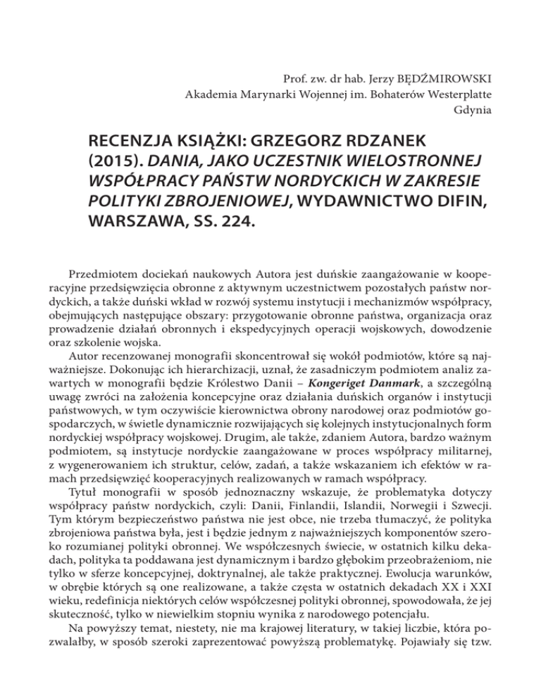 Prof. zw. dr hab. Jerzy BĘDŹMIROWSKI Akademia Marynarki Wojennej im. Bohaterów Westerplatte Gdynia RECENZJA KSIĄŻKI: GRZEGORZ RDZANEK (2015). DANIA, JAKO UCZESTNIK WIELOSTRONNEJ WSPÓŁPRACY PAŃSTW NORDYCKICH W ZAKRESIE POLITYKI ZBROJENIOWEJ, WYDAWNICTWO DIFIN, WARSZAWA, SS. 224. Przedmiotem dociekań naukowych Autora jest duńskie zaangażowanie w kooperacyjne przedsięwzięcia obronne z aktywnym uczestnictwem pozostałych państw nordyckich, a także duński wkład w rozwój systemu instytucji i mechanizmów współpracy, obejmujących następujące obszary: przygotowanie obronne państwa, organizacja oraz prowadzenie działań obronnych i ekspedycyjnych operacji wojskowych, dowodzenie oraz szkolenie wojska. Autor recenzowanej monografii skoncentrował się wokół podmiotów, które są najważniejsze. Dokonując ich hierarchizacji, uznał, że zasadniczym podmiotem analiz zawartych w monografii będzie Królestwo Danii – Kongeriget Danmark, a szczególną uwagę zwróci na założenia koncepcyjne oraz działania duńskich organów i instytucji państwowych, w tym oczywiście kierownictwa obrony narodowej oraz podmiotów gospodarczych, w świetle dynamicznie rozwijających się kolejnych instytucjonalnych form nordyckiej współpracy wojskowej. Drugim, ale także, zdaniem Autora, bardzo ważnym podmiotem, są instytucje nordyckie zaangażowane w proces współpracy militarnej, z wygenerowaniem ich struktur, celów, zadań, a także wskazaniem ich efektów w ramach przedsięwzięć kooperacyjnych realizowanych w ramach współpracy. Tytuł monografii w sposób jednoznaczny wskazuje, że problematyka dotyczy współpracy państw nordyckich, czyli: Danii, Finlandii, Islandii, Norwegii i Szwecji. Tym którym bezpieczeństwo państwa nie jest obce, nie trzeba tłumaczyć, że polityka zbrojeniowa państwa była, jest i będzie jednym z najważniejszych komponentów szeroko rozumianej polityki obronnej. We współczesnych świecie, w ostatnich kilku dekadach, polityka ta poddawana jest dynamicznym i bardzo głębokim przeobrażeniom, nie tylko w sferze koncepcyjnej, doktrynalnej, ale także praktycznej. Ewolucja warunków, w obrębie których są one realizowane, a także częsta w ostatnich dekadach XX i XXI wieku, redefinicja niektórych celów współczesnej polityki obronnej, spowodowała, że jej skuteczność, tylko w niewielkim stopniu wynika z narodowego potencjału. Na powyższy temat, niestety, nie ma krajowej literatury, w takiej liczbie, która pozwalałby, w sposób szeroki zaprezentować powyższą problematykę. Pojawiały się tzw. 264 Rocznik Bezpieczeństwa Międzynarodowego 2016, vol. 10, nr 1 szczątkowe informacje, w niektórych publikatorach, w tzw. obiegu – do służbowego wykorzystania. Dlatego wielki ukłon i szacunek dla Autora – doktora Grzegorza Rdzanka. Przechodząc do oceny merytorycznej, zgodzić należy się z główna tezą dr Rdzanka, że system obronny państwa oraz stanowiące jego część siły zbrojne, gwarantują odpowiednie przygotowanie do obrony oraz zapewniają odpowiednie zaopatrzenie w środki niezbędne do odparcia wrogiej napaści, kiedy polityka obronna państwa – polityka zbrojeniowa państwa, zostanie umiędzynarodowiona. Innymi słowy rzecz ujmując, kiedy zostaną one włączone w bilateralne i wielostronne porozumienia uwzględniające nie tylko obszar politycznej współpracy, ale także militarnej. Chcąc pokazać mechanizmy wielostronnej współpracy w szeroko rozumianym bezpieczeństwie, Autor postanowił omówić w oparciu o duńską politykę zbrojeniową funkcjonującą w ramach nordyckiej współpracy wojskowej. Polityka zbrojeniowa – podobnie, jak polityka obronna państwa – realizowana jest zawsze w pewnym, charakterystycznym, a także wyjątkowym dla danego państwa, środowisku międzynarodowym. Niemal wszystkie współczesne państwa Starego Kontynentu stają dziś przed jednym z najbardziej kluczowych dla narodowego bezpieczeństwa wyzwań: W jaki sposób zachować możliwość wykonywania przez siły zbrojne podstawowych funkcji z punktu widzenia potrzeb obronnych i potencjalnych zagrożeń oraz w jaki sposób utrzymać odpowiednią równowagę w obrębie struktur i potencjałów pomiędzy poszczególnymi rodzajami sił oraz rodzajami wojsk ? Autor słusznie zauważa, i zarazem wyjaśnia, że pojęcie „państwa nordyckie” jest określeniem znacznie szerszym niż „państwa skandynawskie”. Za Skandynawię w ujęciu geopolitycznym oraz ekonomicznym uznaje się współcześnie trzy państwa regionu północnej Europy: Danię, Norwegię oraz Szwecję. Potraktowanie państw nordyckich, jako swoistej wspólnoty współpracy lub silnie zunifikowanego obiektu analiz wynika przede wszystkim z faktu, że wszystkie one, czyli Dania, Finlandia, Islandia, Norwegia i Szwecja, zaangażowane były i są nadal w kolejne formy zinstytucjonalizowanej współpracy wojskowej. Autor słusznie zauważa, że ze względów metodologicznych nie jest możliwe ograniczenie rozważań jedynie do państw skandynawskich, czyli współpracy wojskowej pomiędzy Danią a Norwegią i Szwecją. Nie wolno pominąć Republiki Islandii, która chociaż nie dysponuje siłami zbrojnymi, to ma dobrze przygotowany system ochrony i obrony własnego terytorium, z wykorzystaniem służby cywilnej. Zdaniem Autora, i tu również należy się z nim zgodzić, trzeba pamiętać o tym, że państwo to stanowi ważny element nordyckiego systemu bezpieczeństwa, chociażby ze względu na szczególne położenie geograficzne w północnej części wód Oceanu Atlantyckiego, w pobliżu arktycznych szlaków żeglugowych. Islandia jest silnie powiązania politycznie z pozostałymi państwami nordyckimi. W następstwie pogłębiających się więzów i zależności w dziedzinie bezpieczeństwa pomiędzy Islandią a Danią, Norwegią i Szwecją, na początku XXI wieku współpraca pomiędzy tymi państwami poszerzona została o różne aspekty związane z 
