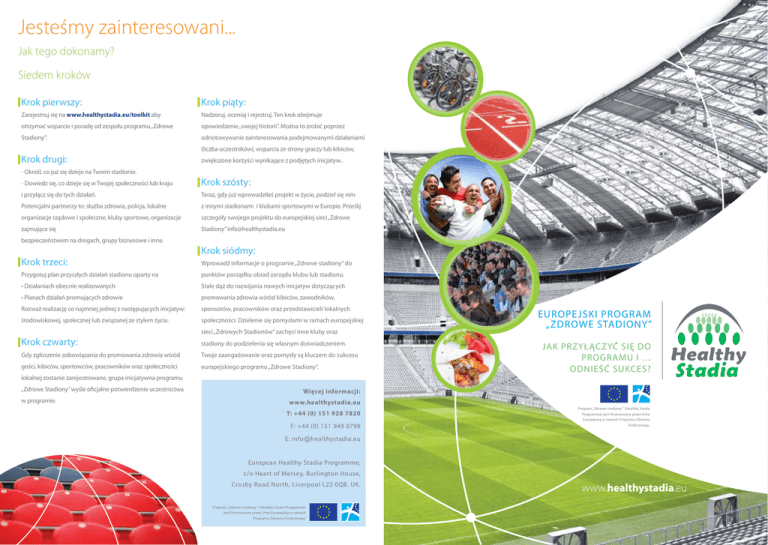 Jesteśmy zainteresowani... Jak tego dokonamy? Siedem kroków Krok pierwszy: Krok piąty: Zarejestruj się na www.healthystadia.eu/toolkit aby Nadzoruj, oceniaj i rejestruj. Ten krok obejmuje otrzymać wsparcie i poradę od zespołu programu „Zdrowe opowiedzenie „swojej historii”. Można to zrobić poprzez Stadiony”. odnotowywanie zainteresowania podejmowanymi działaniami (liczba uczestników), wsparcia ze strony graczy lub kibiców, Krok drugi: zwiększone korzyści wynikające z podjętych inicjatyw.. - Określ, co już się dzieje na Twoim stadionie. -D owiedz się, co dzieje się w Twojej społeczności lub kraju Krok szósty: i przyłącz się do tych działań. Teraz, gdy już wprowadziłeś projekt w życie, podziel się nim Potencjalni partnerzy to: służba zdrowia, policja, lokalne z innymi stadionami i klubami sportowymi w Europie. Prześlij organizacje rządowe i społeczne, kluby sportowe, organizacje szczegóły swojego projektu do europejskiej sieci „Zdrowe zajmujące się Stadiony” [email protected] bezpieczeństwem na drogach, grupy biznesowe i inne. Krok trzeci: Krok siódmy: Wprowadź informacje o programie „Zdrowe stadiony” do Przygotuj plan przyszłych działań stadionu oparty na punktów porządku obrad zarządu klubu lub stadionu. • Działaniach obecnie realizowanych Stale dąż do rozwijania nowych inicjatyw dotyczących • Planach działań promujących zdrowie promowania zdrowia wśród kibiców, zawodników, Rozważ realizację co najmniej jednej z następujących inicjatyw: sponsorów, pracowników oraz przedstawicieli lokalnych środowiskowej, społecznej lub związanej ze stylem życia. społeczności. Dzielenie się pomysłami w ramach europejskiej sieci „Zdrowych Stadionów” zachęci inne kluby oraz Krok czwarty: stadiony do podzielenia się własnym doświadczeniem. Gdy zgłoszenie zobowiązania do promowania zdrowia wśród Twoje zaangażowanie oraz pomysły są kluczem do sukcesu gości, kibiców, sportowców, pracowników oraz społeczności europejskiego programu „Zdrowe Stadiony”. lokalnej zostanie zarejestrowane, grupa inicjatywna programu „Zdrowe Stadiony” wyśle oficjalne potwierdzenie uczestnictwa w programie. EUROPEJSKI PROGRAM „ZDROWE STADIONY” Jak przyłączyć się do Programu i … odnieść SUKCES? Więcej informacji: www.healthystadia.eu T: +44 (0) 151 928 7820 F: +44 (0) 151 949 0799 Program „Zdrowe stadiony ” (Healthy Stadia Programme) jest finansowany przez Unię Europejską w ramach Programu Zdrowia Publicznego. E: [email protected] European Healthy Stadia Programme, c/o Heart of Mersey, Burlington House, Crosby Road North, Liverpool L22 0QB. UK. Program „Zdrowe stadiony ” (Healthy Stadia Programme) jest finansowany przez Unię Europejską w ramach Programu Zdrowia Publicznego. www.healthystadia.eu Czym jest europejski program „Zdrowe stadiony”? EUROPEJSKI PROGRAM „ZDROWE STADIONY” Jak przyłączyć się do Programu i … odnieść SUKCES? Naszym celem jest aktywna współpraca ze stadionami, klubami sportowymi i innymi organizacjami na terenie całej Europy w zakresie wspierania i promowania zdrowego trybu życia u wszystkich osób, które są związane z obiektami sportowymi, odwiedzają je oraz mieszkają w ich pobliżu. W realizacji tego celu pomaga program „Zdrowe Stadiony”. Jesteśmy przekonani, że obiekty sportowe oraz ludzie tacy jak Ty mogą wiele zdziałać w zakresie promocji zdrowego stylu życia. Czym jest „Zdrowy Stadion”? „Zdrowy stadion to taki obiekt, który promuje zdrowie wśród odwiedzających go gości, kibiców, zawodników, pracowników i wszystkich mieszkających w jego pobliżu… …. To miejsce, w którym można w sprzyjających zdrowiu warunkach uprawiać sport lub oglądać wydarzenia sportowe. To także miejsce, w którym promuje się zdrowy tryb życia wśród osób mieszkających w jego najbliższym sąsiedztwie”. Dlaczego warto dołączyć do programu? Stadionom, partnerom oraz społecznościom, które dołączą do akcji, oferujemy wiele korzyści, niezależnie od tego, czy będą to stowarzyszenia czy osoby prywatne. Program „Zdrowe Stadiony” gwarantuje pomoc w zakresie: - Wspierania i promowania zdrowia wśród zawodników, członków klubu, pracowników oraz przedstawicieli lokalnych społeczności - Rozwijania i poprawy wzajemnych stosunków z lokalną społecznością Z czym się to wiąże? Co należy zrobić? • określić, jakie działania oraz inicjatywy zostały podjęte w celu promowania zdrowia • opracować plan rozwijania projektów społecznych, środowiskowych oraz dotyczących stylu życia, promujących zdrowie. - Nawiązywania kontaktów na obszarze kontynentu w ramach europejskiej sieci „Zdrowe Stadiony” - Nauki oraz dzielenia się doświadczeniami stadionów z całej Europy - Zdobycia możliwych środków finansowych krajowych i europejskich - Zdobycia poparcia najważniejszych struktur i organizacji sportowych. „Osiąganiu celów biznesowych towarzyszy dbałość o realizację celów z zakresu zdrowia publicznego lokalnej społeczności”. Przykładowe inicjatywy to: montaż stojaka na rowery, oferowanie zdrowej żywności, przeprowadzanie badań stanu zdrowia pracowników, zaproszenie zawodników do współudziału w promowaniu zdrowego stylu życia itd. Więcej przykładów zamieszczono na stronie www.healthystadia.eu/toolkit
