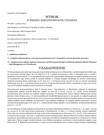 Sygnatura akt I C 55/15 WYROK W IMIENIU RZECZYPOSPOLITEJ POLSKIEJ Wrocław, 14 maja 2015 r. Sąd Okręgowy we Wrocławiu I Wydział Cywilny w składzie: Przewodniczący: SSO Grzegorz Karaś Protokolant: Błażej Łój po rozpoznaniu na rozprawie w dniu 14 maja 2015 r. we Wrocławiu sprawy z powództwa G. S. przeciwko B. T. o zapłatę I. oddala powództwo; II. zasądza od powoda na rzecz pozwanej kwotę 3.617 zł tytułem zwrotu kosztów procesu; III. nieuiszczoną opłatą sądową od pozwu od której powód był zwolniony obciąża Skarb Państwa – Sąd Okręgowy we Wrocławiu. UZASADNIENIE W toku postępowania sądowego toczącego się przed Sądem Rejonowym w Kluczborku o podział majątku dorobkowego po orzeczeniu rozwodu (sygn. akt I Ns 653/12), G. S. w piśmie procesowym z dnia 12 listopada 2013 r. wniósł o zasądzenie od pozwanej B. T. zwrotu nakładów poczynionych z jego majątku odrębnego na majątek odrębny pozwanej. W uzasadnieniu tego pisma podał, że poniósł nakłady ze swojego majątku odrębnego na remont stanowiącego własność pozwanej domu położonego we W. przy ul. (...) na łączną kwotę 150.000 zł oraz na remont mieszkania położonego przy ul. (...) na łączną kwotę 25.000 zł. Z tego powodu powód wniósł o zasądzenie na jego rzecz kwoty 175.000 zł tytułem wydatków poczynionych na te remonty. Prawomocnym postanowieniem z dnia 8 stycznia 2014 r. Sąd Rejonowy w Kluczborku wyłączył do odrębnego postępowania żądanie powoda dotyczące zapłaty na rzecz B. T. kwoty 175.000 zł z tytułu zwrotu nakładów poczynionych przez powoda na majątek odrębny pozwanej. Po przekazaniu sprawy Sądowi Okręgowemu powód pismem z dnia 28 lipca 2014 r. (k. 38) zmodyfikował i dookreślił żądanie pozwu w ten sposób, że zażądał zasądzenia od pozwanej na rzecz powoda kwoty 85.700 zł z ustawowymi odsetkami od dnia doręczenia pisma pozwanej do dnia zapłaty tytułem zwrotu nakładów poczynionych z jego majątku odrębnego na majątek odrębny pozwanej w postaci remontu domu położonego we W. przy ul. (...), jednocześnie cofając żądanie o zwrot nakładów na mieszkanie położone przy ul. (...) we W.. Na uzasadnienie swojego żądania powód podał, że pozwana nabyła dom położony we W.przy ul. (...)w 1996 r. za cenę ok. 30.000 zł. W roku 1996 strony pozostawały w konkubinacie. W dniu (...) r. Strony zawarły związek małżeński. Przez cały czas trwania małżeństwa do roku 2006 strony zamieszkiwały w domu przy ul. (...)we W.. Prace remontowe w domu trwały od 1996 r. do 2000 r. i podniosły znacznie standard domu. Remont domu był możliwy dzięki środkom pieniężnym zgromadzonym przez powoda w czasie gdy prowadził on działalność gospodarczą w Niemczech w latach 1989-1997, z której osiągał wysokie dochody oraz środkom pieniężnym uzyskanym z tytułu podziału majątku z jego byłą żoną M. S.. Remont był prowadzony w czasie trwania konkubinatu oraz w czasie trwania związku małżeńskiego stron. Powód wycenił wartość wszystkich prac remontowych prowadzonych na 150.000 zł jednak ograniczył swoje roszczenie do kwoty 85.000 zł. Żądaniem pozwu zostały objęte następujące prace remontowe: 1) prace rozbiórkowe - 5.000 zł, 2) montaż nowego dachu wraz z materiałami – 18.000 zł, 3) zakup i montaż nowych okien – 8.000 zł, 4) remont elewacji wraz z jej ociepleniem – 6.300 zł, 5) wzmacnianie stropu w łazience – 1.500 zł, 6) wylewka stropu na parterze – 1.400 zł, 7) montaż płotu z cegły klinkierowej – 1.200 zł, 8) montaż na ścianach płyt gipsowych – 2.500 zł, 9) wykonanie i montaż bramy, tralek i furtki – 1.400 zł, 10) wykonanie tarasu i schodów do piwnicy – 3.500 zł, 11) wykonanie instalacji elektrycznej – 12.000 zł 12) położenie kafelek – 3.900 zł, 13) wykonanie instalacji grzewczej i wodnokanalizacyjnej – 13.000 zł, 14) budowa garaży – 3.000 zł, 15) zakup schodów, poręczy i paneli sufitowych z montażem – 5.000 zł. W odpowiedzi na pozew w piśmie z dnia 26 września 2014 r. pozwana wniosła o oddalenie powództwa w całości podnosząc zarzut przedawnienia roszczenia powoda. Precyzując swoje stanowisko pozwana pismem z dnia 19 lutego 2015 r. podtrzymała zarzut przedawnienia roszczenia. Ponadto pozwana zaprzeczyła, by to powód ponosił nakłady na nieruchomość pozwanej położną we W. przy ul. (...). Remont domu przeprowadzony był w ciągu 4 miesięcy w okresie od lipca do października 1996 r. W drugiej połowie października 1996 r. powód wraz z pozwaną i jej córką zamieszkali w domu przy ul. (...). Pozwana wyprowadzając się z mieszkania pozwanej położonego we W. przy ul (...), od dnia 10.10.1996 r. wynajęła je osobie trzeciej. Remont domu przy ul. (...) przeprowadzony był systemem gospodarczym przy zastosowaniu tanich materiałów i technologii. Z czasu remontu nie zachowały się rachunki poza rachunkiem na zakup okien. Powód dozorował prace prowadzone przez robotników. Pozwany wraz z pozwaną zamieszkiwał w domu przy ul. (...) do maja 2005 r. i w tym czasie prowadzone były jedynie prace obejmujące drobne naprawy. Pozwana zaprzeczyła także by powód ponowił koszty remontu, bowiem nie posiadał od środków pieniężnych wskazanych w pozwie. Na rozprawie w dniu 14 maja 2015 r. odnosząc się do podstawy prawnej swojego roszczenia podał że domaga się zwrotu nakładów w oparciu o art. 224 KC ewentualnie w oparciu o przepisy dotyczące bezpodstawnego wzbogacenia pozwanej. Odnosząc się natomiast do podniesionego przez pozwaną zarzutu przedawnienia, pozwany oświadczył, że zarzut przedawnienia stanowi naruszenie art. 5 KC. Powód wskazał także, ewentualną podstawę swojego roszczenia podając, że pozwana jest bezpodstawnie wzbogacona jego kosztem. Sad ustalił, co następuje: Dom położony we W. przy ul. (...) został zakupiony przez pozwaną w 1996 r. do jej majaku odrębnego. Po zakupie nieruchomości strony bę
