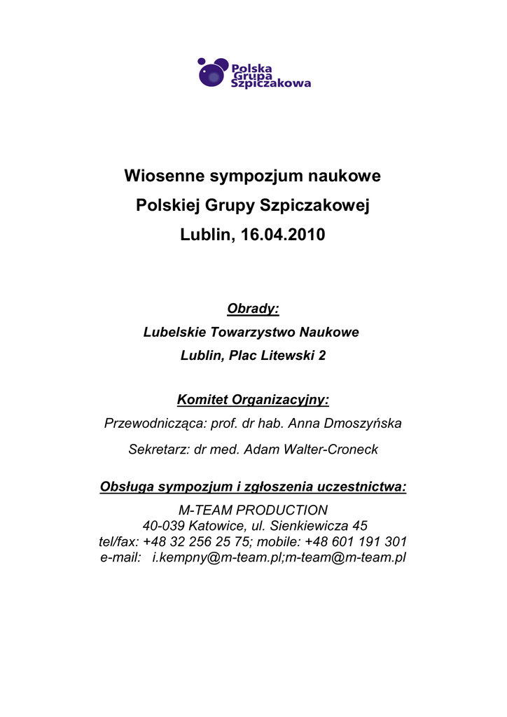 Wiosenne sympozjum naukowe Polskiej Grupy Szpiczakowej Lublin, 16.04.2010 Obrady: Lubelskie Towarzystwo Naukowe Lublin, Plac Litewski 2 Komitet Organizacyjny: Przewodnicząca: prof. dr hab. Anna Dmoszyńska Sekretarz: dr med. Adam Walter-Croneck Obsługa sympozjum i zgłoszenia uczestnictwa: M-TEAM PRODUCTION 40-039 Katowice, ul. Sienkiewicza 45 tel/fax: +48 32 256 25 75; mobile: +48 601 191 301 e-mail: [email protected];[email protected] Program sympozjum Polskiej Grupy Szpiczakowej Piątek, 16.04.2010 12:00 – 13:00 obiad w Sali Kominkowej LTN 13:00 - 13:20 Leczenie niedokrwistości towarzyszącej szpiczakowi - doc.dr hab. Iwona Hus, Kl. Hematoonkologii UM w Lublinie 13:20 - 13:50 Propozycja wspólnego programu leczenia opornych postaci szpiczaka z zastosowaniem bendamustyny - doc.dr hab. Iwona Hus, Kl. Hematoonkologii UM w Lublinie 13:50 - 14.15 Pozaszpikowa progresja szpiczaka plazmocytowego w następstwie leczenia talidomidem - prof.dr hab. Maria Kraj, IHiTw Warszawie 14.15 – 14. 35 Wybrane zmiany genetyczne w diagnostyce szpiczaka, metody wykrywania i ich wpływ na rokowanie - dr Małgorzata PaszkowskaKowalewska, Klinika Hematologii, Onkologii i Chorób Wewnętrznych CSK UM w Warszawie 14.35 – 14.50 dyskusja 14.50 - 15.20 przerwa kawowa w Sali Kominkowej LTN 15.20 – 16.20 Omówienie dotychczasowych wyników leczenia schematem PAD - dr med. Maria Soroka-Wojtaszko, Kl. Hematoonkologii UM w Lublinie Dyskusja nad nowelizacją kryteriów włączenia chorych do programu lekowego NFZ dotyczącego leczenia szpiczaka mnogiego - prof.dr hab. AnnaDmoszyńska, Kl. Hematoonkologii UM w Lublinie Zastosowanie bortezomibu w leczeniu pierwszej linii szpiczaka mnogiego - dr Artur Jurczyszyn, Klinika Hematologii CM UJ w Krakowie 16.20 – 16.50 Mechanizm działania lenalidomidu – prof. Jacek Roliński, Zakład Immunologii Klinicznej UM w Lublinie 17.00 – 18.00 recital chopinowski w wykonaniu prof. Zbigniewa Raubo (Akademia Muzyczna w Katowicach), prowadzenie dyrektor Teresa Księska-Falger (Filharmonia Lubelska) 18.15 – 18.35 Rola i miejsce przeszczepiania auto i alogenicznych komórek krwiotwórczych w szpiczaku mnogim – doc. dr hab. Małgorzata KrawczykKuliś, Klinika Hematologii ŚUM w Katowicach 18.35 – 19.00 Szczepionki peptydowe w szpiczaku mnogim – doc. dr hab. Krzysztof Giannopoulos, Zakład Immunologii Klinicznej UM w Lublinie 19.00 - 19.25 Leczenie konsolidujące i podtrzymujące szpiczaka mnogiego - dr Krzysztof Jamroziak, Klinika Hematologii UM w Łodzi 19.30 – 21.00 kolacja w restauracji Hotelu Europa Przewodnicząca prof. dr hab. Anna Dmoszyńska: Sekretarz dr med. Adam Walter-Croneck