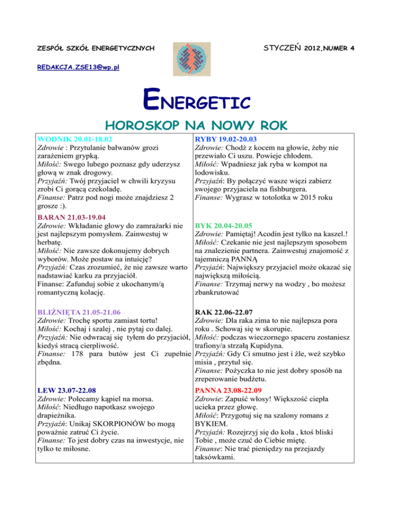 STYCZEŃ 2012,NUMER 4 ZESPÓŁ SZKÓŁ ENERGETYCZNYCH [email protected] ENERGETIC HOROSKOP NA NOWY ROK WODNIK 20.01-18.02 Zdrowie : Przytulanie bałwanów grozi zarażeniem grypką. Miłość: Swego lubego poznasz gdy uderzysz głową w znak drogowy. Przyjaźń: Twój przyjaciel w chwili kryzysu zrobi Ci gorącą czekoladę. że znajdziesz 2 Finanse: Patrz pod nogi może grosze :). BARAN 21.03-19.04 Zdrowie: Wkładanie głowy do zamrażarki zamra nie jest najlepszym pomysłem. Zainwestuj w herbatę. Miłość: Nie zawsze dokonujemy dobrych wyborów. Możee postaw na intuicję? intuicję Przyjaźń: Czas zrozumieć, ć że nie zawsze warto nadstawiać karku za przyjaciół. Finanse: Zafunduj sobie z ukochanym/ą ukochanym/ romantyczną kolację. RYBY 19.02-20.03 Zdrowie: Chodź z kocem na głowie, żeby nie przewiało Ci uszu. u. Powieje chłodem. Miłość: Wpadniesz jak ryba w kompot na lodowisku. Przyjaźń: By połączyćć wasze więzi wi zabierz swojego przyjaciela na fishburgera. Finanse: Wygrasz w totolotka w 2015 roku BYK 20.04-20.05 Zdrowie: Pamiętaj! taj! Acodin jest tylko na kaszel.! Miłość: Czekanie nie jest najlepszym sposobem na znalezienie partnera. Zainwestuj znajomość znajomo z tajemniczą PANNĄ Przyjaźń: Największy kszy przyjaciel może mo okazać się największą miłością. mo Finanse: Trzymaj nerwy na wodzy , bo możesz zbankrutować BLIŹNIĘTA 21.05-21.06 Zdrowie: Trochę sportu zamiast tortu! Miłość: Kochaj i szalej , nie pytaj co dalej. Przyjaźń: Nie odwracaj sięę tyłem do przyjaciół, kiedyś stracą cierpliwość. Finanse: 178 para butów jest Ci zupełnie zbędna. RAK 22.06-22.07 Zdrowie: Dla raka zima to nie najlepsza pora roku . Schowaj się w skorupie. Miłość: podczas wieczornego spaceru zostaniesz trafiony/a strzałą Kupidyna. Przyjaźń: Gdy Ci smutno jest i źle, weź szybko misia , przytul się. Finanse: Pożyczka yczka to nie jest dobry sposób na zreperowanie budżetu. LEW 23.07-22.08 Zdrowie: Polecamy kąpiel piel na morsa. Miłość:: Niedługo napotkasz swojego drapieżnika. Przyjaźń:: Unikaj SKORPIONÓW bo mogą mog poważnie zatruć Ci życie. Finanse: To jest dobry czas na inwestycje, nie tylko te miłosne. PANNA 23.08-22.09 Zdrowie: Zapuść włosy! Większość Wię ciepła ucieka przez głowę. Miłość: Przygotuj sięę na szalony romans z BYKIEM. Przyjaźń: Rozejrzyj sięę do koła , ktoś kto bliski Tobie , może czuć do Ciebie miętę. mi Finanse: Nie trać pieniędzy ędzy na przejazdy taksówkami. WAGA 23.09-22.10 Zdrowie: Wietrząc swój pokój uważaj byś nie wypadł/a z okna . Miłość: Kto powiedział , że nie wchodzi się dwa razy do tej samej rzeki? Przyjaźń: Czas odbudować przyjaźnie z dawnych lat. Finanse: Przelicz resztę wychodząc z Biedronki. SKORPION 23.10-21.11 Zdrowie: Nie było by Ci cieplej w pantalonach? Miłość: Czas na poważne plany. Zastanów się nad data ślubu. Przyjaźń: Twój wróg może okazać się Twoim sprzymierzeńcem. Finanse: Zafunduj sobie małą przyjemność. STRZELEC 22.11-21.12 Zdrowie: Kryzys zdrowotny nieunikniony , lepiej zamów wizytę u lekarza. Miłość: Ustrzelisz swego lubego pod pomnikiem Walentego. Przyjaźń: Uwierz, że z duchami można się zaprzyjaźnić. Finanse: Może czas stać się niezależnym finansowo? KOZIOROŻEC 22.12-19.01 Zdrowie: Na ból gardła polecamy losy , na senność – kawę. Miłość: Stara miłość nie rdzewieje. Dajcie sobie szanse. Przyjaźń: Dzięki nowej znajomości KOZIOROŹCE rozkwitną . Nie powinny jednak uzależniać od niej zbyt wiele. Finanse: Zaszyj dziury w kieszeniach!! N A S Z E W I E R S Z E Spowiedź - Krzysztof Basiukiewicz kl 4g Spróbuj mnie zrozumieć Bo sam chyba już nie potrafię Choć mówić teoretycznie umiem Naprawę sucha mnie tylko papier Tak często coś robię wbrew sobie Tak często sam siebie ranię I znowu przychodzi pora na spowiedź Znów grzechy te same - znam je na pamięć Kłamałem, łamałem, bliskich raniłem Ostatnie boli najbardziej Czy ja się taki zły urodziłem? Dlaczego przegrywam ze sobą znów walkę? Dlaczego Bóg stworzył istotę ułomną? Co niszczy, choć chce budować I może za słowa te spłonę w piekle Lecz mam spory żal do Boga. KRZYŻÓWKA 1. 2. 3. 4. 5. 6. 7. 8. 9. 10 1. 2. 3. 4. 5. 6. 7. 8. 9. 10. Dokonał przewrotu majowego Wybierasz sięę na nie po studiach Umożliwia liwia przepływ gazu Jeden z klubów parlamentarnych Góry znajdujące ące się w Ameryce Południowej „Dobryj deń, Dobryj deń, de Tu twoje ….. Hello, Hello ” Używa sięę go do rysowania. Twórca trenów Jeden z układów w organizmie człowieka Barbara Jekiełek kl 3D Patrzysz wciąż na ciemnię nieba Nie znając już nawet siebie, patrząc jedynie jak Ziemia Słońce obiega Pustkę twych oczy przeszywa ta noc Zaś księżyc wciąż zachwycony twą postacią nie wie jaką ty posiadasz moc Jedyne co robisz, to siedzisz wśród ścian Nie oczekujesz cudu, nie chcesz zmian A kiedy twój wzrok przeniesie się w końcu na mnie Oddaje się się agonii, cierpieniu, bo dobrze wiem jak mój umysł Ciebie pragnie Jesteś piekłem i niebem zamkniętym w jednej osobie Przy tobie doznaje ukojenia i zniszczenia, a jednak pragnę stać przy tobie Nie będąc pewna już niczego Twe oczy i usta zawsze przekazują mi coś tak dla mnie istotnego Lucyferem jesteś, ziemskim szatanem Co mą duszą zawładnąć zapragnął, a życie ukazuje pokazem I me dłonie ułożę w modlitwie I błagać będę Ciebie, by mimo uczucia gorącego nienawidzić Cię gorliwie Rozdarłeś mnie na dwie tak sprzeczne części Sprawiając , że nawet najpiękniejszy dzień, lecz bez Ciebie mnie zniechęci Lecz nie poddam się Tobie, złożę pocałunek na twych ustach i ucieknę ukradkiem, pozostawiając jedynie wspomnienie w nocnych pustkach Drzewo patrzące - Arek Jacyszyn 3 k W mym mieście stoi drzewo nieruchome, stoi tak i co zień przygląda się światu, budynki, pojazdy,twarze znajome, przygląda się ści