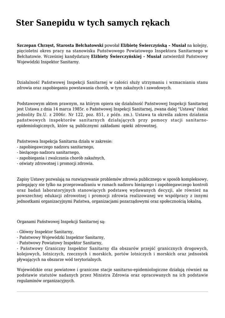 Ster Sanepidu w tych samych rękach Szczepan Chrzęst, Starosta Bełchatowski powołał Elżbietę Świerczyńską – Musiał na kolejny, pięcioletni okres pracy na stanowisku Państwowego Powiatowego Inspektora Sanitarnego w Bełchatowie. Wcześniej kandydaturę Elżbiety Świerczyńskiej - Musiał zatwierdził Państwowy Wojewódzki Inspektor Sanitarny. Działalność Państwowej Inspekcji Sanitarnej w całości służy utrzymaniu i wzmacnianiu stanu zdrowia oraz zapobieganiu powstawania chorób, w tym zakaźnych i zawodowych. Podstawowym aktem prawnym, na którym opiera się działalność Państwowej Inspekcji Sanitarnej jest Ustawa z dnia 14 marca 1985r. o Państwowej Inspekcji Sanitarnej, zwana dalej "Ustawą" (tekst jednolity Dz.U. z 2006r. Nr 122, poz. 851, z późn. zm.). Ustawa ta określa zakres działania państwowych inspektorów sanitarnych działających przy pomocy stacji sanitarnoepidemiologicznych, które są publicznymi zakładami opieki zdrowotnej. Państwowa Inspekcja Sanitarna działa w zakresie: - zapobiegawczego nadzoru sanitarnego, - bieżącego nadzoru sanitarnego, - zapobiegania i zwalczania chorób zakaźnych, - oświaty zdrowotnej i promocji zdrowia. Zapisy Ustawy pozwalają na rozwiązywanie problemów zdrowia publicznego w sposób kompleksowy, polegający nie tylko na przeprowadzaniu w ramach nadzoru bieżącego i zapobiegawczego kontroli oraz badań laboratoryjnych stanowiących podstawę wydawanych decyzji, ale również na powszechnej edukacji zdrowotnej i promocji zdrowia realizowanej we współpracy z innymi jednostkami organizacyjnymi Państwa, organizacjami pozarządowymi oraz społecznością lokalną. Organami Państwowej Inspekcji Sanitarnej są: - Główny Inspektor Sanitarny, - Państwowy Wojewódzki Inspektor Sanitarny, - Państwowy Powiatowy Inspektor Sanitarny, - Państwowy Graniczny Inspektor Sanitarny dla obszarów przejść granicznych drogowych, kolejowych, lotniczych, rzecznych i morskich, portów lotniczych i morskich oraz jednostek pływających na obszarze wód terytorialnych. Wojewódzkie oraz powiatowe i graniczne stacje sanitarno-epidemiologiczne działają również na podstawie statutów nadanych przez Ministra Zdrowia oraz opracowanych na ich podstawie regulaminów organizacyjnych. Krzysztof Borowski, rzecznik prasowy Starostwa Powiatowego w Bełchatowie