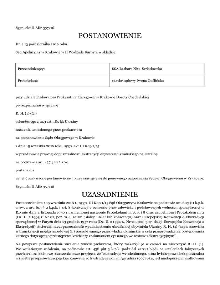 Sygn. akt II AKz 357/16 POSTANOWIENIE Dnia 13 października 2016 roku Sąd Apelacyjny w Krakowie w II Wydziale Karnym w składzie: Przewodniczący: SSA Barbara Nita-Światłowska Protokolant: st.sekr.sądowy Iwona Goślińska przy udziale Prokuratora Prokuratury Okręgowej w Krakowie Doroty Chechelskiej po rozpoznaniu w sprawie R. H. (1) (G.) oskarżonego z cz.3 art. 185 kk Ukrainy zażalenia wniesionego przez prokuratora na postanowienie Sądu Okręgowego w Krakowie z dnia 15 września 2016 roku, sygn. akt III Kop 1/15 w przedmiocie prawnej dopuszczalności ekstradycji obywatela ukraińskiego na Ukrainę na podstawie art. 437 § 1 i 2 kpk postanawia uchylić zaskarżone postanowienie i przekazać sprawę do ponownego rozpoznania Sądowi Okręgowemu w Krakowie. Sygn. akt II AKz 357/16 UZASADNIENIE Postanowieniem z 15 września 2016 r., sygn. III Kop 1/15 Sąd Okręgowy w Krakowie na podstawie art. 603 § 1 k.p.k. w zw. z art. 615 § 2 k.p.k. i art. 8 konwencji o ochronie praw człowieka i podstawowych wolności, sporządzonej w Rzymie dnia 4 listopada 1950 r., zmienionej następnie Protokołami nr 3, 5 i 8 oraz uzupełnionej Protokołem nr 2 (Dz. U. z 1993 r. Nr 61, poz. 284, ze zm.; dalej: EKPC lub konwencja) oraz Europejskiej Konwencji o Ekstradycji sporządzonej w Paryżu dnia 13 grudnia 1957 roku (Dz. U. z 1994 r., Nr 70, poz. 307; dalej: Europejska Konwencja o Ekstradycji) stwierdził niedopuszczalność wydania stronie ukraińskiej obywatela Ukrainy R. H. (1) (zapis nazwiska w transkrypcji międzynarodowej G.) poszukiwanego przez władze ukraińskie w celu przeprowadzenia postępowania karnego dotyczącego przestępstwa kradzieży z włamaniem opisanego we wniosku ekstradycyjnym”. Na powyższe postanowienie zażalenie wniósł prokurator, który zaskarżył je w całości na niekorzyść R. H. (1). We wniesionym zażaleniu, na podstawie art. 438 pkt 3 k.p.k. podniósł zarzut błędu w ustaleniach faktycznych przyjętych za podstawę orzeczenia przez przyjęcie, że “ekstradycja wymienionego, która byłaby prawnie dopuszczalna w świetle przepisów Europejskiej Konwencji o Ekstradycji z dnia 13 grudnia 1997 roku, jest niedopuszczalna albowiem stanowiłaby ingerencję w prawa podstawowe, nieproporcjonalną do zamierzonego celu, w postaci ochrony porządku i zapobiegania przestępstwom, a tym samym ograniczenie prawa do życia prywatnego i rodzinnego jest nieuzasadnione na podstawie art. 8 ust. 2 Europejskiej Konwencji o Ochronie Praw Człowieka i Podstawowych Wolności z dnia 4 listopada 1950 roku, co w przedmiotowej sprawie nie zachodzi”. W oparciu o wskazany zarzut prokurator wniósł o uchylenie zaskarżonego postanowienia i przekazanie sprawy Sądowi Okręgowemu w Krakowie do ponownego rozpoznania. Sąd Apelacyjny zważył, co następuje: Zażalenie wniesione przez prokuratora okazało się zasadne. Jak wskazano na wstępie, jako podstawę prawną analizowanego postanowienia Sąd Okręgowy w Krakowie wskazał art. 603 § 1 k.p.k. w zw. z art. 615 § 2 k.p.k. i art. 8 EKPC oraz Europejskiej Konwencji o Ekstradycji. Z uzasadnienia tego orzeczenia wynika, że Sąd I instancji w niniejszej sprawie nie stwierdził którejkolwiek z przeszkód ekstradycyjnych z Europejskiej Konwencji o Ekstradycji. Korzystne dla poszukiwanego orzeczenie w kwestii prawnej dopuszczalności jego wydania na Ukrainę zapadło ze względu na uznanie przez Sąd Okręgowy w Krakowie, iż w tym konkretnym wypadku ekstradycja pociągałaby za sobą naruszenie gwarancji wynikających z EKPC, a konkretnie art. 8 tej konwencji. Odnosząc się do fragmentu uzasadnienia zażalenia wniesionego przez prokuratora wskazującego na niekonsekwencję Sądu I instancji, który z jednej strony stwierdził, że analiza dopuszczalności wydania w niniejszej sprawie „powinna uwzględniać jedynie postanowienia Europejskiej Konwencji o Ekstradycji z dnia 13 grudnia 1957 r., z pominięciem przepisów k.p.k.”, a jednocześnie dopuszczalność ekstradycji poszukiwanego oceniał przez pryzmat art. 8 EKPC, według prokuratora legitymując to uregulowaniem wynikającym z art. 604 § 1 pkt 5 k.p.k., tut. Sąd stwierdza, co następuje. Sąd I instancji stwierdził, że w niniejszej sprawie „spełnione zostały warunki dopuszczalności przekazania określone w art. 2-10 wymienionej konwencji”, tj. żadna z podstaw odmowy wydania określone w Europejskiej Konwencji o Ekstradycji nie aktualizuje się, w konsekwencji czego uznał, iż „ekstradycja obywatela Ukrainy R. H. (1) byłaby prawnie dopuszczalna w świetle samych przepisów Europejskiej Konwencji o Ekstradycji”. Jednocześnie jednak przyjął, że przeszkoda włączająca prawną dopuszczalność ekstradycji R. H. (1) wynika z art. 8 ust. 1 konwencji o ochronie praw człowieka i podstawowych wolności, sporządzonej w Rzymie dnia 4 listopada 1950 r., zmienionej następnie Protokołami nr 3, 5 i 8 oraz uzupełnionej Protokołem nr 2 (Dz. U. z 1993 r. Nr 61, poz. 284, ze zm.; dalej: EKPC lub konwencja) poręczającego prawo do poszanowania życia prywatnego i rodzinnego; zdaniem Sądu I instancji ocena w niniejszej sprawie kwestii prawnej dopuszczalności wydania R. H. (1) na Ukrainę wymaga przeprowadzenia testu proporcjonalności (vide art. 8 ust. 2 EKPC) uwzględniającego interes ukraińskiego wymiaru sprawiedliwości w kontekście zapewnienia koniecznych środków dla ochrony porządku i zapobiegania przestępstwom oraz interesu poszukiwanego dotyczącego jego prawa do życia prywatnego i rodzinnego. W konkluzji zaś przyjął, że przeprowadzony test proporcjonalności prowadzi tu do stwierdzenia prawnej niedopuszczalności wydania. Z powyższym twierdzeniem w uzasadnieniu wniesionego zażalenia polemikę podjął prokurator podkreślając po pierwsze „brak konsekwencji Sądu w określaniu, a następnie badaniu podstaw do odmowy wydania poszukiwanego”; Sąd I instancji stwierdził kategorycznie, że podstawę oceny kwestii prawnej dopuszczalności przekazan
