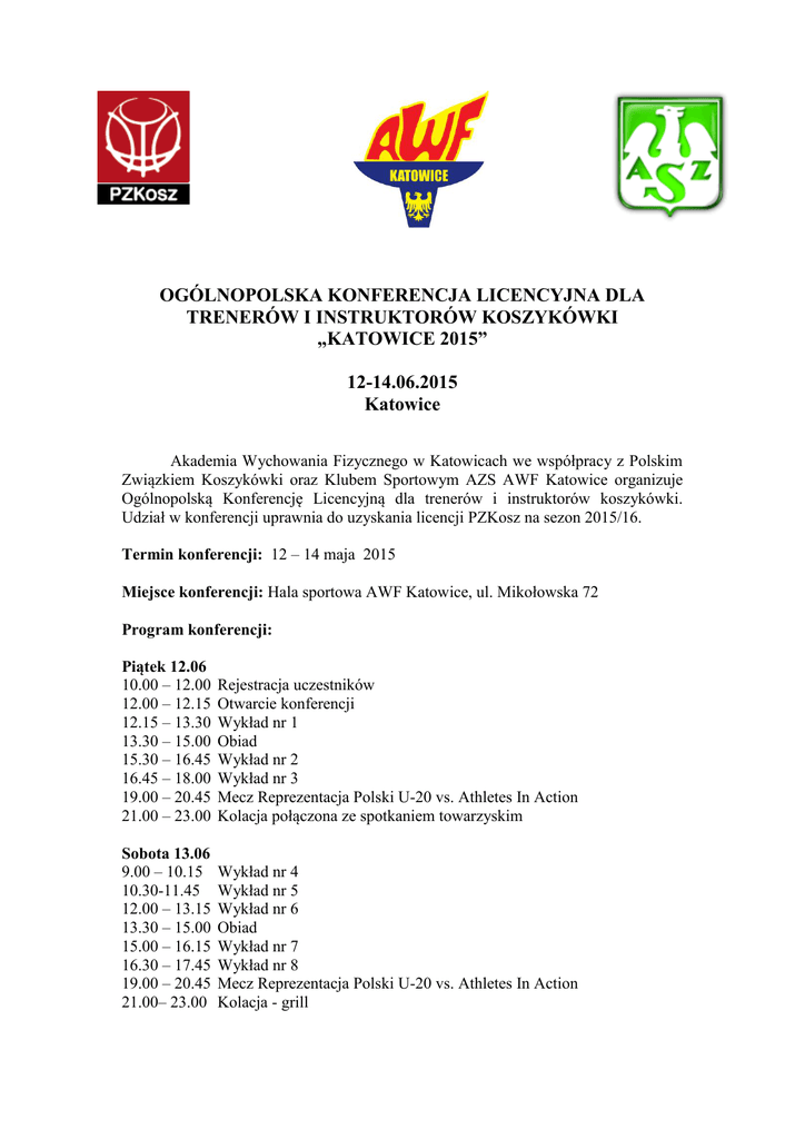 OGÓLNOPOLSKA KONFERENCJA LICENCYJNA DLA TRENERÓW I INSTRUKTORÓW KOSZYKÓWKI „KATOWICE 2015” 12-14.06.2015 Katowice Akademia Wychowania Fizycznego w Katowicach we współpracy z Polskim Związkiem Koszykówki oraz Klubem Sportowym AZS AWF Katowice organizuje Ogólnopolską Konferencję Licencyjną dla trenerów i instruktorów koszykówki. Udział w konferencji uprawnia do uzyskania licencji PZKosz na sezon 2015/16. Termin konferencji: 12 – 14 maja 2015 Miejsce konferencji: Hala sportowa AWF Katowice, ul. Mikołowska 72 Program konferencji: Piątek 12.06 10.00 – 12.00 12.00 – 12.15 12.15 – 13.30 13.30 – 15.00 15.30 – 16.45 16.45 – 18.00 19.00 – 20.45 21.00 – 23.00 Rejestracja uczestników Otwarcie konferencji Wykład nr 1 Obiad Wykład nr 2 Wykład nr 3 Mecz Reprezentacja Polski U-20 vs. Athletes In Action Kolacja połączona ze spotkaniem towarzyskim Sobota 13.06 9.00 – 10.15 10.30-11.45 12.00 – 13.15 13.30 – 15.00 15.00 – 16.15 16.30 – 17.45 19.00 – 20.45 21.00– 23.00 Wykład nr 4 Wykład nr 5 Wykład nr 6 Obiad Wykład nr 7 Wykład nr 8 Mecz Reprezentacja Polski U-20 vs. Athletes In Action Kolacja - grill Niedziela 14.06 9.30 - 10.45 Wykład nr 9 11.00 – 12.15 Wykład nr 10 12.30 – 12.45 Zakończenie konferencji i rozdanie certyfikatów Koszt udziału w konferencji: Wariant A 600,00 zł (po 29 maja 650,00 zł) Uczestnictwo + dwa noclegi + pełne wyżywienie (nocleg ze śniadaniem w hotelu Diament, obiady i kolacje na kampusie AWF) Wariant B 400,00 zł (po 29 maja 450,00 zł) Uczestnictwo + 2 obiady i 2 kolacje (obiady i kolacje na kampusie AWF) Wariant C 300,00 zł (po 29 maja 35,00 zł) Uczestnictwo Opłata konferencyjna uprawnia do: udziału w wykładach, meczach Reprezentacji Polski U-20 vs. Athletes In Action, otrzymania certyfikatu, pakietu trenerskiego i dostępu do materiału video z konferencji na serwerze. UWAGA!!!! Szczegółowe informacje na stronie: www.konfkosz.awf.katowice.pl Zgłoszenia: wyłącznie drogą elektroniczną na formularzu zamieszczonym na stronie www.konfkosz.awf.katowice.pl Kontakt w sprawie konferencji: Biuro KS AZS AWF Katowice – [email protected] , tel. 032 207 51 81, Zakład Koszykówki AWF Katowice tel. 032 207 51 97, 032 207 52 36