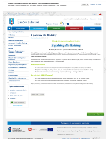 Używamy ciasteczek (pliki Cookies), aby zwiększyć Twoją wygodę korzystania z serwisu Zamknij Korzystając z tej strony zezwalasz nam na używanie ciasteczek zgodnie z ustawieniami Twojej przeglądarki. Wersja dla osób słabowidzących Dowiedz się więcej Wersja tekstowa English piątek, 15 maj 2015, Imieniny: Zofii, Nadziei, Berty Pogoda w Janowie Urząd Miejski Dla mieszkańców 17° 4° Dla turystów Mapa strony Szukaj na stronie Kontakt Szukaj Dla inwestorów Kontakt 2 godziny dla Rodziny O Gminie 2 godziny dla Rodziny Władze Dla mieszkańców 2015.05.15 Imprezy i wydarzenia 15 maja Międzynarodowy Dzień Rodziny Janowski Ośrodek Kultury Gazeta Janowska Media Budujemy tożsamość i system wartości młodego pokolenia Muzeum Regionalne w Janowie Lubelskim Instytucje Miejski Ośrodek Sportu i Rekreacji Kluby Sportowe Organizacje pozarządowe Z okazji Międzynarodowego Dnia Rodziny przypadającego na 15 maja, a ustanowionego w 1993 roku przez Zgromadzenie Ogólne ONZ, Fundacja Humanites-Sztuka Wychowania zaprasza przedsiębiorców i ich pracowników do wzięcia udziału w akcji „Dwie Godziny dla Rodziny". Akcja ma na celu umożliwienie pracownikom spędzenie w tym dniu dwóch dodatkowych godzin z bliskimi, dzięki pracodawcom, którzy skrócą o te dwie godziny dzień pracy w swoich firmach. Rodzina jest ważna! Klub Seniora "Janowiacy" To tu budujemy podstawowe umiejętności społeczne niezbędne w naszym życiu i uczymy się wartości Oświata Tutaj dzieci dowiadują się jak być mamą, tatą, jak pomagać sobie nawzajem i jak budować zdrowe relacje Rodzina to kuźnia naszego najcenniejszego kapitału społecznego – młodego pokolenia Zdrowie Komunikacja Czym jest dla CIEBIE Rodzina? Miejska Sieć Internetowa Być może to wspólne radości jak niedzielny obiad, święta, bezpieczny dom, ale też wspólne smutki. Janowskie www Być może to dobrze funkcjonujące przedsiębiorstwo, zabiegani domownicy, ciągły brak czasu? Więcej informacji pod adresem meilowym: http://mamrodzine.pl/strefa-rodzicow/wydarzenia/2-godziny-dla-rodziny Ogłoszenia drobne sprzedam mieszkanie 48m2 » SPRZEDAM » Wersja PDF Drukuj Sucha karma dla psa » sprzedam » Dodaj ogłoszenie Więcej ogłoszeń » Mapa strony Zgłoś błąd Projekt współfinansowany ze Środków Europejskiego Funduszu Rozwoju Regionalnego w ramach Regionalnego Programu Operacyjnego Województwa Lubelskiego na lata 2007-2013. 2012 © Urząd Miejski w Janowie Lubelskim ul. J. Zamoyskiego 59 Godziny pracy Konto bankowe Polityka prywatności 23-300 Janów Lubelski, [email protected]