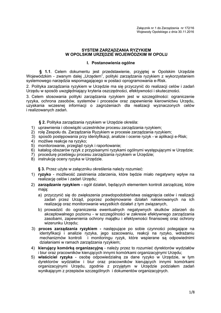 Załącznik nr 1 do Zarządzenia nr 172/16 Wojewody Opolskiego z dnia 30.11.2016 SYSTEM ZARZĄDZANIA RYZYKIEM W OPOLSKIM URZĘDZIE WOJEWÓDZKIM W OPOLU I. Postanowienia ogólne § 1.1. Celem dokumentu jest przedstawienie, przyjętej w Opolskim Urzędzie Wojewódzkim - zwanym dalej „Urzędem”, polityki zarządzania ryzykiem z wykorzystaniem systemowego narzędzia wspomagającego w postaci oprogramowania e-Risk. 2. Polityka zarządzania ryzykiem w Urzędzie ma się przyczynić do realizacji celów i zadań Urzędu w sposób uwzględniający kryteria oszczędności, efektywności i skuteczności. 3. Celem stosowania polityki zarządzania ryzykiem jest w szczególności: ograniczenie ryzyka, ochrona zasobów, systemów i procesów oraz zapewnienie kierownictwu Urzędu, uzyskania wczesnej informacji o zagrożeniach dla realizacji wyznaczonych celów i realizowanych zadań. 1) 2) 3) 4) 5) 6) 7) 8) 1) 2) 3) 4) 5) § 2. Polityka zarządzania ryzykiem w Urzędzie określa: uprawnienia i obowiązki uczestników procesu zarządzania ryzykiem; rolę Zespołu ds. Zarządzania Ryzykiem w procesie zarządzania ryzykiem; sposób postępowania przy identyfikacji, analizie i ocenie ryzyk - w aplikacji e-Risk; możliwe reakcje na ryzyko; monitorowanie, przegląd ryzyk i raportowanie; katalog obszarów ryzyk z przypisanymi ryzykami ogólnymi występującymi w Urzędzie; procedurę przebiegu procesu zarządzania ryzykiem w Urzędzie; instrukcję oceny ryzyka w Urzędzie. § 3. Przez użyte w załączniku określenia należy rozumieć: ryzyko - możliwość zaistnienia zdarzenia, które będzie miało negatywny wpływ na realizację celów i zadań Urzędu; zarządzanie ryzykiem - ogół działań, będących elementem kontroli zarządczej, które mają: a) przyczynić się do zwiększenia prawdopodobieństwa osiągnięcia celów i realizacji zadań przez Urząd, poprzez podejmowanie działań nakierowanych na ich realizację oraz monitorowanie wszystkich działań z tym związanych, b) prowadzić do ograniczenia ewentualnych negatywnych skutków zdarzeń do akceptowalnego poziomu - w szczególności w zakresie efektywnego zarządzania zasobami, zapewnienia ochrony majątku i efektywności finansowej oraz ochrony wizerunku Urzędu; proces zarządzania ryzykiem - następujące po sobie czynności polegające na identyfikacji i analizie ryzyka, jego szacowaniu, reakcji na ryzyko, wdrażaniu mechanizmów kontroli i monitoringu ryzyk, które wspierane są odpowiednimi działaniami w ramach zarządzania ryzykiem; kierujący komórką organizacyjną - należy przez to rozumieć dyrektorów wydziałów i biur oraz pracowników kierujących innymi komórkami organizacyjnymi Urzędu; właściciel ryzyka - osobę odpowiedzialną za dane ryzyko w Urzędzie, w tym dyrektorów wydziałów i biur oraz pracowników kierujących innymi komórkami organizacyjnymi Urzędu, zgodnie z przyjętym w Urzędzie podziałem zadań wynikającym z przepisów szczególnych i dokumentów organizacyjnych. 1/8 II. Uprawnienia i obowiązki uczestników procesu zarządzania ryzykiem § 4. Wojewoda Opolski jako kierownik jednostki zobowiązuje podległą kadrę kierowniczą oraz pracowników Urzędu do realizacji zarządzania ryzykiem, zgodnie z ustaloną polityką zarządzania ryzykiem. § 5. Zespół Audytu Wewnętrznego odpowiada za koordynację i monitorowanie systemu zarządzania ryzykiem, z działaniami pozostałych uczestników procesu zarządzania ryzykiem w Urzędzie, w tym za: 1) dokonywanie przeglądu sposobu, w jaki kierujący komórkami organizacyjnymi identyfikują i zarządzają ryzykiem; 2) dokonywanie przeglądu działań podejmowanych w związku z występującym ryzykiem i występowania, w toku tych działań, do kierujących komórkami organizacyjnymi z pytaniami i prośbami o wyjaśnienie kwestii budzących wątpliwości; 3) bieżącą ocenę działań podejmowanych przez kierujących komórkami organizacyjnymi z wymaganiami wynikającymi z niniejszego zarządzenia; 4) wykonywanie doradztwa dla kierujących komórkami organizacyjnymi z obszaru zarządzania ryzykiem. § 6. 1. Kierujący komórkami organizacyjnymi Urzędu zobowiązani są do zarządzania ryzykiem na poziomie operacyjnym, w ramach powierzonych im zadań. 2. Kierujący komórkami organizacyjnymi mają obowiązek zapewnienia podległym pracownikom możliwości formalnego zgłaszania zmian w zakresie zidentyfikowanych ryzyk lub innych istotnych problemów. 3. Kierujący komórkami organizacyjnymi, w przypadku wystąpienia ryzyka o najwyższym poziomie istotności (nieakceptowanego) mają obowiązek wprowadzenia dodatkowych mechanizmów kontrolnych zmierzających do redukcji ryzyka lub przeniesienia go do średniego poziomu istotności oraz wyznaczenia pracowników odpowiedzialnych za ich wdrożenie i określenia planowanego terminu wdrożenia proponowanego mechanizmu kontrolnego. Wprowadzone do aplikacji ryzyka o najwyższym poziomie istotności zostają wyświetlone w module „Monity" - oznaczonym kolorem czerwonym. 4. Kierujący komórkami organizacyjnymi, w przypadku wystąpienia ryzyka o średnim poziomie istotności (akceptowanego warunkowo) podejmują decyzję co do wprowadzenia dodatkowych mechanizmów kontrolnych polegających na podjęcia działań zmierzających do redukcji ryzyka, likwidacji ryzyka lub przeniesieniu ryzyka do niskiego poziomu istotności. Obowiązkowo są zobowiązani do bieżącego monitorowania zidentyfikowanego ryzyka. 5. Kierujący komórkami organizacyjnymi, w przypadku wystąpienia ryzyka o najniższym poziomie istotności (możliwego do zaakceptowania) podejmują decyzję o jego tolerancji na tym poziomie i bieżącego monitorowania. § 7.1. Pracownicy Urzędu zobowiązani są do zgłaszania swoim przełożonym informacji o zdarzeniach, które mogą doprowadzić do negatywnych skutków w działalności Urzędu, w tym o potencjalnych nowych ryzykach bądź problemach mogących mieć wpływ na powstanie nowych ryzyk lub pozio