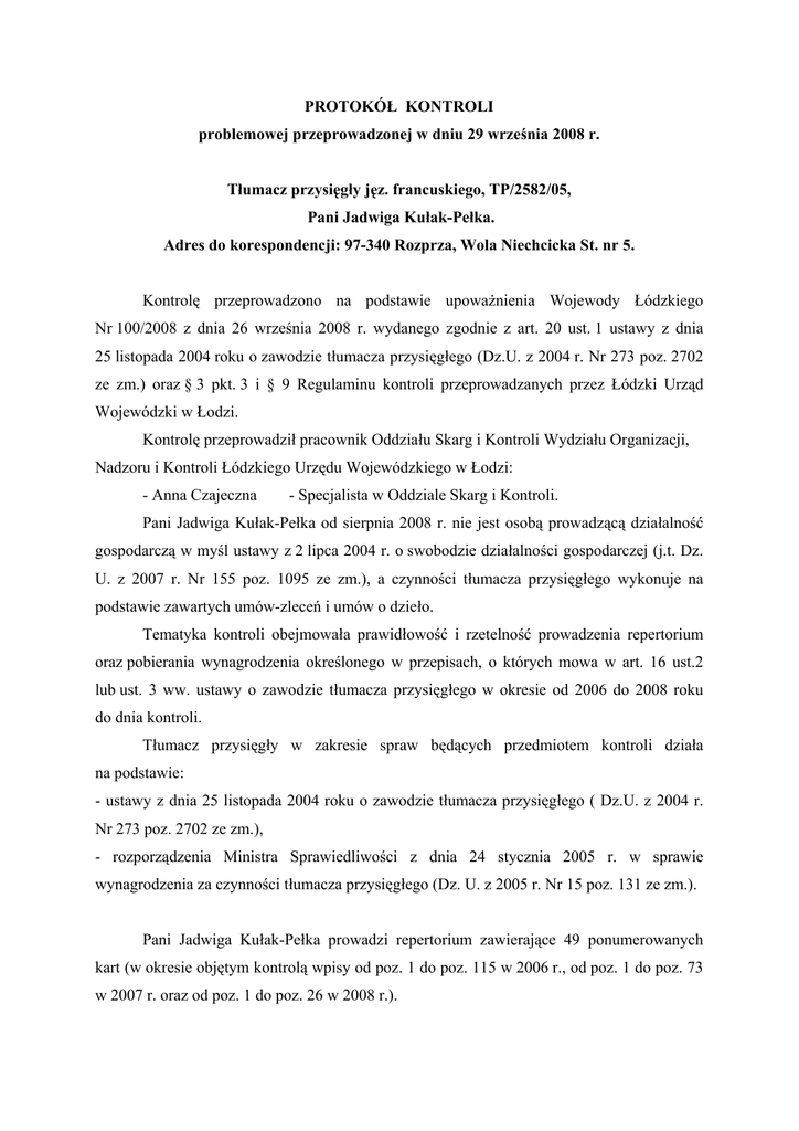 PROTOKÓŁ KONTROLI problemowej przeprowadzonej w dniu 29 września 2008 r. Tłumacz przysięgły jęz. francuskiego, TP/2582/05, Pani Jadwiga Kułak-Pełka. Adres do korespondencji: 97-340 Rozprza, Wola Niechcicka St. nr 5. Kontrolę przeprowadzono na podstawie upoważnienia Wojewody Łódzkiego Nr 100/2008 z dnia 26 września 2008 r. wydanego zgodnie z art. 20 ust. 1 ustawy z dnia 25 listopada 2004 roku o zawodzie tłumacza przysięgłego (Dz.U. z 2004 r. Nr 273 poz. 2702 ze zm.) oraz § 3 pkt. 3 i § 9 Regulaminu kontroli przeprowadzanych przez Łódzki Urząd Wojewódzki w Łodzi. Kontrolę przeprowadził pracownik Oddziału Skarg i Kontroli Wydziału Organizacji, Nadzoru i Kontroli Łódzkiego Urzędu Wojewódzkiego w Łodzi: - Anna Czajeczna - Specjalista w Oddziale Skarg i Kontroli. Pani Jadwiga Kułak-Pełka od sierpnia 2008 r. nie jest osobą prowadzącą działalność gospodarczą w myśl ustawy z 2 lipca 2004 r. o swobodzie działalności gospodarczej (j.t. Dz. U. z 2007 r. Nr 155 poz. 1095 ze zm.), a czynności tłumacza przysięgłego wykonuje na podstawie zawartych umów-zleceń i umów o dzieło. Tematyka kontroli obejmowała prawidłowość i rzetelność prowadzenia repertorium oraz pobierania wynagrodzenia określonego w przepisach, o których mowa w art. 16 ust.2 lub ust. 3 ww. ustawy o zawodzie tłumacza przysięgłego w okresie od 2006 do 2008 roku do dnia kontroli. Tłumacz przysięgły w zakresie spraw będących przedmiotem kontroli działa na podstawie: - ustawy z dnia 25 listopada 2004 roku o zawodzie tłumacza przysięgłego ( Dz.U. z 2004 r. Nr 273 poz. 2702 ze zm.), - rozporządzenia Ministra Sprawiedliwości z dnia 24 stycznia 2005 r. w sprawie wynagrodzenia za czynności tłumacza przysięgłego (Dz. U. z 2005 r. Nr 15 poz. 131 ze zm.). Pani Jadwiga Kułak-Pełka prowadzi repertorium zawierające 49 ponumerowanych kart (w okresie objętym kontrolą wpisy od poz. 1 do poz. 115 w 2006 r., od poz. 1 do poz. 73 w 2007 r. oraz od poz. 1 do poz. 26 w 2008 r.). W repertorium numeracja jest prowadzona odrębnie dla każdego roku. Z ogólnego oglądu ksiąg repertorium wynika, że: − w poz. od 6/2007 – 10/2007 i 46/2007 nie zapisano liczby stron tłumaczenia lub odpisu i liczby sporządzonych egzemplarzy, − w poz. 5/2006, 44/2006 i 110/2006 nie zapisano wysokości pobranego wynagrodzenia. W toku kontroli zbadano poz. 1/2006, 5/2006, 106/2006, 110/2006, 6/2007, 10/2007, 46/2007 i 26/2008. Nie stwierdzono wykonywania czynności tłumacza przysięgłego dla zleceniodawców wymienionych w art. 15 ustawy o zawodzie tłumacza przysięgłego. W zakresie czynności tłumacza przysięgłego dla zleceniodawcy innego niż wymienieni w art. 15 ustawy o zawodzie tłumacza przysięgłego stwierdzono: − w poz. 1 z dnia 02.01.2006 r. język, w którym dokument sporządzono: „j. franc.”, oznaczenie czynności: „tłumaczenie potwierdzone na j. polski”, 1,5 strony, 1 egz., − w poz. 5 z dnia 30.01.06 r. język, w którym dokument sporządzono: „j. franc.”, oznaczenie czynności: „tłumaczenie potwierdzone na j. polski”, 1 strona, 1 egz., wysokość pobranego wynagrodzenia: nie zapisano, − w poz. 106 z dnia 26.11.2006 r. język, w którym dokument sporządzono: „j. pl”, oznaczenie czynności: „zaśw. tłum. na j. franc. (potwierdzone)”, 1 strona, 1 egz., − w poz. 110 z dnia 07. 12.06 r. język, w którym dokument sporządzono: „j. franc., nider., niem.”, oznaczenie czynności: „tłum. potw. na j. polski”, 1 strona, 1 egz., wysokość pobranego wynagrodzenia: nie zapisano, − w poz. 6 z dnia 05.01.07 r. język, w którym dokument sporządzono: „j. fr., niem., nider.”, oznaczenie czynności: „tłum. potw. na j. pl”, liczba stron tłumaczenia lub odpisu: nie zapisano, liczba sporządzonych egzemplarzy: nie zapisano, − w poz. 10 z dnia 15.01.07 r. język, w którym dokument sporządzono: „j. fr., nider., niem.”, oznaczenie czynności: „tł. potw. na j. pl.”, liczba stron tłumaczenia lub odpisu: nie zapisano, liczba sporządzonych egzemplarzy: nie zapisano, − w poz. 46 z dnia 23.07.07 r. język, w którym dokument sporządzono: „j. fr.”, oznaczenie czynności: „tł. potw. na j. pl”, liczba stron tłumaczenia lub odpisu: nie zapisano, liczba sporządzonych egzemplarzy: nie zapisano, − w poz. 26 z dnia 31.05.08 r. język, w którym dokument sporządzono: „j. franc.”, oznaczenie czynności: „tłum. potw. na j. polski”, 1,5 strony, 1 egz. Odnośnie do poz. 110/2006, 6/2007 i 10/2007 tłumacz przysięgły ustnie wyjaśniła, że istotnie każdy z ww. dokumentów sporządzony był w trzech językach, tj. francuskim, niderlandzkim i niemieckim. Tłumaczenie przysięgłe wykonane zostało w zakresie posiadanych uprawnień: tłumaczenie z języka francuskiego na język polski; na poświadczonym tłumaczeniu zawarta została wzmianka o tekście w pozostałych dwóch językach. Pani Jadwiga Kułak-Pełka w toku kontroli poinformowała, że na poświadczonych tłumaczeniach, które wydaje tłumacz przysięgły, wymieniona jest pozycja, pod którą tłumaczenie jest odnotowane w repertorium oraz zawarte stwierdzenie: − w przypadku tłumaczenia z oryginału: „Potwierdzam zgodność tłumaczenia z przedłożonym oryginałem w jęz. ...”, − w przypadku tłumaczenia z kopią potwierdzoną : „Potwierdzam zgodność tłumaczenia z kopii potwierdzonej”, bez informacji, przez kogo kopia jest poświadczona. Pani Jadwiga Kułak-Pełka poinformowała również, że od IV kwartału 2005 r. używa pieczęci zgodnej z wymogami art. 18 ust. 1 ustawy o zawodzie tłumacza przysięgłego. Odcisk tej pieczęci i wzór podpisu tłumacza przysięgłego zostały złożone Wojewodzie Łódzkiemu w dniu 29 września 2008 r. Dawna pieczęć została zwrócona do Sądu Okręgowego w Piotrkowie Trybunalskim w dniu 11 października 2006 r. Integralną część protokołu kontroli stanowią załączniki – kserokopie kart repertorium 