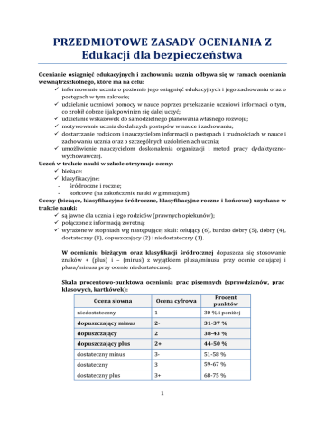 PRZEDMIOTOWE ZASADY OCENIANIA Z Edukacji dla bezpieczeństwa Ocenianie osiągnięć edukacyjnych i zachowania ucznia odbywa się w ramach oceniania wewnątrzszkolnego, które ma na celu: informowanie ucznia o poziomie jego osiągnięć edukacyjnych i jego zachowaniu oraz o postępach w tym zakresie; udzielanie uczniowi pomocy w nauce poprzez przekazanie uczniowi informacji o tym, co zrobił dobrze i jak powinien się dalej uczyć; udzielanie wskazówek do samodzielnego planowania własnego rozwoju; motywowanie ucznia do dalszych postępów w nauce i zachowaniu; dostarczanie rodzicom i nauczycielom informacji o postępach i trudnościach w nauce i zachowaniu ucznia oraz o szczególnych uzdolnieniach ucznia; umożliwienie nauczycielom doskonalenia organizacji i metod pracy dydaktycznowychowawczej. Uczeń w trakcie nauki w szkole otrzymuje oceny: bieżące; klasyfikacyjne: śródroczne i roczne; końcowe (na zakończenie nauki w gimnazjum). Oceny (bieżące, klasyfikacyjne śródroczne, klasyfikacyjne roczne i końcowe) uzyskane w trakcie nauki: są jawne dla ucznia i jego rodziców (prawnych opiekunów); połączone z informacją zwrotną; wyrażone w stopniach wg następującej skali: celujący (6), bardzo dobry (5), dobry (4), dostateczny (3), dopuszczający (2) i niedostateczny (1). W ocenianiu bieżącym oraz klasyfikacji śródrocznej dopuszcza się stosowanie znaków + (plus) i – (minus) z wyjątkiem plusa/minusa przy ocenie celującej i plusa/minusa przy ocenie niedostatecznej. Skala procentowo-punktowa oceniania prac pisemnych (sprawdzianów, prac klasowych, kartkówek): Procent Ocena słowna Ocena cyfrowa punktów niedostateczny 1 30 % i poniżej dopuszczający minus 2- 31-37 % dopuszczający 2 38-43 % dopuszczający plus 2+ 44-50 % dostateczny minus 3- 51-58 % dostateczny 3 59-67 % dostateczny plus 3+ 68-75 % 1 dobry minus 4- 76-80 % dobry 4 81-85 % dobry plus 4+ 86-90 % bardzo dobry minus 5- 91-93 % bardzo dobry 5 94-97 % bardzo dobry plus 5+ 98-100 % celujący 6 powyżej 100% Ocenę celującą z pracy klasowej otrzymuje uczeń, który uzyskał co najmniej ocenę bardzo dobrą i rozwiązał/wykonał dodatkowe zadania na ocenę celującą. W klasach w których edukacja dla bezpieczeństwa realizowana jest 1 godz./tyg., ocenę śródroczną i roczną wystawiamy z co najmniej 4 ocen cząstkowych w semestrze (w tym minimum 1 ocena z pracy klasowej). W przypadku ucznia objętego nauczaniem indywidualnym dopuszcza się mniejszą liczbę ocen cząstkowych. Ocena semestralna nie jest średnią arytmetyczną ocen cząstkowych. Ocena klasyfikacyjna końcoworoczna wystawiana jest w oparciu o obie oceny semestralne. Uczeń może poprawiać każdą ocenę ze sprawdzianu lub pracy klasowej. Przy 1 godzinie edukacji dla bezpieczeństwa w tygodniu uczeń może wybrać 1 dowolną ocenę i poprawiać ją w trakcie trwania semestru w ciągu 2 tygodni od jej otrzymania po ustaleniu z nauczycielem terminu, formy poprawy i rodzaju oceny. Każdą ocenę z poprawy wpisuje się do dziennika papierowego i elektronicznego. Uczeń poprawia daną ocenę tylko raz. Systematycznej, planowej kontroli i ocenianiu podlegają wszystkie formy aktywności uczniów: wypowiedzi, czynności zlecane przez nauczyciela, Wytwory pracy - albumy, gazetki, ilustracje, makiety, schematy, wykresy, katalogi itp., Odpowiedzi, zadania domowe, ćwiczenia pisemne, ćwiczenia opatrywania ran, resuscytacji i układania poszkodowanego w pozycji bezpiecznej ustalonej, Sprawdziany, testy, kartkówki, konkursy, olimpiady i turnieje Aktywność na zajęciach (patriotyczna postawa, znajomość bieżących wydarzeń związanych z bezpieczeństwem, politycznych i społecznych, poprawność działania, logika w argumentacji, oryginalność i przydatność proponowanych rozwiązań), 2 Zachowanie w trakcie zajęć – obserwacja uczestnicząca (głównie w sferze postaw). Uczeń może być oceniony za: odpowiedź ustną Wiadomości sprawdzane podczas odpowiedzi ustnych obejmują materiał z trzech ostatnich lekcji. Krótkie wypowiedzi ustne lub dużą aktywność w czasie lekcji nauczyciel zaznacza znakiem plus (+). Przy 1 godz. przedmiotu w tygodniu 3 plusy są równoznaczne z oceną bardzo dobrą. Za brak pracy na lekcji lub brak pracy domowej uczeń otrzymuje minus (-). Przy 1 godz. przedmiotu w tygodniu 3 minusy są równoznaczne z oceną niedostateczną. Przy 1 godz. przedmiotu w tygodniu uczeń może być w semestrze 1 raz nieprzygotowany do lekcji, jednak musi to zgłosić na początku zajęć. „Nieprzygotowanie do lekcji” oznacza nieprzyswojenie wiadomości z trzech ostatnich zajęć lekcyjnych lub brak pracy domowej. Nauczyciel odnotowuje ten fakt w swoim terminarzu, nie ma to jednak wpływu na ocenę końcową. Niezgłoszone przed lekcją nieprzygotowanie ucznia pociąga za sobą wpisanie oceny niedostatecznej. W przypadku posiadania używanego podręcznika uczeń zobowiązany jest do wykorektorowania lub wytarcia ołówka w uzupełnionych fragmentach podręcznika. Szczęśliwy numerek zwalnia tylko z odpowiedzi ustnej, natomiast nie zwalnia z odpowiedzi ustnej na lekcji powtórzeniowej i zapowiedzianej pracy pisemnej. Prawo do ulg w pytaniu zostaje zawieszone na miesiąc przed radą klasyfikacyjną (szczęśliwe numerki, nieprzygotowania). odpowiedź pisemną: prace klasowe; kartkówki. Prace klasowe są zapowiadane co najmniej tydzień wcześniej. Jednocześnie jest omówiony ich zakres i kryteria wymagań. Powinna być poprzedzona powtórzeniem i podaniem wymagań edukacyjnych. Termin oddania prac pisemnych nie może przekroczyć trzech tygodni. Jednego dnia może odbywać się jedna praca klasowa, a w tygodniu maksymalnie trzy. Kartkówka, trwająca nie dłużej niż 15 minut, nie musi być zapowiadana. Nie zapowiadana kartkówka obejmuje materiał z trzech ostatnich lekcji. 3 Prace pisemne są obowiązkowe. Uczeń nieobecny na pracy pisemnej uzgadnia z nauczycielem termin i sposób jej zaliczenia. W przypadku niezgłoszeni